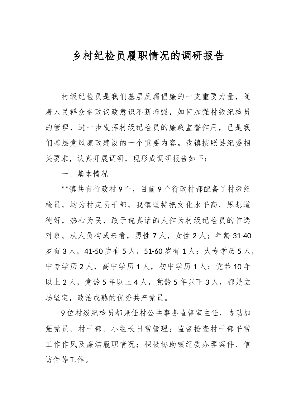 乡村纪检员履职情况的调研报告村级纪检员是我们基层反腐倡廉的一支重要力量,随着人民群众参政议政意识不断增强,如何加强村级纪检员的管理,进一步发挥村级纪检员的廉政监督作用,已是我们基层党风廉政建设的一个重要内容。我镇按照县纪委相关要求,认真开展调研,现形成调研报告如下:一、基本情况**镇共有行政村9个,目前9个行政村都配备了村级纪检员,均为村定员干部,我镇坚持把文化水平高,思想道德好,热心为民,敢于说真话的人作为村级纪检员的首选对象。从人员构成来看,男性7人,女性2人;年龄31-40岁有3人,41-50岁有5人,51-60岁有1人;大专学历5人,中专学历2人,高中学历1人,初中学历1人;党龄10年以上2人,党龄5年以上4人,党龄5年以下3人,都是立场坚定,政治成熟的优秀共产党员。9位村级纪检员都兼任村公共事务监督室主任,协助加强党员、村干部、小组长日常管理;监督检查村干部平常工作作风及廉洁履职情况;积极协助镇纪委办理案件、信访件等工作。二、存在的困难和不足随着物质生活的日益丰富,村级党风廉政建设也遭受到了前所未有的挑战,各类冲击基层党风廉政建设的现象和行为层出不穷。从群众来访举报和镇纪检监察机关查处的案件来看,主要集中表现在两委换届选举中产生有能力不出力无能力家族势力大的人员当选;挪用公款的问题;村务不公开;村干部私自决定出卖或租赁集体资产;暗箱操作、擅自变更合同;各项建设中偿各项赔偿纠纷等损害群众利益的问题;办事不公等问题。这给村级纪检员的工作带来很大压力,同时村级纪检员因素质参差不齐。(一)认识不到位。片面认为农村基层经济不发达,主观上认为党风廉政建设工作可紧可松,可有可无,表现为贯彻责任制的积极性不高,导致部分村级纪检员不参与或不主动监督村两委工作。(二)宣教不到位。平时由于各项基层工作纷繁复杂许多廉政教育开展不够深入。村级干部的生活待遇低,教育、管理难度大,乡镇对村级干部存在重用轻教、重用轻管的现象。一些村开展党风廉政建设教育的形式单一,抓先进典型示范教育和反面典型的警示教育不够,使党风廉政教育没有发挥应有的效果。(三)执行不到位。有些制度在执行中缺少定期和比较规范的检查、考核;在执行中大打折扣形同虚设。在责任追究上,乡镇纪检检察等监督主体的监督作用没有很好发挥,或多或少存在畏难思想,对责任范围内村干部身上存在的问题不愿指出,导致党内监督制度执行不够有力。三、工作的建议及改进方向(一)常态化培训保障履职有“能”。一是制定村级纪检委员学习培训制度。列出学习培训清单,采取专题讲座、警示教育、以会代训等多种方式,紧紧围绕党性修养思想作风、业务技能等方面,对纪检员有计划开展培训,持续提升他们的政治素质、履职能力和工作水平。二是明确村级纪检员的主要职责。即:协助党支部抓好党风廉政建设工作;协助抓好党务、村务公开;对村级项目建设、资金使用、资金管理计划生育指标、土地使用、扶贫、救灾救助以及医疗卫生中小学教育、基础建设、各种补贴等党的各项支农惠农政策的落实情况进行监督。(二)制定清单保障履职有“效”。一是制定详细清单。逐条列出村级纪检委员履行落实决策部署、廉政宣传教育、收集和报告信息、日常监督检查、协助案件调查等5项职责,赋予村纪检委员知情权、参与议事权、民主监督权、建议权等相关权限,以清单形式为村级纪检委员履职“干什么”提供了清晰的指南。二是要求强化沟通。建立村级纪检员向镇纪委定期报告重要事项及时报告制度,形成科学化、规范化的内部管理机制。(三)量化考核保障履职有“为”。一是加强管理。为解决“干好干差一个样”问题,制定村级纪检委员考核办法,对能力强、素质高、工作突出的,作为村“两委”主要负责人后备干部重点培养,对发挥作用不力、群众认可度不高的纪检委员及时进行调整。二要实行奖惩。严格制定考核奖惩措施,探索并完善激励考核机制,通过评先、评优执行工作津贴与绩效挂钩制度,激发村级纪检委员履职的积极性、主动性,切实发挥“前哨”作用,有效预防和减少村级“微腐败”。把案件、执法、监察、党纪教育、廉政建设责任制等任务尽可能地量化,...