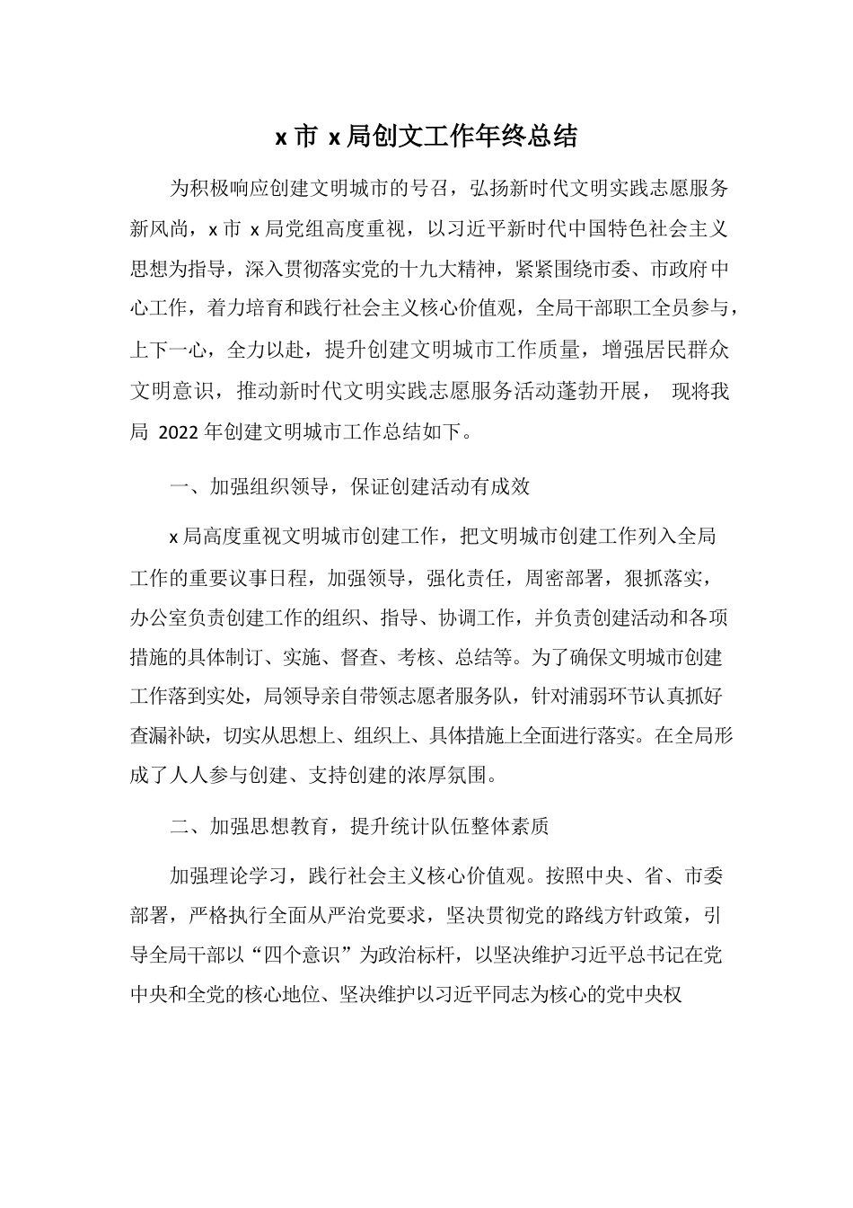 x市x局创文工作年终总结为积极响应创建文明城市的号召,弘扬新时代文明实践志愿服务新风尚,x市x局党组高度重视,以习近平新时代中国特色社会主义思想为指导,深入贯彻落实党的十九大精神,紧紧围绕市委、市政府中心工作,着力培育和践行社会主义核心价值观,全局干部职工全员参与,上下一心,全力以赴,提升创建文明城市工作质量,增强居民群众文明意识,推动新时代文明实践志愿服务活动蓬勃开展,现将我局2022年创建文明城市工作总结如下。一、加强组织领导,保证创建活动有成效x局高度重视文明城市创建工作,把文明城市创建工作列入全局工作的重要议事日程,加强领导,强化责任,周密部署,狠抓落实,办公室负责创建工作的组织、指导、协调工作,并负责创建活动和各项措施的具体制订、实施、督查、考核、总结等。为了确保文明城市创建工作落到实处,局领导亲自带领志愿者服务队,针对浦弱环节认真抓好查漏补缺,切实从思想上、组织上、具体措施上全面进行落实。在全局形成了人人参与创建、支持创建的浓厚氛围。二、加强思想教育,提升统计队伍整体素质加强理论学习,践行社会主义核心价值观。按照中央、省、市委部署,严格执行全面从严治党要求,坚决贯彻党的路线方针政策,引导全局干部以“四个意识”为政治标杆,以坚决维护习近平总书记在党中央和全党的核心地位、坚决维护以习近平同志为核心的党中央权威和集中统一领导为首要任务,不断强化政治责任,保持政治定力,把准政治方向,做到自觉在思想上政治上行动上同以习近平同志为核心的党中央保持高度一致。同时加强品德教育,弘扬中华优秀传统文化,通过扎实推进思想道德教育和开展红色教育、廉政教育等,提高全局干部职工思想觉悟、道德水准、文明素养和文明程度,提建立高质量的x队伍。三、创新活动载体,丰富创建内容常态化开展文明实践志愿服务活动。围绕巩固文明城创建成果,广泛宣传“创建人人参与,成果人人共享”的理念,加强协助配合,抓住重要时间节点组织开展机关职工志愿服务统一行动。制定志愿服务行动活动计划,确保每月一主题开展文明志愿服务活动,全体职工每周参与,保持志愿服务活动常态长效。如年初扫雪行动,确保雪后道路畅通,保障群众及车辆出行安全;“我爱x”新时代文明实践学雷锋志愿服务活动和,通过倡议广大群众支持文明城市创建活动并参与到其中,争当文明人、争做文明事,增强其对创建全国文明城市重要性的认识,提升其对全国文明城市创建的知晓度和参与度。种种活动展现了x人关心社会、服务社会的精神风貌,用自己的实际行动践行了社会主义核心价值观。局机关志愿者积极参加文明实践志愿服务活动,充分发扬了奉献、友爱、互助、进步的志愿精神,展现了积极昂扬的精神面貌,营造出了良好的创城志愿服务氛围,用实际行动为创建全国文明城市助力添彩。同时,结合市文明城市创建精神,积极开展创城知识宣传,在局办公场所醒目位置及时更新和设置公益广告宣传牌、创文宣传栏等。一年来,我局较好完成各项精神文明建设工作任务,取得一定成效。但还存在一些不足,比如志愿服务活动形式比较单一,与统计部门结合不够紧密等。未来,我局将按照市,区文明办的部署要求,进一步抓好精神文明建设工作,不断提升机关文明建设水平。