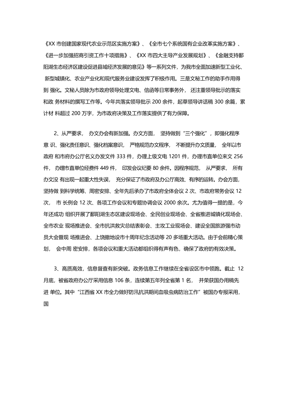 办公厅工作总结栏目:政府政务总结相关:政府办公厅工作今年,是我市经济和社会发展取得新成就、发生显著变化的一年。一年来,在市委、市政府的正确领导下,在省政府办公厅的悉心指导下,办公厅党组团结带领全体干部职工,以科学发展观为统领,围绕中心,服务大局,认真贯彻落实省委、省政府和市委、市政府一系列决策部署,以开展创业服务年活动为契机,明确职责定位,创新服务理念,圆满地完成了全年各项工作任务。概括起来,办公厅主要有以下八个方面的新变化:1、创新工作,参谋辅政有新提高。一年来,办公厅紧紧围绕市政府中心工作,强化角色意识,不断创新工作,较好地发挥了参谋助手作用。一是调查研究的决策参谋作用得到强化。作为领导的参谋助手机关,办公厅坚持把主要精力放在全局性大事要事的研究、谋划上。针对我市经济发展和改革开放中存在的矛盾和问题,广泛开展了调研活动,形成了《关于培育发展新材料产业的调研报告》、《坚持产业化经营之路,建设现代化农业强市》、《对当前固定资产投资的分析及建议》、《XX市加快示范镇建设的意见》、《主动融入海西,大力引进闽资》、《关于促进我市金融服务经济社会建设的几点浅见》等调研文章60余篇,为政府决策和工作指导提供了参考依据,许多调研成果转化成了决策成果。二是制定出台政策的辅助作用得到强化。办公厅紧紧围绕大局、服务大局,积极主动做好市政府重大决策、重点工作部署的参谋辅助工作,先后制定出台了《关于提升旅游产业发展水平建设全国旅游强市的决定》、《加快新能源产业发展的决定》、《XX市关于加快推进新型城镇化的决定》、《XX市创建国家现代农业示范区实施方案》、《全市七个系统国有企业改革实施方案》、《进一步加强招商引资工作十项措施》、《XX市四大主导产业发展规划》、《金融支持鄱阳湖生态经济区建设促进县域经济发展的意见》等一系列文件,为我市全面加速新型工业化、新型城镇化、农业产业化和现代服务业建设发挥了积极作用。三是文秘工作的助手作用得到强化。文秘人员除为市政府领导处理文电、信函等日常事务外,还注重领导批示的落实和政务材料的撰写工作等。今年共落实领导批示200余件,起草领导讲话稿300余篇,累计材料超过200万字,为市政府决策及工作落实提供了有力保障。2、从严要求,办文办会有新加强。办文方面,坚持做到“三个强化”,即强化程序意识、强化责任意识、强化档案意识,严格规范办文程序,不断提升办文质量,全年以市政府和市府办公厅名义办发文件333件,办理上级文电1201件,办理市直单位来文256件,办理市直单位经费件449件,印发会议纪要80余件。因程序规范,从严要求,所有办文没有出现一起重大性失误,充分保证了市政府及办公厅高效、有序的运转。办会方面,坚持做到科学统筹、周密安排、全年先后承办了市政府全体会议2次、市政府常务会议12次,市长例会12次、各项工作会议和专题协调会议2000余次。尤为值得一提的是,今年还成功组织开展了鄱阳湖生态区建设现场会、全民创业现场会、全省推进城镇化现场会、全市农业现场推进会、全市抗洪救灾总结表彰会、主攻工业现场会、建设全国旅游强市动员大会暨现场推进会、上饶撤地设市十周年纪念活动等20多场重大活动。由于会前精心策划,会中周密安排,各项会议和重大活动都组织得有声有色,确保了政府的有效决策。3、高质高效,信息督查有新突破。政务信息工作继续在全省设区市中领跑。截止12月底,被省政府办公厅采用信息106条,连续第五年列全省第1名,并荣获国办用稿先进单位。其中“江西省XX市全力做好防汛抗洪期间血吸虫病防治工作”被国办专报采用,国务院李克强副总理还专门作了批示。全年共编发市本级《政务信息》68期,客观地反映了我市的政务工作动态。政府信息公开工作有序推进。全年市本级上传政府信息2661条,各县(市、区)上传信息26715条,充分发挥了政府信息对群众生产、生活和社会活动的服务作用。督查工作敢动真敢碰硬,进一步增强了政府工作的执行力和落实力。全年督查立项117项,先后开展了防洪抢险专项督查、全市开工竣工重大项目专项督查、新型城镇化建设专项督查等活动,编发《督查督办》12期;...
