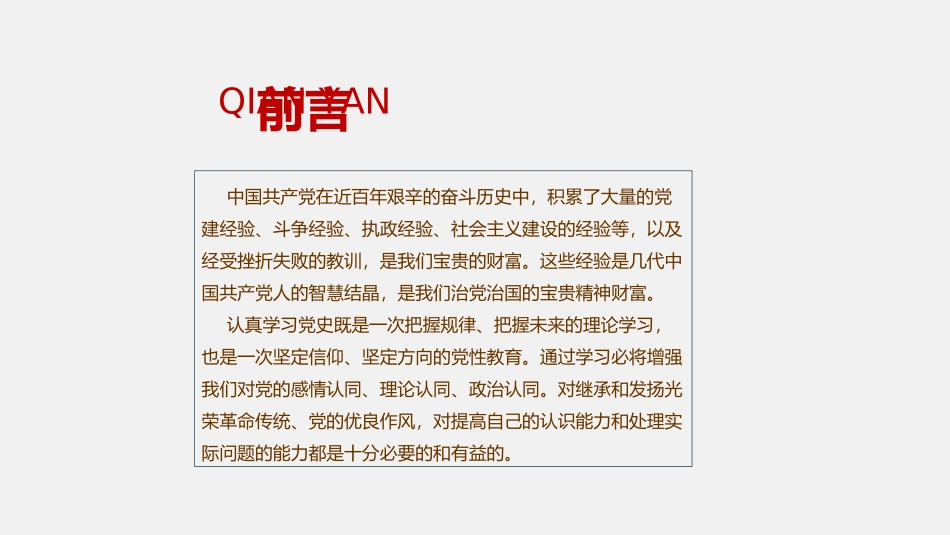 中国共产党党史(1921-2017)前言QIANYAN中国共产党在近百年艰辛的奋斗历史中,积累了大量的党建经验、斗争经验、执政经验、社会主义建设的经验等,以及经受挫折失败的教训,是我们宝贵的财富。这些经验是几代中国共产党人的智慧结晶,是我们治党治国的宝贵精神财富。认真学习党史既是一次把握规律、把握未来的理论学习,也是一次坚定信仰、坚定方向的党性教育。通过学习必将增强我们对党的感情认同、理论认同、政治认同。对继承和发扬光荣革命传统、党的优良作风,对提高自己的认识能力和处理实际问题的能力都是十分必要的和有益的。党史发展脉络及学习意义1新民主主义革命时期2社会主义革命和建设时期3改革开放和社会主义现代化建设时期401党史发展脉络及学习意义5党史发展脉络及学习意义这里输入图片的说明性文本学习党史的现实意义习总书记强调历史是最好的教科书,中国革命历史是最好的营养剂。学习党史、国史,是坚持和发展中国特色社会主义、把党和国家各项事业继续推向前进的必修课。在对历史的深入思考中做好现实工作,更好走向未来,不断交出坚持和发展中国特色社会主义的合格答卷。可以从历史中汲取智慧和力量是继承党的成功经验和优良传统的需要是加强党的思想理论建的重要任务6党史发展脉络及学习意义01邓小平理论成形南方谈话标志着中国特色社会主义理论体系基本成形。(即邓小平理论,三个代表重要思想和科学发展观等)02毛泽东思想基本形成遵义会议确立以毛泽东在中共中央的领导地位,是中共历史上一个生死攸关的转折点,标志着中国共产党从幼稚走向成熟。3中国共产党成立在陈独秀、李大钊领导下创立了中国共产党,翻开了中国革命的新篇章。7党史发展脉络及学习意义马克思主义传入中国,在陈独秀、李大钊领导下创立了中国共产党。马克思主义中的中国化,在毛泽东领导下创立了毛泽东思想。马克思主义的时代化,在邓小平领导下创立了中国特色社会主义理论体系。没有共产党就没有新中国(1919.5-1949.10)只有共产党才能发展中国(1949.10-1978.12)中国特色社会主义道路是中国必由之路(1978.12至今)理论发展角度理论发展角度02新民主主义革命时期9请在这里输入您的标题新文化运动打破了封建思想的桎梏,在中国社会中掀起了思想的启蒙运动,为马克思主义的传播奠定了基础。陈独秀蔡元培胡适鲁迅李大钊10新民主主义革命时期五四运动标志着我国新民主主义革命的开端,马克思主义在中国更为广泛的传播,并日益与中国工人运动的结合。五四运动是1919年5月4日发生在北京的一场以青年学生为主,广大群众、市民、工商人士等中下阶层共同参与的,通过示威游行、请愿、罢工、暴力对抗政府等多种形式进行的爱国运动,是中国人民彻底的反对帝国主义、封建主义的爱国运动。从1918年11月的"公理战胜强权"庆典,到次年1月的巴黎会议,短短两个月时间,当时的中国充分诠释了"自古弱国无外交"的定律,所谓的"公理战胜强权"不过是一个美丽的童话。面对这样屈辱的局面,从5月1日开始,北京的学生纷纷罢课,组织演讲、宣传,随后天津、上海、广州,南京,杭州,武汉,济南的学生、工人也给予支持。五四运动直接影响了中国共产党的诞生和发展,中国共产党党史一般将其定义为"反帝反封建的爱国运动"(注意这里的"封建"一词是泛化的封建观),并以此运动作为旧民主主义革命和新民主主义革命的分水岭。11新民主主义革命时期工人阶级的成长和工人运动的发展为中国共产党的成立奠定了阶级基础。具有初步共产主义思想的革命知识分子,到工人群众中宣传马克思主义和进行组织工作,进一步推动了马克思主义与工人运动的结合。1918年10月,“五四”运动的主要领导者李大钊在“新青年”杂志上发表了《庶民的胜利》等文章,歌颂俄国工人阶级的胜利。1919年9月,周恩来等在天津组织了觉悟社。图为部分社员1920年的合影。后排右一为周恩来,前排右三为邓颖超12新民主主义革命时期中国共产党的成立1920年8月,上海共产党发起组建立,成为各地建党活动的联络中心。1920年秋,董必武、陈潭秋、包惠僧等成立武汉共产党早期组织。同年秋,毛泽东、何叔衡等在湖南组建共产党早期组织。王尽美、邓恩铭等...