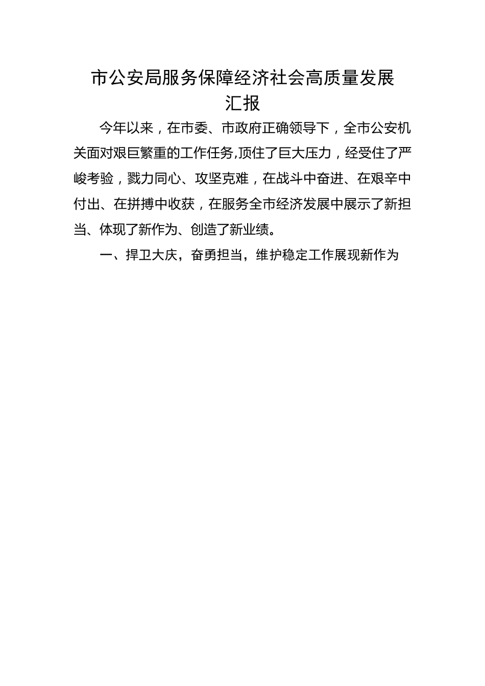 市公安局服务保障经济社会高质量发展汇报今年以来,在市委、市政府正确领导下,全市公安机关面对艰巨繁重的工作任务,顶住了巨大压力,经受住了严峻考验,戮力同心、攻坚克难,在战斗中奋进、在艰辛中付出、在拼搏中收获,在服务全市经济发展中展示了新担当、体现了新作为、创造了新业绩。一、捍卫大庆,奋勇担当,维护稳定工作展现新作为建党100周年大庆安保工作是今年对公安机关的一场政治大考、实战大考。我们牢牢把握“六个坚决防止发生”和“三个确保”工作要求,以“六个不发生创建活动”为抓手,坚持细致精致极致,抓紧抓实抓彻底,确保各项安保维稳措施落地见效。一是成立组织,完善机制。成立安保工作指挥部,成立了七个工作专班,明确任务目标,落实责任,一级对一级负责,层层压实责任,形成工作合力,站好“忠诚哨”,保住“社会面”,把全警的精神状态都凝聚到安保工作上来。二是强化XX,依法打击。核实辖区重点人员底数,登记造册,健全基础台帐,切实将所有对象纳入视线进行管理,切实做到底数清、情况明。对原平台录入的XX个涉稳群体XXX名涉稳人员进行了梳理、清洗,确定XX名重中之重人员,均全部落实WK措施。对无理缠访闹访、涉及违法犯罪的FF人员,进一步加大依法处置力度,形成有力震慑。对X名重点SF人员采取刑事强制措施,对X名SF人员依法给予治安处罚。三是化解矛盾,源头管控。深化“净网”行动,加大网络舆情监控力度,及时消除不良影响,确保意识形态领域安全。持续开展矛盾风险隐患排查行动,每天安排1名局领导干部公开接访,真正把问题解决在当地。持续推进XF积案化解,实行局领导干部包案,5年以下案件化解X件。四是强化防范,消除隐患。启动社会面管控一级巡防,提高街面见警率。全部警车上路一律亮警灯,实行了“白天见警察,晚上见警灯”。深入开展安全生产专项整治行动,坚决防止发生重特大安全事故和有较大影响的爆燃事故。严防BK袭击和破坏活动,确保人员密集公共场所、重点要害部位安全。共检查各类重点场所、部位XXXX个,核录人员XXXX人,发现并整改各类安全隐患XX处。严把火车站、汽车站JJ通道安检,核查人员XXX余人次,确保不使一枪一弹一件危险物品流入北京,不使一名重点人员进京滋事,圆满完成了ABWW任务。二、打防结合,亮剑扬威,深化平安建设取得新佳绩以扫黑除恶专项斗争和打击电信网络诈骗犯罪为重点,始终保持对各类突出刑事犯罪严打高压态势。截止目前,共刑事立案XXX起,破获各类刑事案件XXX起,打掉各类犯罪团伙XX余个,抓获团伙成员XXX人,刑事拘留XXX人,逮捕XXX人,起诉XXX人,取保候审XXX人,监视居住XX人,行政拘留XXX人。持续推进扫黑除恶专项斗争向纵深开展。共收集涉黑涉恶线索XXX条,查结线索XXX条,查结率全市第一位。破获涉黑恶刑事案件XXX起,刑事拘留XXX人,逮捕XXX人,起诉XXX人。共打掉黑社会性质组织犯罪X个,打掉涉恶犯罪集团X个、涉恶类犯罪团伙X个、恶势力共同犯罪XX个,扣押、查封涉案财物价值XXXX元。综合排名全市第二名。5月28日,我局打掉了以XXX为首的涉黑恶犯罪集团,抓获嫌疑人XX名。案件侦破后,引起强烈的社会反响,上百名群众到公安机关举报线索,打出了公安机关的声威。严厉打击严重暴力犯罪。以“命案必破”为龙头,全力攻坚杀人、个人极端暴力等有广泛社会影响的案件,侦破命案现案X起,保持了命案全破目标。经过连续两昼夜奋战,成功侦破了发生在XX镇的故意杀人案,迅速消除社会影响。持续加大电信网络诈骗新型犯罪打击整治力度。开展打击电信网络新型违法犯罪百日攻坚行动,相继破获XXX被诈骗案、XXX被诈骗案、XXX被诈骗案等电信诈骗目标案件,共受理案件XXX起,破案XX起,刑事拘留XX人,冻结涉案资金XXX万元。严厉打击多发性侵财犯罪。以打团伙、破系列为重点,大幅提高案件串并率,最大限度提高破案率、挽损率。相继打掉XXX等诈骗团伙、XXX等人盗窃农用机车团伙、XXX系列盗窃门店保险柜案、XXX、XXX系列盗窃电动车案等,挽回经济损失XXXX余万元。全力开展缉毒会战专项行动。查获吸毒人员XX人,其中新发现吸毒人员XX人,抓获贩毒嫌疑人XX人,强制隔离戒毒X人。开展了“天目铲毒”战役,铲除毒...