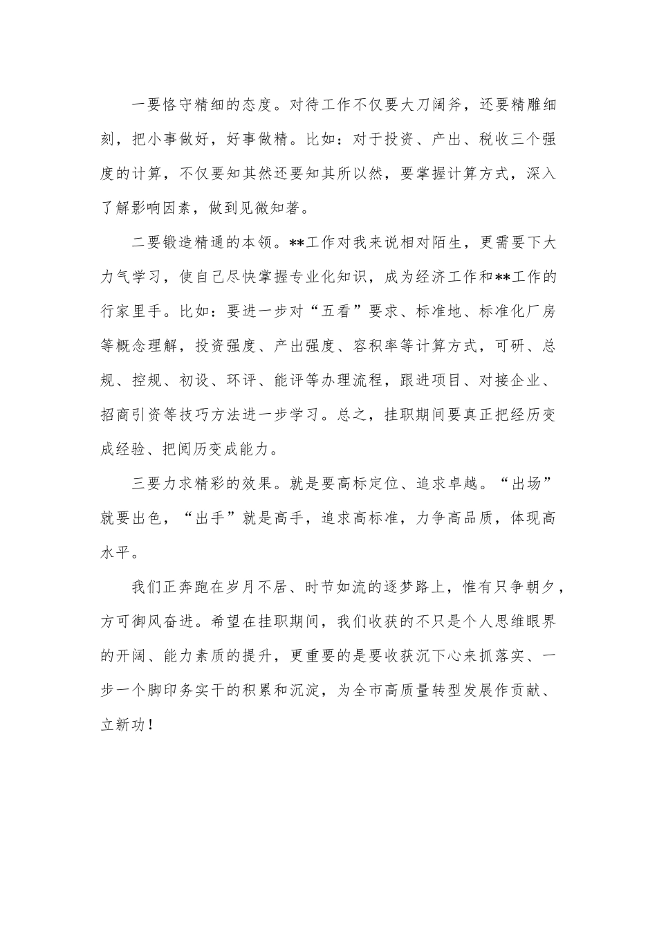 挂职干部座谈会经验交流发言材料大家好!我是***,现任***。很荣幸能够作为挂职干部代表发言,下面就我对**挂职工作的认识发言如下。一、知势、借势、蓄势,把握一个“势”字“知势”谋局。**建设是落实省委“四为四高两同步”总体思路和要求、市委“一三四三”工作思路的主战场和突破口,也是实现转型发展五年出雏形的重大举措。我们选调生在这样一个高质量转型发展的战略机遇期和干事创业的黄金期,必将大有可为,也必将大有作为。“借势”而为。工作以来,组织对选调生一直关心关爱,安排乡镇副书记专门培养联系、经常性了解思想动态、多次组织针对性培训、多岗位轮岗历练,这次又把我们选派到**挂职,既是是一次培养,也是一次特殊的考验,我们要借**发展之势,迅速完成角色转换,系统学习**建设的发展方向、工作重点、政策导向和目标任务,提升自己,踏实干事,不负组织期望。“蓄势”博发。作为一名年轻干部,我们要通过**挂职的历练,积蓄力量、砥砺品质,在经风雨、见世面中学真本领、练真功夫,在日后的成长中有所作为、担当重任。二、苦干、实干、巧干,突出一个“干”字没有等出来的辉煌,只有干出来的精彩。面对新任务,我们只有苦干实干加巧干,才能得到满意的收获。所谓“苦干”,就是要夙兴夜寐、殚精竭虑。**高新区*月*日挂牌成立,各项工作急需推进,挂职期间,我要围绕中心工作,聚焦基础设施建设、项目推进、招商引资、优化营商环境等重点内容,勇挑千钧重担,苦心谋发展、苦干创事业,用我们的“辛苦指数”换来**七项考核指标的“增长指数”。所谓“实干”,就是要抓铁有痕、踏石留印。我们挂职要力戒“镀金”思想,真正为挂职单位留下浓墨重彩的一笔。要主动学习,向领导同事求教,奠定工作基础;要深入调研,在深、实、细、准、效上下功夫,做到心中有数、手中有策、脑中有法;要投身一线,在基础设施建设、招商引资、项目跟进等工作上持续发力,用实干创高新;要主动服务,了解企业需求,及时沟通交流,做好“店小二”。总之,要干出干劲,干出水平,干出成效。所谓“巧干”,就是要开拓创新、科学施策。发挥年轻干部思维活跃、接受新事物较快的优点,拿出“初生牛犊不怕虎”的勇气和激情,决不能把老气横秋当成熟、把墨守成规当稳健,陷入凭经验办事的俗套之中,也不能把创新当“时髦”来喊,玩些概念性、虚头巴脑的东西。比如,要在“标准地+承诺制+代办制”的探索上主动思考,提想法、出点子、做参谋。三、精细、精通、精彩,做到一个“精”字**高新区的“高新”二字,不仅是产业的匹配,更是对我们工作提出的更高要求。一要恪守精细的态度。对待工作不仅要大刀阔斧,还要精雕细刻,把小事做好,好事做精。比如:对于投资、产出、税收三个强度的计算,不仅要知其然还要知其所以然,要掌握计算方式,深入了解影响因素,做到见微知著。二要锻造精通的本领。**工作对我来说相对陌生,更需要下大力气学习,使自己尽快掌握专业化知识,成为经济工作和**工作的行家里手。比如:要进一步对“五看”要求、标准地、标准化厂房等概念理解,投资强度、产出强度、容积率等计算方式,可研、总规、控规、初设、环评、能评等办理流程,跟进项目、对接企业、招商引资等技巧方法进一步学习。总之,挂职期间要真正把经历变成经验、把阅历变成能力。三要力求精彩的效果。就是要高标定位、追求卓越。“出场”就要出色,“出手”就是高手,追求高标准,力争高品质,体现高水平。我们正奔跑在岁月不居、时节如流的逐梦路上,惟有只争朝夕,方可御风奋进。希望在挂职期间,我们收获的不只是个人思维眼界的开阔、能力素质的提升,更重要的是要收获沉下心来抓落实、一步一个脚印务实干的积累和沉淀,为全市高质量转型发展作贡献、立新功!