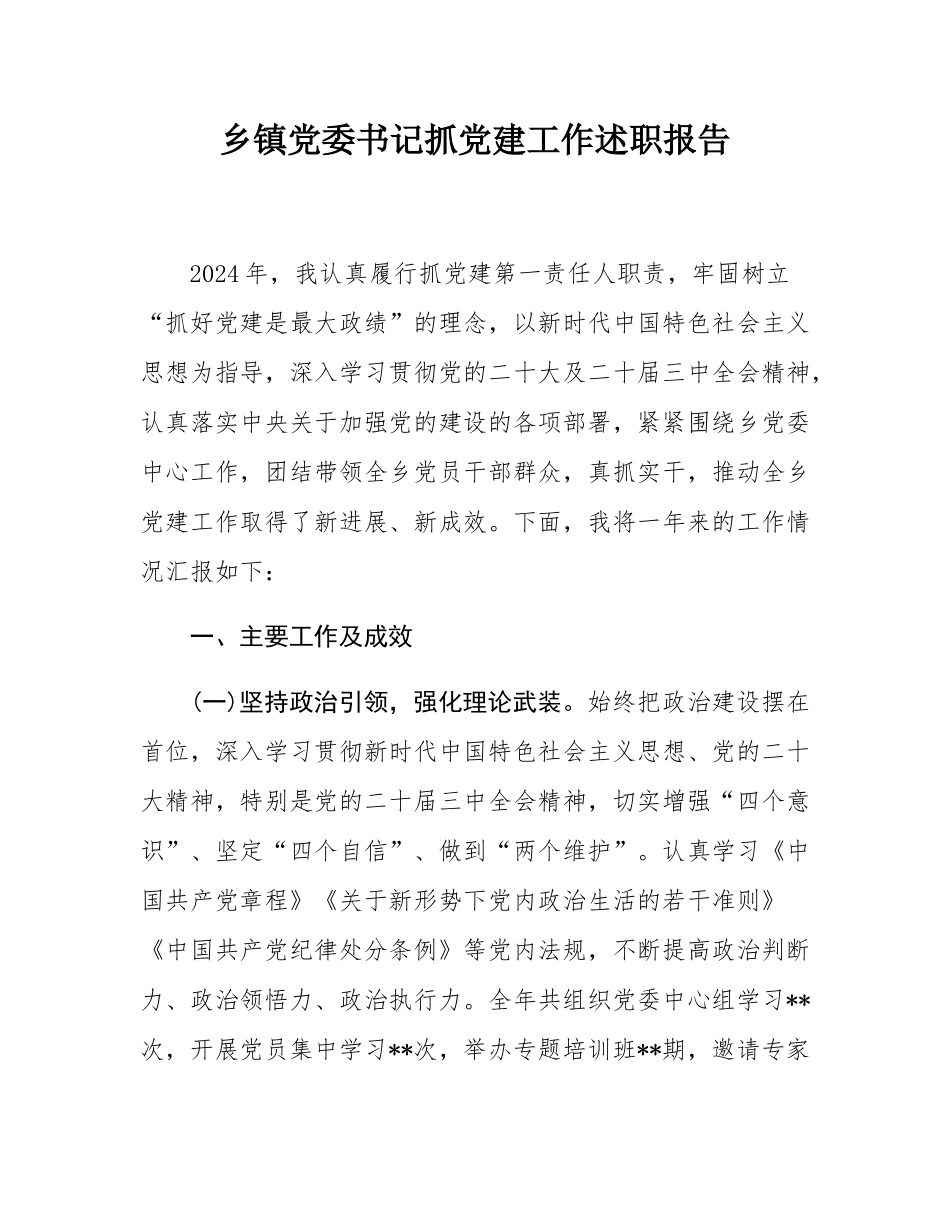乡镇党委书记抓党建工作述职报告2024年,我认真履行抓党建第一责任人职责,牢固树立“抓好党建是最大政绩”的理念,以新时代中国特色社会主义思想为指导,深入学习贯彻党的二十大及二十届三中全会精神,认真落实中央关于加强党的建设的各项部署,紧紧围绕乡党委中心工作,团结带领全乡党员干部群众,真抓实干,推动全乡党建工作取得了新进展、新成效。下面,我将一年来的工作情况汇报如下:一、主要工作及成效(一)坚持政治引领,强化理论武装。始终把政治建设摆在首位,深入学习贯彻新时代中国特色社会主义思想、党的二十大精神,特别是党的二十届三中全会精神,切实增强“四个意识”、坚定“四个自信”、做到“两个维护”。认真学习《中国共产党章程》《关于新形势下党内政治生活的若干准则》《中国共产党纪律处分条例》等党内法规,不断提高政治判断力、政治领悟力、政治执行力。全年共组织党委中心组学习**次,开展党员集中学习**次,举办专题培训班**期,邀请专家学者解读党的二十届三中全会精神**次,有效提升了党员干部的政治理论素养和党性修养。(二)夯实基层基础,筑牢战斗堡垒。一是建强组织体系。以提升组织力为重点,突出政治功能和组织功能,持续推进“五星支部”创建工作,不断完善基层党组织设置,规范组织生活,严格落实“三会一课”、主题党日等制度,推动党支部标准化规范化建设。全年共创建“五星支部”**个,整顿软弱涣散党组织**个,有效提升了基层党组织的战斗力、凝聚力和服务力。二是强化党员管理。严格落实党员发展程序,坚持把政治标准放在首位,注重党员发展质量,全年发展党员**名,培养入党积极分子**名。同时,加强党员教育管理监督,开展党员评议活动**次,对不合格党员进行教育帮扶或处置,持续推进党员队伍的纯洁性和先进性建设。三是提升队伍素质。积极开展党员干部培训,通过举办专题培训班、外出学习考察、在线学习等多种方式,提升党员干部的政治素质、业务能力和服务水平,特别是加强对年轻干部的培养锻炼,为乡村振兴提供坚强的人才保障。全年共举办各类培训班**期,培训党员干部**人次。(三)聚焦中心工作,服务发展大局。坚持党建引领发展,将党建工作与中心工作深度融合,推动党建工作与经济社会发展同频共振,以高质量党建引领高质量发展。一是发展特色产业。立足本地资源禀赋,深入贯彻落实党的二十届三中全会精神,大力发展**特色产业,成立**专业合作社,吸纳党员**名、群众**名参与,带动群众增收致富,有效巩固拓展脱贫攻坚成果,助力乡村振兴。二是改善人居环境。积极开展农村人居环境整治行动,组织党员干部带头参与环境卫生整治、垃圾分类、厕所革命等工作,全年共清理垃圾**吨,改造危旧房屋**户,建设美丽乡村**个,村容村貌焕然一新。三是提升服务水平。深入开展“我为群众办实事”实践活动,聚焦群众急难愁盼问题,积极为群众解决实际困难,全年共解决群众反映的热点难点问题**件,群众满意度和获得感显著提升。(四)加强作风建设,树立良好形象。一是强化廉政教育。坚持把党风廉政建设作为一项重要政治任务,深入开展廉政警示教育,加强党纪党规学习,引导党员干部筑牢拒腐防变的思想防线,营造风清气正的政治生态。二是完善监督机制。加强对党员干部的监督管理,畅通群众监督渠道,完善信访举报机制,对违规违纪行为严肃查处,零容忍惩治腐败。二、存在的问题及原因尽管取得了一些成绩,但我也清醒地认识到,工作中还存在一些不足。一是部分基层党组织建设还不够规范,党员教育管理还有待加强,党员队伍活力还不够强。二是党建工作与中心工作融合还不够深入,服务发展的能力有待进一步提升。三是党风廉政建设还需常抓不懈,监督机制有待进一步完善。这些问题的存在,主要原因在于:一是思想认识还不够到位,二是工作方法还不够创新,三是监督管理还不够严格,四是干部队伍能力素质还有待提升。三、下一步工作思路和措施2025年,我将继续认真履行抓党建第一责任人职责,以党的二十大及二十届三中全会精神为指引,重点做好以下几方面工作:(一)强化理论武装,提升政治素养。深入学习贯彻新时代中国特色社会主义思想和党的二...