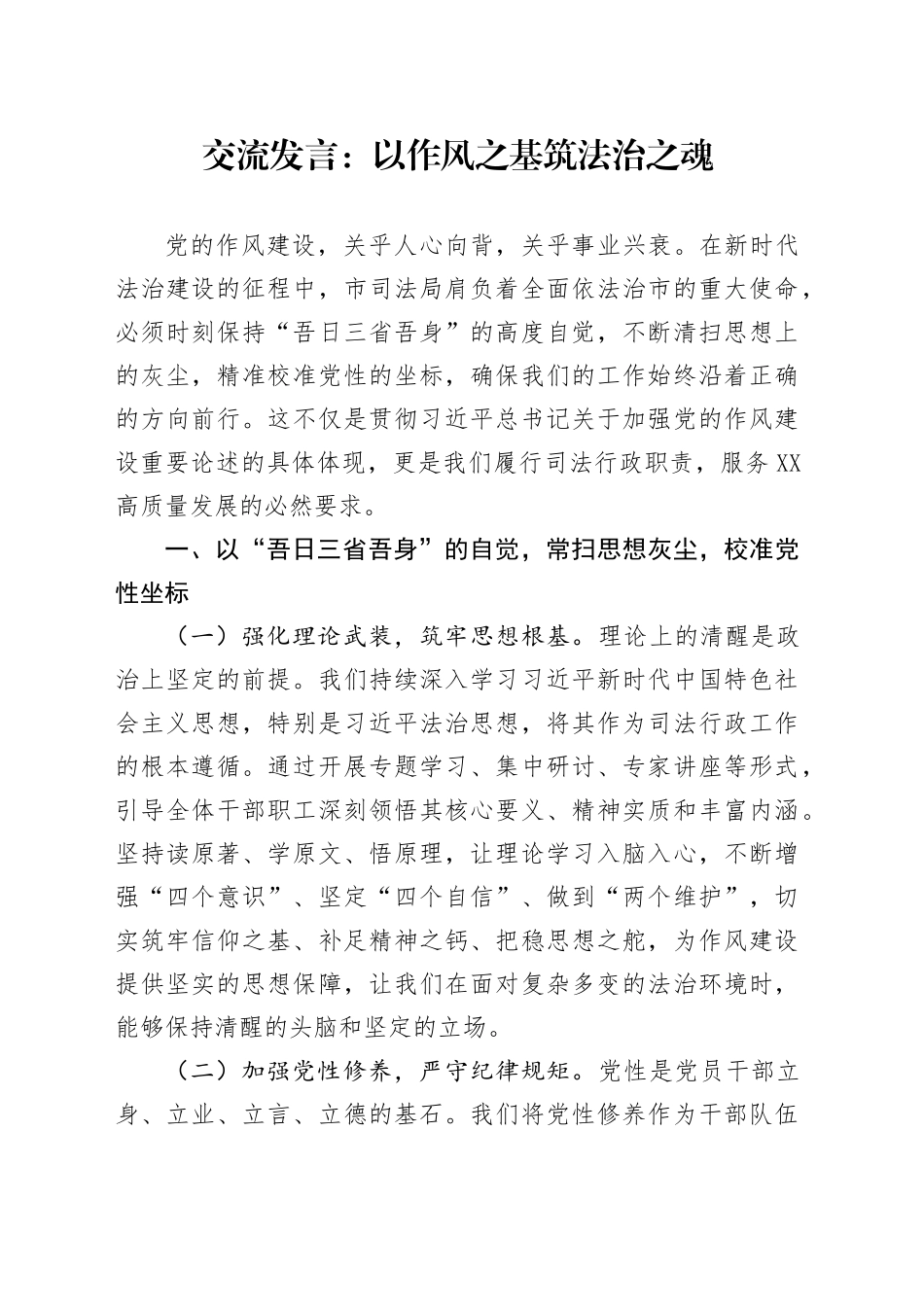 交流发言:以作风之基筑法治之魂党的作风建设,关乎人心向背,关乎事业兴衰。在新时代法治建设的征程中,市司法局肩负着全面依法治市的重大使命,必须时刻保持“吾日三省吾身”的高度自觉,不断清扫思想上的灰尘,精准校准党性的坐标,确保我们的工作始终沿着正确的方向前行。这不仅是贯彻习近平总书记关于加强党的作风建设重要论述的具体体现,更是我们履行司法行政职责,服务XX高质量发展的必然要求。一、以“吾日三省吾身”的自觉,常扫思想灰尘,校准党性坐标(一)强化理论武装,筑牢思想根基。理论上的清醒是政治上坚定的前提。我们持续深入学习习近平新时代中国特色社会主义思想,特别是习近平法治思想,将其作为司法行政工作的根本遵循。通过开展专题学习、集中研讨、专家讲座等形式,引导全体干部职工深刻领悟其核心要义、精神实质和丰富内涵。坚持读原著、学原文、悟原理,让理论学习入脑入心,不断增强“四个意识”、坚定“四个自信”、做到“两个维护”,切实筑牢信仰之基、补足精神之钙、把稳思想之舵,为作风建设提供坚实的思想保障,让我们在面对复杂多变的法治环境时,能够保持清醒的头脑和坚定的立场。(二)加强党性修养,严守纪律规矩。党性是党员干部立身、立业、立言、立德的基石。我们将党性修养作为干部队伍建设的重要内容,通过开展主题党日、参观红色教育基地、重温入党誓词等活动,传承红色基因,弘扬优良传统,增强党员干部的党性观念和宗旨意识。同时,严格遵守党的政治纪律、组织纪律、廉洁纪律、群众纪律、工作纪律和生活纪律,自觉做到心有所畏、言有所戒、行有所止。建立健全纪律监督机制,加强对干部职工日常行为的监督管理,对违反纪律规矩的行为严肃查处,绝不姑息迁就,确保纪律的严肃性和权威性,使全体干部职工始终保持清正廉洁的政治本色。(三)坚持自我反思,勇于自我革新。“人非圣贤,孰能无过”,重要的是能够及时发现并改正错误。我们倡导干部职工养成自我反思的习惯,定期对照党章党规党纪,对照先进典型,查找自身在思想、作风、工作等方面存在的问题和不足。鼓励干部职工勇于自我革新,敢于突破传统思维定式和工作模式,积极探索司法行政工作的新思路、新方法、新举措。建立健全问题整改机制,对查找出的问题列出清单,明确整改措施、责任人和时限,确保问题整改到位,不断提升自身综合素质和工作能力,以适应新时代司法行政工作的新要求。二、以“一篙不可放缓”的韧劲,紧盯顽瘴痼疾,深化标本兼治作风建设永远在路上,没有休止符。在司法行政工作中,我们以“一篙不可放缓”的韧劲,持之以恒地紧盯作风建设中的顽瘴痼疾,深化标本兼治,坚决打好作风建设持久战。这既是解决当前突出问题的迫切需要,也是推动司法行政事业长远发展的重要保障。只有坚持不懈地整治作风问题,才能营造风清气正的政治生态,为全面依法治市提供有力支撑。(一)聚焦形式主义、官僚主义问题,精准发力整治。形式主义、官僚主义严重影响工作效率和服务质量,损害党和政府在人民群众心中的形象。我们重点整治工作中存在的重形式轻内容、重部署轻落实、重材料轻实效等形式主义问题,以及高高在上、脱离群众、推诿扯皮、敷衍塞责等官僚主义问题。通过精简会议文件、优化工作流程、加强工作督办等措施,切实减轻基层负担,提高工作效能。建立健全群众监督机制,畅通群众反映问题的渠道,对群众反映强烈的形式主义、官僚主义问题,一经查实,严肃问责,以实际行动取信于民,让群众感受到实实在在的变化。(二)着力解决法律服务领域突出问题,提升服务质量。法律服务是司法行政工作的重要内容,直接关系到人民群众的切身利益。我们聚焦法律服务领域存在的服务不规范、收费不合理、职业道德缺失等突出问题,加强行业监管,完善行业规范,强化行业自律。建立健全法律服务质量监督机制,加强对律师、公证员、司法鉴定人等法律服务人员的执业监督,对违规违纪行为依法依规严肃处理。开展法律服务行业专项整治行动,规范法律服务市场秩序,提升法律服务质量和水平,为人民群众提供优质高效的法律服务,让人民群众在每一个法律服务事项中都感受到公平正义。(三)...
