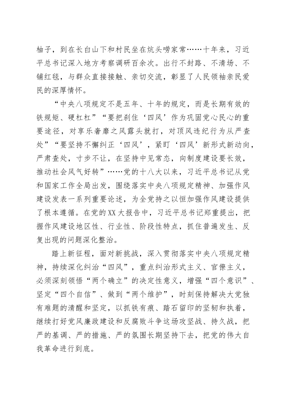 医院党委书记学习中央八项规定精神研讨发言材料党的十八大以来,以习近平同志为核心的党中央把中央八项规定作为加强作风建设的切入点、全面从严治党的突破口,直面人民群众反映强烈的突出问题,从制定实施中央八项规定破题,以上率下改进工作作风,持之以恒正风肃纪,党风政风为之一新,社风民风持续向上向善,引领中国社会在新时代发生伟大变革。2025年是全面贯彻落实党的XX大精神的开局之年,是实施“十四五”规划承上启下的关键之年,是全面建设社会主义现代化国家的重要一年,在全党开展深入贯彻中央八项规定精神学习教育,是党中央作出的重大决策,目的是为了巩固深化习近平新时代中国特色社会主义思想主题教育和党纪学习教育成果,锲而不舍落实中央八项规定精神,推动作风建设常态化长效化。一、坚持以上率下,在学深悟透中强化政治自觉八项规定,一子落而满盘活。2012年12月4日,十八届中央政治局会议审议通过《十八届中央政治局关于改进工作作风、密切联系群众的八项规定》,从调查研究、会议活动等8个方面为加强作风建设立下规矩。十年来,以习近平同志为核心的党中央以身作则、以上率下,带头严格执行中央八项规定,给全党树立了标杆,向全国人民作出了表率。从赴广东考察吃自助餐,到赴河北调研住16平方米房间,从在湘西同村民一起摘柚子,到在长白山下和村民坐在炕头唠家常……十年来,习近平总书记深入地方考察调研百余次。出行不封路、不清场、不铺红毯,与群众直接接触、亲切交流,彰显了人民领袖亲民爱民的深厚情怀。“中央八项规定不是五年、十年的规定,而是长期有效的铁规矩、硬杠杠”“要把刹住‘四风’作为巩固党心民心的重要途径,对享乐奢靡之风露头就打,对顶风违纪行为从严查处”“要坚持不懈纠正‘四风’,紧盯‘四风’新形式新动向,严肃查处,寸步不让,在坚持中见常态,向制度建设要长效,推动社会风气好转”……党的十八大以来,习近平总书记从党和国家工作全局出发,围绕落实中央八项规定精神、加强作风建设发表一系列重要论述,为全党持之以恒加强作风建设提供了根本遵循。在党的XX大报告中,习近平总书记郑重提出,把握作风建设地区性、行业性、阶段性特点,抓住普遍发生、反复出现的问题深化整治。踏上新征程,面对新挑战,深入贯彻落实中央八项规定精神,持续深化纠治“四风”,重点纠治形式主义、官僚主义,必须深刻领悟“两个确立”的决定性意义,增强“四个意识”、坚定“四个自信”、做到“两个维护”,时刻保持解决大党独有难题的清醒和坚定,以抓铁有痕、踏石留印的坚韧和执着,继续打好党风廉政建设和反腐败斗争这场攻坚战、持久战,把严的基调、严的措施、严的氛围长期坚持下去,把党的伟大自我革命进行到底。二、坚持问题导向,在细照笃行中强化责任担当习近平总书记强调,党的作风和形象关系党的创造力、凝聚力、战斗力,决定党和国家事业成败。党的十八大以来,党中央把全面从严治党纳入“四个全面”战略布局,从制定和落实中央八项规定开局破题,持之以恒正风肃纪,党风政风民风向上向好,党心军心民心高度凝聚。踏上新征程,我们要深刻领悟“两个确立”的决定性意义,坚决做到“两个维护”,把落实中央八项规定精神作为捍卫“两个确立”、做到“两个维护”的实际行动,把党的伟大自我革命进行到底。在全党开展深入贯彻中央八项规定精神学习教育,是党中央作出的重大决策,是贯彻落实党的XX大部署,巩固拓展学习贯彻习近平新时代中国特色社会主义思想主题教育成果,巩固深化党纪学习教育成果,推进作风建设常态化长效化的关键举措,也是今年党建工作的重点任务。医院党委要切实增强政治责任感和使命感,坚持目标导向、问题导向、结果导向,不折不扣落实好中央和省委、市委部署要求,努力实现干部受教育、问题得解决、作风大转变、形象大提升。一要在学深悟透中提高站位。坚持以习近平新时代中国特色社会主义思想为指导,深入学习习近平总书记关于加强党的作风建设的重要论述,深刻把握新时代新征程作风建设的新部署新要求,进一步增强贯彻落实中央八项规定精神的政治自觉、思想自觉、行动自觉。二要在查摆问题中动真碰硬。要坚持刀...