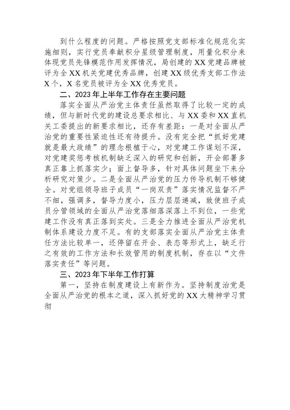 XX党委书记2023年上半年履行全面从严治党“第一责任人”责任述职报告按照会议安排,我就落实全面从严治党主体责任向XX委述职如下:一、2023年上半年履行职责情况第一,坚持把学习贯彻习近平新时代中国特色社会主义思想主题教育作为首要政治任务笃学笃信笃行。坚决贯彻落实XX委部署要求,带头与督导XX直部门把理论学习,调查研究,推动发展,检视整改贯通起来,有机融合,一体推进,坚持读原著与悟原理结合,推动学习入脑入心。坚持摸实情与破难题结合,推动调研求深求实。坚持查问题与听意见结合,推动检视认真较真;坚持谋全局与抓具体结合,推动整改真刀真枪。坚持主题教育与学习贯彻党的XX大精神结合,推动党的XX大精神深入落实。从而使主题教育与机关党建工作互促共进共赢,取得明显实效。第二,坚持认真贯彻落实《中国共产党支部工作条例(试行)》,把全面从严治党主体责任链条压紧压实。牢固树立“党的一切工作落到支部”导向,抓实过硬党支部建设,选好配强党支部书记,不断增强党组织的创造力、凝聚力和战斗力。建立局党组书记及其班子成员支部党建工作联系点,定期研究局各党支部全面从严治党主体责任落实情况,定期听取主体责任工作汇报,定期为全体党员上廉政党课,部署全面从严治党各项工作,做到与全体党员一起知责、尽责、负责。2023年上半年来,局党组召开专题研究党建工作会议X次,建立支部党建工作联系点X个,为全体党员上党课X次。严格落实《关于新形势下党内政治生活的若干准则》,在征求全局各党支部意见建议的基础上,研究制定了《全局党支部组织生活规范化建设实施意见手册(2023年)》,对支部组织生活作了进一步规范,切实发挥好支部书记“关键少数”作用,持续提升组织生活质量。把党风廉政建设和政治纪律、工作纪律、保密纪律等纳入支部每个月的学习内容,开展警示教育活动,进一步增强了全体党员干部的廉政意识。第三,坚持持之以恒深入推进干部作风建设。运用纪律思维,抓早抓小,搞好监督执纪工作,推进全面从严治党任务落实到全局的各项具体工作中。抓好全局党员干部的学习教育培训工作,把监督执纪各项目标和要求与日常工作同部署、同要求,不断提升全体党员干部遵纪守法的自觉性和主动性。在全局推行了“XX”纠风正风行动,即查精神状态,看精神是否在工作状态,精力是否在工作中;查工作作风,看是否存在作风涣散、纪律松弛的问题;查大局意识,看是否存在部门利益和个人利益至上的问题;查执行落实,看是否存在有令不行、有禁不止的问题,推动了作风建设高质量发展。持续开展“干部作风XXX”活动,较好解决党建与业务“两张皮”的问题。实施党组书记抓党建突破项目,较好解决了党建难点弱点问题。推行支部工作法并评选优秀支部工作法案例,较好解决了支部工作不会抓、不知抓什么、抓到什么程度的问题。严格按照党支部标准化规范化实施细则,实行党员奉献积分星级管理制度,用量化积分来体现党员先锋模范作用发挥情况,局创建的XX党建品牌被评为全XX机关党建优秀品牌,创建XX级优秀支部工作法X个,X名党员被评为全XX优秀党员。二、2023年上半年工作存在主要问题落实全面从严治党主体责任虽然取得了比较一定的成绩,但与新时代党的建设总要求相比、与XX委和XX直机关工委提出的新要求相比,还存有差距:一是对全面从严治党的重要性紧迫性还有待提升。没有完全把“抓好党建就是最大政绩”的理念根植于心,对党建工作谋划不深,对党建奖惩考核机制缺乏深入的研究和创新,开会部署多真正靠上抓落实少;面上督导多,针对具体问题坐下来分析研究对策少。二是全面从严治党的压力传导机制不够健全。对党组领导班子成员“一岗双责”落实情况监督不严不细,强调多,督导力度小,压力层层递减,致使班子成员分管领域的全面从严治党落细落深落上不到位,一些党建工作没有真正落到实处。三是全力推进全面从严治党机制体系建设力度不足。有的支部落实全面从严治党主体责任方法比较单一,还停留在开会、表态等形式上,缺乏行之有效的工作方法和长效管用的制度机制,存在以“文件落实责任”等问题。三、2023年下半年工作打算第一,坚持在制度建设上有新作为。坚持...