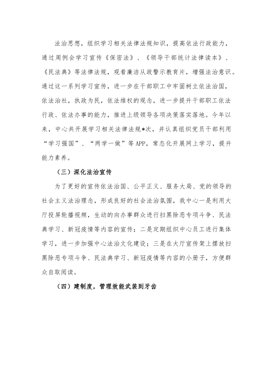 区政务服务中心法治政府建设工作情况汇报为深入贯彻落实习近平法治思想和中央全面依法治国、省委全面依法治省、市委全面依法治市和区委全面依法治区工作会议精神,根据《关于印发〈*区*年度依法治区(含法治*、法治政府、法治社会建设、普法)目标绩效考核指标〉的通知》的要求,*区政务服务中心不断创新工作,坚持党的全面领导,坚定不移走中国特色社会主义法治道路,为完善中国特色社会主义法治体系持续发力,现将中心*年度依法治区(含法治*、法治政府、法治社会建设、普法)目标考核总结如下:一、夯实基础,不断强化自身建设(一)高度重视,落实责任我中心领导班子对法治政府建设和依法行政工作高度重视,明确由单位主要领导履行推进法治建设第一责任人职责,认真贯彻落实党中央和上级党组织关于法治建设工作的决策部署及指示精神,牢牢把握正确的政治方向,严守政治积极和政治规矩、严守组织纪律和宣传纪律,落实国家工作人员学法用法制度,在推行行政决策科学化、民主化、法治化,强化行政执法监督,严格规范公正文明执法方面都取得了较大成绩。(二)加强思想政治建设强化学习教育,补足精神之钙,我中心深入学习贯彻习近平法治思想,组织学习相关法律法规知识,提高依法行政能力,通过周例会学习宣传《保密法》、《领导干部统计法律读本》、《民法典》等法律法规,观看廉洁从政警示教育片,增强法治意识。通过这一系列学习宣传,进一步在干部职工中牢固树立依法治国,依法治社,执政为民,依法维权的观念,进一步提升干部职工依法行政、依法办事的能力,推进上级领导各项决策落实落地。今年以来,中心共开展学习相关法律法规*次,并认真组织党员干部利用“学习强国”、“两学一做”等APP,常态化开展网上学习,提升能力素养。(三)深化法治宣传为了更好的宣传依法治国、公平正义、服务大局、党的领导的社会主义法治理念,形成良好的社会法治氛围,我中心一是利用大厅投屏轮播视频,生动的向办事群众进行扫黑除恶专项斗争、民法典学习、新冠疫情等内容的宣传;二是定期组织中心员工进行集体学习,进一步加强中心法治文化建设;三是在大厅宣传架上摆放扫黑除恶专项斗争、民法典学习、新冠疫情等内容的小册子,方便群众自取阅读。(四)建制度,管理效能武装到牙齿为切实提高政务服务效能,优化政务服务质量,*区政务服务中心结合实际,在原有制度的基础上新增或修订完善了《*区人民政府政务服务中心财务管理综合制度》、《*区人民政府政务服务固定资产管理制度》等一系列内控制度。结合省市政务服务有关指标要求和往年工作经验,经过反复酝酿、指标梳理、征求意见、座谈讨论、请示汇报,我中心建立了《*年*区政务服务考核管理办法》,并在*年*月*日召开的第*次区长办公会审议通过。该《考核办法》将所有工作内容指标化、目标化、具体化,分别考核部门业务和人员服务两大方面,其中部门业务类有*项具体指标,人员服务类有*项具体指标,每季通过网上数据抽取、视频监控抓取、巡查记录调取等多种方式和手段量化考核,对全区政务服务相关单位和政务服务从业人员进行打分排名,并且也明确了相应的惩奖措施。通过考核排名倒逼部门和人员不断改善和提高工作作风、业务水平和服务能力的方式,极大地推动了服务质量“零差错”、服务事项“零积压”、服务受理“零推诿”、服务方式“零距离”的实现,极大地转变了政务中心一直以来在统筹方面的被动局面,实现从兼职管、偶尔管、自己管、不好管到如今的建章立制全面管、专岗专人反复管、综合评分排名管、优奖庸惩区别管,部门协同联合管的“单打独斗不好管”向“各级合力严格管”的转变。(五)抓整改,投诉建议处理到满意为方便办事群众,*区政务服务中心畅通多条沟通投诉渠道,在大厅显著位置设立意见箱、意见薄、服务热线、投诉电话、办事指南,针对出现的差评,我中心安排专人按照差评受理、调查核实、差评整改、回访反馈、举一反三、保持长效的闭环流程及时处理,特别是经常出现差评的部门,将与其局领导召开专题会分析原因、找准对策、明确措施、提升服务,充分运用评价结果,更好地发挥“好差评”监督作用。截止*年*月共收到投...
