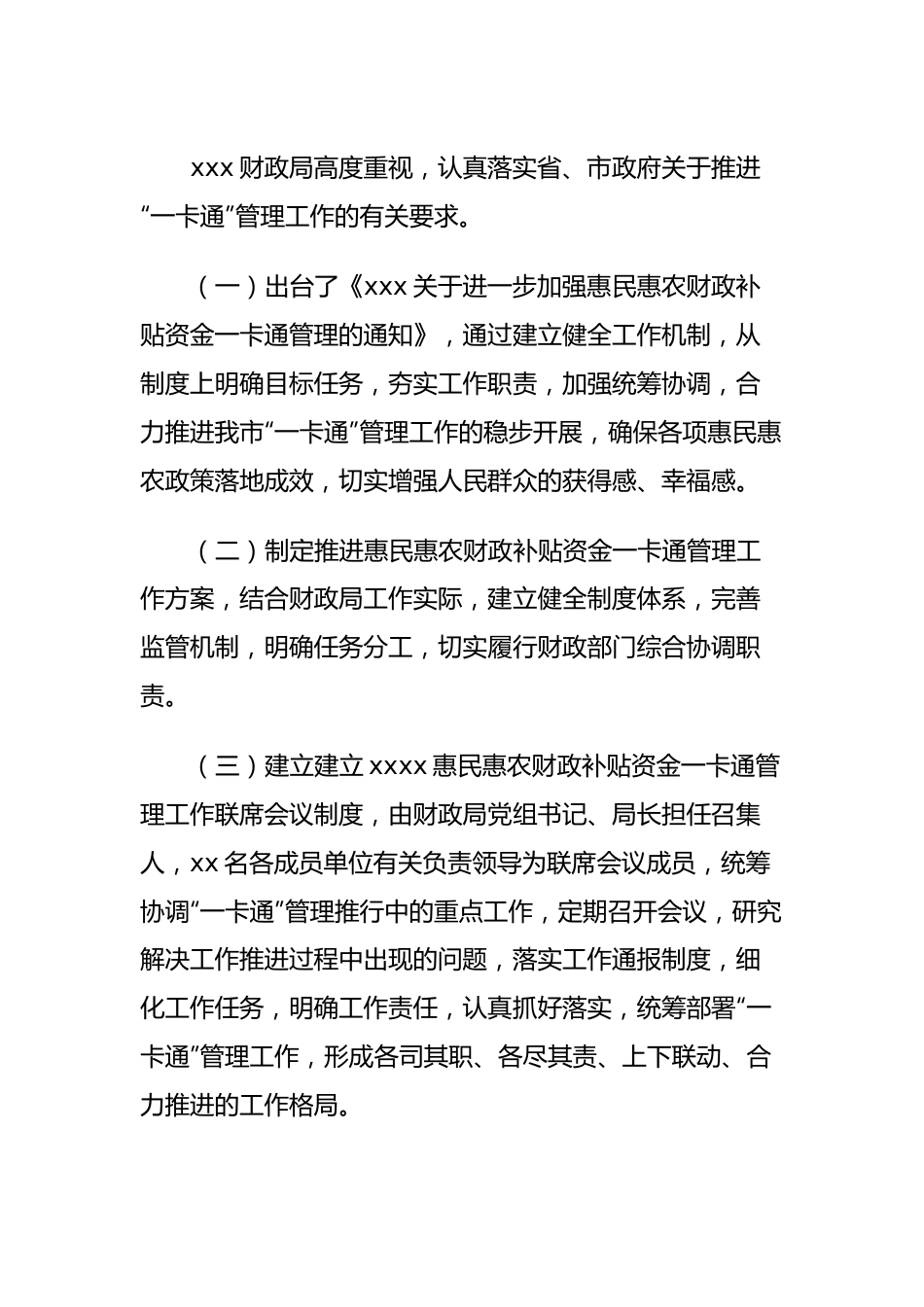 关于推进惠民惠农财政补贴资金“一卡通”进展情况工作汇报为进一步加强惠民惠农财政补贴资金发放管理,从根本上解决补贴资金管理不规范、补贴发放不及时等突出问题,切实维护人民群众利益,根据《xxx人民政府办公厅关于进一步加强惠民惠农财政补贴资金“一卡通”管理的实施意见》和《xxx市人民政府办公室关于进一步加强惠民惠农财政补贴资金“一卡通”管理的通知》精神,xxx财政局迅速行动、多方谋划,多举措、全方位推进惠民惠农财政补贴资金“一卡通”管理各项工作。现将“一卡通”工作进展情况汇报如下。一、聚焦目标任务,提高政治站位组织各有关单位(部门)、局相关股室、金融机构等收听收看全省“一卡通”管理工作视频会议,学习会议内容,明确目标任务,即到xxx年,所有直接兑付到人到户的补贴资金原则上均通过“一卡通”方式集中发放,并纳入惠民惠农财政补贴资金“一卡通”系统统一管理,实现“一张清单管制度”“一个平台管发放”,让“一卡通”真正成为惠及群众的幸福卡、明白卡,坚持惠民便民、坚持服务高效、坚持统筹推进,切实把“一卡通”管理工作作为当前一项重要政治任务抓实抓细抓好。二、强化组织领导,健全工作机制xxx财政局高度重视,认真落实省、市政府关于推进“一卡通”管理工作的有关要求。(一)出台了《xxx关于进一步加强惠民惠农财政补贴资金一卡通管理的通知》,通过建立健全工作机制,从制度上明确目标任务,夯实工作职责,加强统筹协调,合力推进我市“一卡通”管理工作的稳步开展,确保各项惠民惠农政策落地成效,切实增强人民群众的获得感、幸福感。(二)制定推进惠民惠农财政补贴资金一卡通管理工作方案,结合财政局工作实际,建立健全制度体系,完善监管机制,明确任务分工,切实履行财政部门综合协调职责。(三)建立建立xxxx惠民惠农财政补贴资金一卡通管理工作联席会议制度,由财政局党组书记、局长担任召集人,xx名各成员单位有关负责领导为联席会议成员,统筹协调“一卡通”管理推行中的重点工作,定期召开会议,研究解决工作推进过程中出现的问题,落实工作通报制度,细化工作任务,明确工作责任,认真抓好落实,统筹部署“一卡通”管理工作,形成各司其职、各尽其责、上下联动、合力推进的工作格局。三、贯彻执行落实,有序推进工作(一)积极动员部署。召开了区惠民惠农财政补贴资金“一卡通”管理工作联席会议,对加强补贴资金“一卡通”管理工作作动员,安排部署具体工作。(二)梳理补贴政策和项目。会同教育体育局、民政局、农业农村局等7家补贴项目主管部门,共梳理国家和省级、市级、县级设定的兑付到人到户的补贴政策和项目xx项,并形成补贴政策清单。另申请增加民政立功受奖等xx项惠民补贴纳入一卡通补贴政策清单。(三)宣传动员,做到家喻户晓。一是通过河南政务服务网和xxx市人民政府门户网站,向社会公开《xxx区市惠民惠农财政补贴政策清单》,并在以后年度动态调整,及时更新清单内容;二是在“xxx”公众号上公布“xxx区惠民惠农财政补贴政策清单”;三是设计制作了宣传彩页、海报和音频,向群众宣传。通过全方位、全覆盖、多种形式进行宣传,确实提升群众对补贴政策的知晓率,使群众及时、便捷了解我市补贴政策内容。(四)完成“一卡通”系统及一体化系统初始化工作。按照省厅与市局信息部门要求,完成“一卡通”机构设置、用户建立、角色分配等所有流程创建。按照省厅与市局信息部门要求完成“一卡通”机构设置、用户建立、角色分配等所有流程创建,同时推进财政一体化信息建设,根据要求对所有惠民惠农补贴资金指标下达添加“一卡通”标识,做好一卡通系统补贴信息录入与一体化系统对接。(五)签订代发协议。经过集体决策,在省定xxx家代发银行中选定农信社、工商银行签订代发协议。其中,农信社负责农村人口惠民惠农资金的代发,工商银行主要负责城镇居民惠民补贴的代发。(六)发放惠农惠民“一卡通”资金。截至xx年xx月xx日,xx区通过河南省惠民惠农“一卡通”系统发放新城区惠民惠农财政补贴项目xx项xx笔资金共计xx万元,全部用社保卡发放,开启了惠民惠农财政补贴通过“一卡通”系统发放至保障对象社会保障卡...
