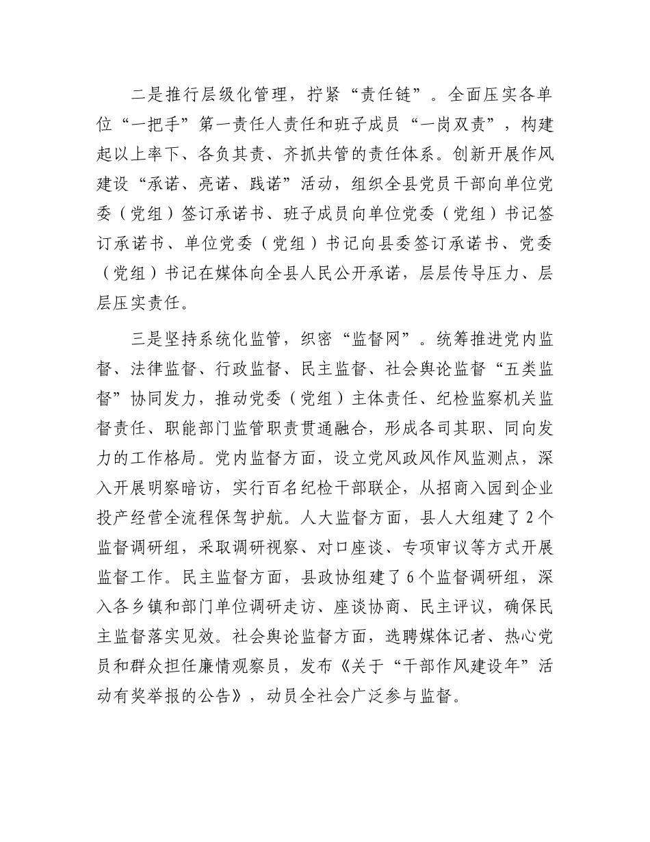 县委书记在全市作风建设专题推进会上的发言尊敬的**书记,各位领导,同志们:加强作风建设是推动全面从严治党向纵深发展的有力抓手,也是建设生态宜居的湖区经济强县的重要保障。近年来,**县坚持以习近平新时代中国特色社会主义思想为指导,全面贯彻落实党的二十大精神,坚持“五化”联动,以过硬作风为高质量发展保驾护航,用作风建设实效“赶考”新征程。一是构建制度化体系,划定“警戒线”。坚持用制度管人、靠制度管事,建立健全作风建设长效机制,以制度化推动作风持续向好。近期,召开了动员部署大会,制定《“干部作风建设年”活动实施方案》,明确重点整治虚假妄为、软弱推诿、不安于位、离心离德、庸碌无为、规越矩、奢靡享乐、偭公权私用“八大作风问题”;出台了干部作风建设“十严禁”规定和优化营商环境“八严禁”要求,采取发放“十严禁”宣传卡片、发送廉政短信、通报明查暗访结果等系列举措,建立起全面的制度体系,为作风建设和优化营商环境工作划好了红线、亮明了底线。二是推行层级化管理,拧紧“责任链”。全面压实各单位“一把手”第一责任人责任和班子成员“一岗双责”,构建起以上率下、各负其责、齐抓共管的责任体系。创新开展作风建设“承诺、亮诺、践诺”活动,组织全县党员干部向单位党委(党组)签订承诺书、班子成员向单位党委(党组)书记签订承诺书、单位党委(党组)书记向县委签订承诺书、党委(党组)书记在媒体向全县人民公开承诺,层层传导压力、层层压实责任。三是坚持系统化监管,织密“监督网”。统筹推进党内监督、法律监督、行政监督、民主监督、社会舆论监督“五类监督”协同发力,推动党委(党组)主体责任、纪检监察机关监督责任、职能部门监管职责贯通融合,形成各司其职、同向发力的工作格局。党内监督方面,设立党风政风作风监测点,深入开展明察暗访,实行百名纪检干部联企,从招商入园到企业投产经营全流程保驾护航。人大监督方面,县人大组建了2个监督调研组,采取调研视察、对口座谈、专项审议等方式开展监督工作。民主监督方面,县政协组建了6个监督调研组,深入各乡镇和部门单位调研走访、座谈协商、民主评议,确保民主监督落实见效。社会舆论监督方面,选聘媒体记者、热心党员和群众担任廉情观察员,发布《关于“干部作风建设年”活动有奖举报的公告》,动员全社会广泛参与监督。四是开展常态化教育,筑牢“思想堤”。坚持思想教育不松劲,充分运用谈心谈话,结合书记课堂、中心组学习等形式常态化开展思想教育,引导党员干部强化规矩意识、纪律意识。坚持自查自纠不松劲,组织全县各级各单位开展一次干部作风调研、一次专题组织生活会、一次作风建设自查自纠,通过自己查、组织点、群众提、互相帮,找出问题症结,制定整改计划,逐项查漏补缺。坚持警示震慑不松劲,持续开展党组织会前“五分钟以案说纪”活动,专门学习“身边案”,切实用“身边事”警醒“身边人”,做到以案为鉴、以案示警、以案明纪。五是推动精准化问责,树好“风向标”。坚持从严问责。对顶风违纪、我行我素的,一律从快从重查处;对单位多人多次违纪的,一律严格落实“一案三查”,坚决做到有错必纠、有责必问,释放越往后盯得越紧、执纪越严的信号。注重容错纠错。严格落实“三个区分开来”,实行容错免责事前备案制度,出台《激励干部担当作为十五条》,旗帜鲜明为敢担当的干部担当,为敢负责的干部负责,大力弘扬真抓实干之风、开拓创新之风、亲企惠民之风,充分调动干部干事创业积极性、主动性、创造性。作风建设永远在路上。下一步,**县将深入贯彻此次会议精神,特别是**书记重要讲话精神,一如既往坚持严字当头、重拳施治、动真碰硬,坚决打好打赢作风建设“主动仗”,进一步提振党员干部精气神,激发干事创业新活力,为建设生态宜居的湖区经济强县提供坚强作风保障!发言完毕,谢谢大家。