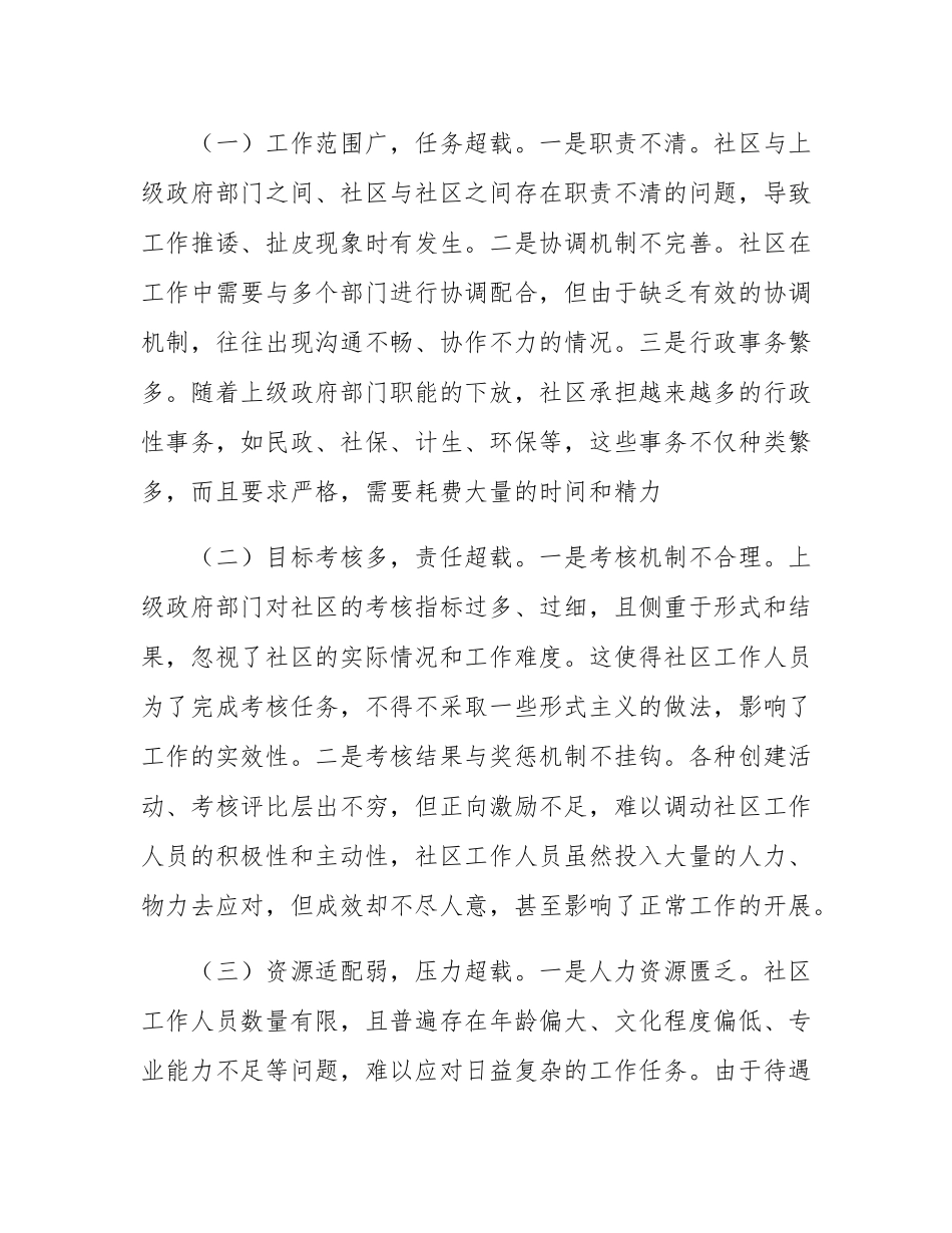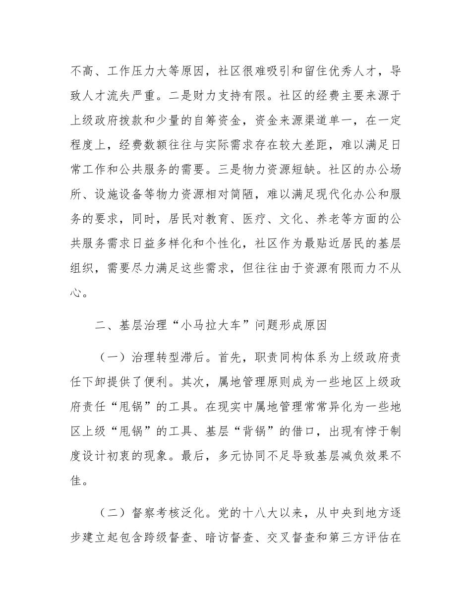 关于多向发力破解“小马拉大车”基层社会治理问题的调研报告总书记强调:“基层强则国家强,基层安则天下安,必须抓好基层治理现代化这项基础性工作。”基层是党的执政之基、力量之源,也是贯彻落实党中央决策部署的“最后一公里”。破解基层治理“小马拉大车”突出问题,是提升基层治理效能、推动基层治理现代化的重要一环。近年来,在党中央统一部署下,各级各部门坚持目标导向和问题导向,注重标本兼治,通过体制机制、技术支撑、组织保障等手段破解“小马拉大车”难题,基层减负取得一定成效,但还存在一些亟需解决的问题。本调研报告以破解“小马拉大车”问题方面存在的挑战及问题为研究对象,同时结合实际情况提出对策建议。一、基层治理“小马拉大车”问题主要表现社区是居民自我管理、自我教育、自我服务的基层群众自治组织,作为基层社会治理的基本单元,在促进经济发展、维护社会稳定、提供公共服务等方面发挥着至关重要的作用。然而,在社区开展基层治理服务工作中,常常面临着“小马拉大车”的困境,主要表现在以下几个方面。(一)工作范围广,任务超载。一是职责不清。社区与上级政府部门之间、社区与社区之间存在职责不清的问题,导致工作推诿、扯皮现象时有发生。二是协调机制不完善。社区在工作中需要与多个部门进行协调配合,但由于缺乏有效的协调机制,往往出现沟通不畅、协作不力的情况。三是行政事务繁多。随着上级政府部门职能的下放,社区承担越来越多的行政性事务,如民政、社保、计生、环保等,这些事务不仅种类繁多,而且要求严格,需要耗费大量的时间和精力(二)目标考核多,责任超载。一是考核机制不合理。上级政府部门对社区的考核指标过多、过细,且侧重于形式和结果,忽视了社区的实际情况和工作难度。这使得社区工作人员为了完成考核任务,不得不采取一些形式主义的做法,影响了工作的实效性。二是考核结果与奖惩机制不挂钩。各种创建活动、考核评比层出不穷,但正向激励不足,难以调动社区工作人员的积极性和主动性,社区工作人员虽然投入大量的人力、物力去应对,但成效却不尽人意,甚至影响了正常工作的开展。(三)资源适配弱,压力超载。一是人力资源匮乏。社区工作人员数量有限,且普遍存在年龄偏大、文化程度偏低、专业能力不足等问题,难以应对日益复杂的工作任务。由于待遇不高、工作压力大等原因,社区很难吸引和留住优秀人才,导致人才流失严重。二是财力支持有限。社区的经费主要来源于上级政府拨款和少量的自筹资金,资金来源渠道单一,在一定程度上,经费数额往往与实际需求存在较大差距,难以满足日常工作和公共服务的需要。三是物力资源短缺。社区的办公场所、设施设备等物力资源相对简陋,难以满足现代化办公和服务的要求,同时,居民对教育、医疗、文化、养老等方面的公共服务需求日益多样化和个性化,社区作为最贴近居民的基层组织,需要尽力满足这些需求,但往往由于资源有限而力不从心。二、基层治理“小马拉大车”问题形成原因(一)治理转型滞后。首先,职责同构体系为上级政府责任下卸提供了便利。其次,属地管理原则成为一些地区上级政府责任“甩锅”的工具。在现实中属地管理常常异化为一些地区上级“甩锅”的工具、基层“背锅”的借口,出现有悖于制度设计初衷的现象。最后,多元协同不足导致基层减负效果不佳。(二)督察考核泛化。党的十八大以来,从中央到地方逐步建立起包含跨级督查、暗访督查、交叉督查和第三方评估在内的督查考核机制。多元化、立体化督查考核机制的应用在很大程度上保证了政策政令畅通与治理目标实现,但一些泛滥的、脱离基层实际的督查考核会导致无效治理,加重基层负担。进而降低基层治理效能。(三)治理规则过密。党的十八大以来,国家在城乡基层治理领域提出了一系列治理目标,同时也匹配了大量的项目资源。为了保障治理目标实现,上级政府倾向于缩小基层的自由裁量空间,并对相应的工作形式提出更高要求,导致了严重的“痕迹主义”、滥用的“顶格管理”、频现的“层层加码”。三、提升基层治理方式的对策建议(一)优化权责事项“为车减负”。“小马”拉不动“大车”是因为马力小、动力...