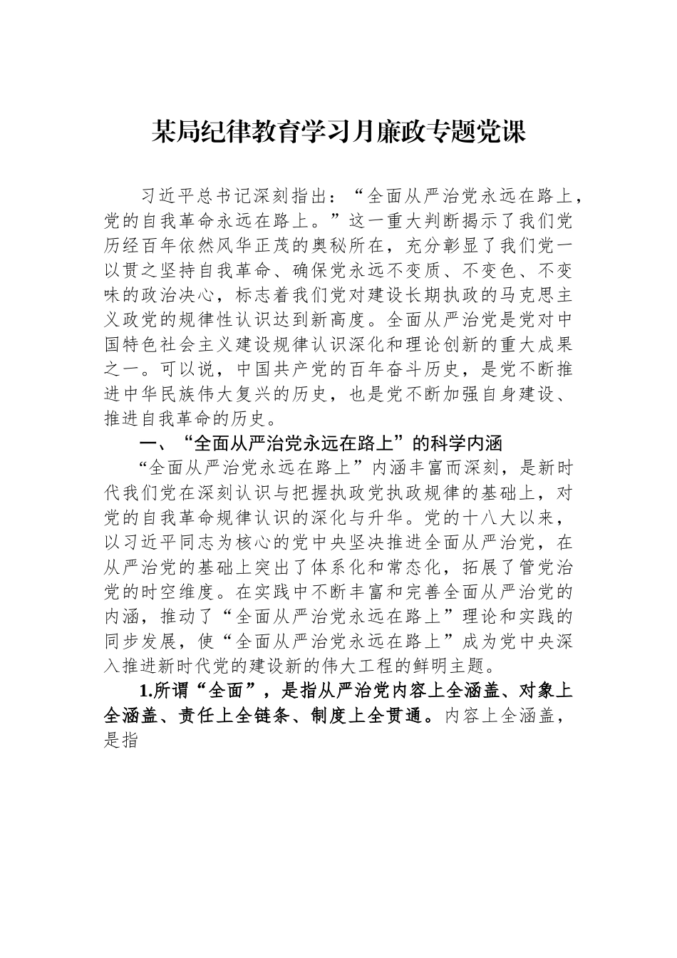 某局纪律教育学习月廉政专题党课习近平总书记深刻指出:“全面从严治党永远在路上,党的自我革命永远在路上。”这一重大判断揭示了我们党历经百年依然风华正茂的奥秘所在,充分彰显了我们党一以贯之坚持自我革命、确保党永远不变质、不变色、不变味的政治决心,标志着我们党对建设长期执政的马克思主义政党的规律性认识达到新高度。全面从严治党是党对中国特色社会主义建设规律认识深化和理论创新的重大成果之一。可以说,中国共产党的百年奋斗历史,是党不断推进中华民族伟大复兴的历史,也是党不断加强自身建设、推进自我革命的历史。一、“全面从严治党永远在路上”的科学内涵“全面从严治党永远在路上”内涵丰富而深刻,是新时代我们党在深刻认识与把握执政党执政规律的基础上,对党的自我革命规律认识的深化与升华。党的十八大以来,以习近平同志为核心的党中央坚决推进全面从严治党,在从严治党的基础上突出了体系化和常态化,拓展了管党治党的时空维度。在实践中不断丰富和完善全面从严治党的内涵,推动了“全面从严治党永远在路上”理论和实践的同步发展,使“全面从严治党永远在路上”成为党中央深入推进新时代党的建设新的伟大工程的鲜明主题。1.所谓“全面”,是指从严治党内容上全涵盖、对象上全涵盖、责任上全链条、制度上全贯通。内容上全涵盖,是指党的建设推进到哪里,全面从严治党体系就要构建到哪里,全面从严治党涵盖党的建设各方面,既包括政治建设、思想建设、组织建设、作风建设、纪律建设,也包括制度建设及反腐败斗争的方方面面。对象上全覆盖,是指全面从严治党要管全党、治全党,从严抓好领导干部队伍党员队伍、各级党组织建设,尤其是要抓住“关键少数”以上率下。责任上全链条,是指依据党内法规,各级党委(党组)都要全面压紧压实从严治党主体责任,各级纪委要担负起监督责任、敢于执纪问责,增强管党治党意识、落实管党治党责任。制度上全贯通,是指用制度促进全面从严治党各个体系贯通联动,推动反腐败工作制度化、法治化、规范化,真正实现制度治党、依规治党。从党中央公开通报的数据上看,新制定修订的党内法规占比超过70%,现行有效党内法规近4000部。在建党百年时,我们党宣告形成比较完善的党内法规体系。要做到“全面”,就要树立系统思维,确立整体观念,用普遍联系的观点,认真分析全面从严治党各个要素的功能作用及其相互关系,从多个方面、多维主体出发,形成党建合力,推动全面从严治党向纵深发展,把党建设成为坚强的领导核心。2.“从严治党”关键在严,体现在“真”和“敢”上。做到真管真严、敢管敢严、长管长严,是对党的建设长期性、复杂性、艰巨性的科学回应。治国必先治党,治党务必从严。从严治党,就是要做到无禁区,保证“从严”落实于各领域、各环节、各主体,做到规矩面前人人平等;设立严标准,严打腐败苗头,严惩腐败行为,在强化震慑力的同时树立规矩的权威。首先,从严是一种态度,真正做到从严要有真管、敢管的责任感,明确职责并将自身职责落实到位。要严在态度、严在细节、严在行动、严在落实,要敢于突破利益固化的藩篱,要“以猛药去疴、重典治乱的决心,以刮骨疗毒、壮士断腕的勇气”,坚持惩治不放松,保持高压态势推进全面从严治党向纵深发展。在党的二十大召开期间,中央纪委副书记、国家监委副主任肖培对外公布了的一组数据:党的十八大以来,全国纪检监察机关共立案464.8万余件。其中,立案审查调查中管干部553人,处分厅局级干部2.5万多人、县处级干部18.2万多人。这些数据充分彰显出党中央从严管理、一视同仁,无禁区、不设限的态度。其次,从严治党是指制定严格纪律、规矩。强化纪律建设、制度建设至关重要,各级党组织要认真贯彻执行《中国共产党廉洁自律准则》《中国共产党纪律处分条例》等规章制度,使其真正成为“带电的高压线”,营造守纪律、讲规矩的良好氛围。3.“永远在路上”是指全面从严治党是一个长期的过程,这个实践过程没有终点,只有进行时。“永远在路上”,既是我们党百年来建党治党的经验总结,也是党应对长期存在的诸多考验和危险的客观需要。历史证明,我们党历经千锤百炼依然风...