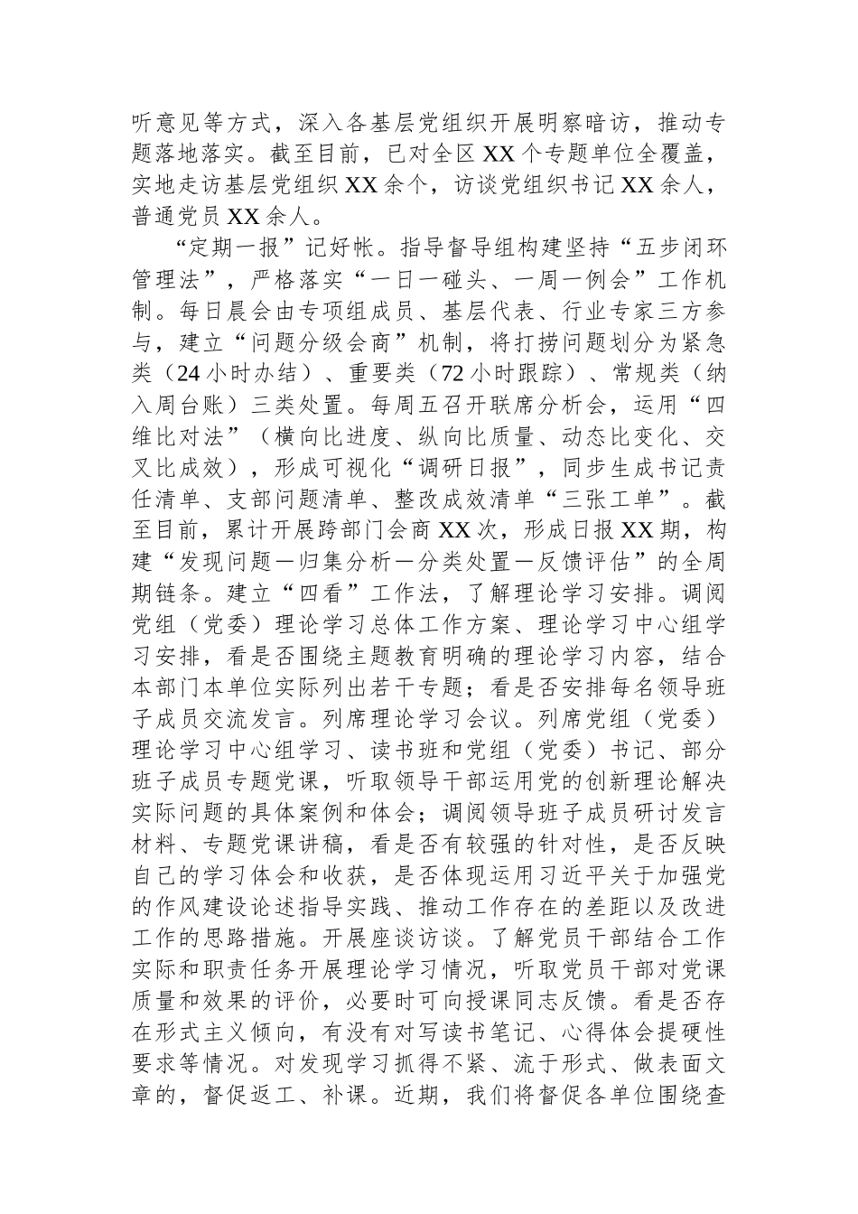 专题指导督导工作经验汇报根据工作要求,现将XX区开展深入贯彻中央八项规定精神专题指导督导工作情况汇报如下。自专题开展以来,XX区委始终坚持将学习贯彻中央八项规定及其实施细则精神和《习近平关于加强党的作风建设论述摘编》作为重大政治任务和长期战略任务,聚焦四个方面任务总要求,深入学习领悟以总书记关于党的作风建设的丰富内涵,切实把专题成效转化为助推全区经济社会发展和党的建设的生动实践。XX月XX日,省委统一部署专题指导督导工作以来,XX区针对不同层级、不同领域、不同对象实际,采取“定期访报评”方式,精准开展分类指导,推进专题有效覆盖,走深走实。“定期一访”查问题。坚持问题导向和目标导向,聚焦农村、社区、机关、国企、“三新”组织、学校、医院等领域分类制定基层党组织专题指导细则。区委专题工作专班下派五个指导督导组,第一时间组织召开督导工作动员会议,认真传达学习习近平总书记重要讲话精神、省委书记XX同志在全省督导动员大会上的讲话精神和省委常委、组织部长XX在培训会上的讲话精神,就加强政治纪律、工作纪律、保密纪律、廉洁纪律提出明确要求,做到以自身正、自身硬、自身廉示范带动被指导单位。各督导组坚决扛起指导督导政治责任,落细落实“指导别人先武装自己”要求,坚持学习在前、部署在前、行动在前,推动指导督导工作往实里抓、朝实里做,努力创造第一等工作成绩。建立机制、明确分工,确保指导有力有序,各督导组定期召开指导督导组组务会议,研究制定本组《指导督导工作方案》,做到同题共商共做共答,确保指导督导工作高起点、稳步有序推进。根据统一部署,各督导组每天通过“四不两直”,采取看现场、谈书记、访党员、查资料听意见等方式,深入各基层党组织开展明察暗访,推动专题落地落实。截至目前,已对全区XX个专题单位全覆盖,实地走访基层党组织XX余个,访谈党组织书记XX余人,普通党员XX余人。“定期一报”记好帐。指导督导组构建坚持“五步闭环管理法”,严格落实“一日一碰头、一周一例会”工作机制。每日晨会由专项组成员、基层代表、行业专家三方参与,建立“问题分级会商”机制,将打捞问题划分为紧急类(24小时办结)、重要类(72小时跟踪)、常规类(纳入周台账)三类处置。每周五召开联席分析会,运用“四维比对法”(横向比进度、纵向比质量、动态比变化、交叉比成效),形成可视化“调研日报”,同步生成书记责任清单、支部问题清单、整改成效清单“三张工单”。截至目前,累计开展跨部门会商XX次,形成日报XX期,构建“发现问题-归集分析-分类处置-反馈评估”的全周期链条。建立“四看”工作法,了解理论学习安排。调阅党组(党委)理论学习总体工作方案、理论学习中心组学习安排,看是否围绕主题教育明确的理论学习内容,结合本部门本单位实际列出若干专题;看是否安排每名领导班子成员交流发言。列席理论学习会议。列席党组(党委)理论学习中心组学习、读书班和党组(党委)书记、部分班子成员专题党课,听取领导干部运用党的创新理论解决实际问题的具体案例和体会;调阅领导班子成员研讨发言材料、专题党课讲稿,看是否有较强的针对性,是否反映自己的学习体会和收获,是否体现运用习近平关于加强党的作风建设论述指导实践、推动工作存在的差距以及改进工作的思路措施。开展座谈访谈。了解党员干部结合工作实际和职责任务开展理论学习情况,听取党员干部对党课质量和效果的评价,必要时可向授课同志反馈。看是否存在形式主义倾向,有没有对写读书笔记、心得体会提硬性要求等情况。对发现学习抓得不紧、流于形式、做表面文章的,督促返工、补课。近期,我们将督促各单位围绕查摆问题的整改,组织召开一次理论学习中心组集体学习。“七一”前后,重点督促党员领导干部认真讲好专题党课对党委(党组)书记的党课稿,提前调阅。建立“双向交办+跟踪问效”整改体系,对现场交办的XX类问题实施“四定管理”(定责任人、定措施、定时限、定标准),创新“三色预警”动态销号制度,对逾期未整改事项亮红灯督办XX件,对整改成效反弹事项发黄牌警示XX次。针对农村、社区、“两新”等6类党组织差异,编制...