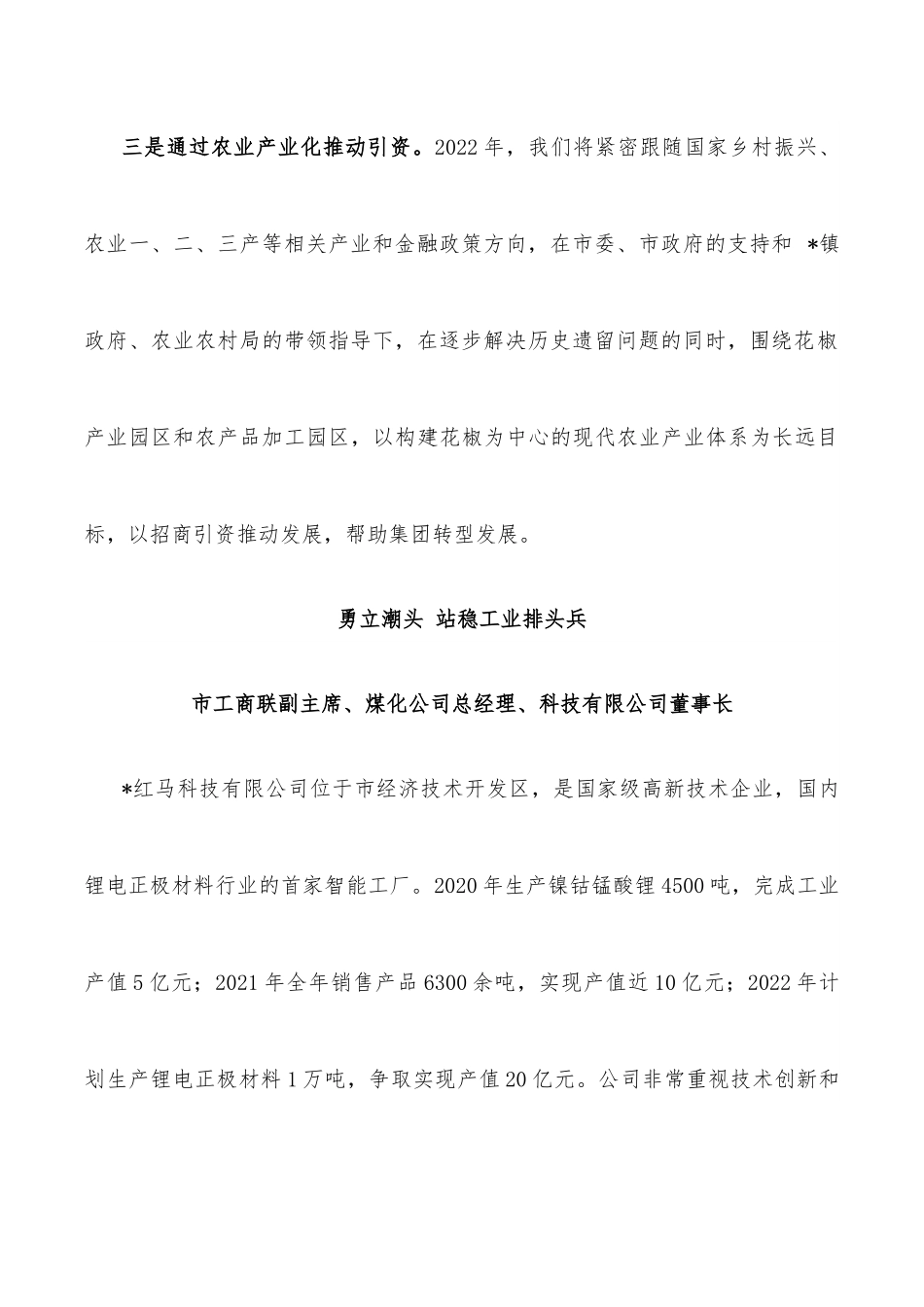 全市招商引资工作会议发言材料(3篇)凝心聚力转型发展以招商引资推动项目早落地落地项目早达产市城投集团董事长近几年来,城投集团紧紧围绕平台公司转型“1+2+2+N”的战略部署,以国企改革三年行动工作任务和企业高质量发展为目标,按照市政府确定的三年行动方案,一手抓债务化解,一手抓转型发展,确立了城市运营、城市发展等6个板块方向,努力实现转型突围。一是通过做好城市运营服务招商引资。2022年度,城投集团将继续以特许经营权为主要方向,以正在推动的静脉产业园建设、污水资源再生利用、城市交通服务等项目为主要载体,与行业龙头企业、专业服务提供商广泛接触,引进社会资本共同参与项目建设与运营,搭建高效优质的城市运营服务平台;依托城市现有资源,继续以引进中石油等有实力的企业开展合作,推动我市在环境治理、资源市场化高效盘活与利用等方面引央企、引强企。二是通过推动片区发展招商引资。集团将选择城市小片区或者发展主轴线作为片区发展的着力点,做实城市运营商的主体定位。通过策划、规划谋划主题定位综合发展,为招商拓展新的落地空间,在推动过程中,我们将主动配合相关部门、镇办,锚定定位,在片区的发展中逐步成为投资合作平台、招商服务平台,未来继而成为运营服务平台,通过城市功能的聚集、完善和提升开展招商引资工作推动发展。三是通过农业产业化推动引资。2022年,我们将紧密跟随国家乡村振兴、农业一、二、三产等相关产业和金融政策方向,在市委、市政府的支持和*镇政府、农业农村局的带领指导下,在逐步解决历史遗留问题的同时,围绕花椒产业园区和农产品加工园区,以构建花椒为中心的现代农业产业体系为长远目标,以招商引资推动发展,帮助集团转型发展。勇立潮头站稳工业排头兵市工商联副主席、煤化公司总经理、科技有限公司董事长*红马科技有限公司位于市经济技术开发区,是国家级高新技术企业,国内锂电正极材料行业的首家智能工厂。2020年生产镍钴锰酸锂4500吨,完成工业产值5亿元;2021年全年销售产品6300余吨,实现产值近10亿元;2022年计划生产锂电正极材料1万吨,争取实现产值20亿元。公司非常重视技术创新和产品研发工作,投资5000余万元建设新能源材料研究院。形成600㎡的研发办公场所、建成3000㎡的研发中心和1400㎡的全电池测试线与理化分析测试系统,相继与北京理工大学、复旦大学、哈尔滨工业大学等高校建立产学研合作关系,站在引领市场、推送新品的前列,已获批20余项国家发明专利。公司产品广泛应用于3C数码领域、电动工具和航模等小型动力领域、新能源汽车动力领域和储能电站领域,应用终端客户有TTI创科、德国博世、百得等,产品遍布中国、美国、欧洲等市场。公司先后荣获“专精特新”小巨人企业、绿色工厂、省级企业技术中心、工程技术研究中心和*市级专家工作站等资格认定和诸多殊荣,成功入选*省2022年度“科学家+工程师”队伍名单,并正式启动IPO工作。作为*市市民营企业家中的一员,自己还兼任*市人大代表、*市市政协常委、*市市工商联副主席、*市市总商会副会长等社会职务。回首过往,也曾在北京、在世界500强打拼过,但最终还是毅然返乡创业、投身家乡经济发展的热潮。*市的发展离不开本地企业家的倾情奉献,离不开全体市民的共同呵护,更离不开各级领导的大力支持;亲商爱商的营商环境、亲清政商关系,我们每一位都是重要的参与者、建设者、获益者。借此,我想与各企业家群体共同呼吁:以习近平新时代中国特色社会主义思想为引领,坚决贯彻落实市委、市政府的决策部署,重整行装再出发、浴火重生开新局,沿着“十四五”擘画的清晰方向,努力调结构、保产能、优工艺、延链条、增业态、创效益,为*市经济社会的高质量发展贡献企业家的力量;同时,充分发挥行业优势,招商引资、招才引智,强化与上下游合作伙伴的工作互动、产业协作、互惠共赢、深度合作,为全市招商引资工作“拾薪添柴”,为全市产业升级转型增添动能,不辜负“招商大使”的光荣称号;在企业发展壮大的同时,我们也将勇于承担更多的社会责任,在生态环保、安全稳定、乡村振兴、共同富裕等方面身先士卒、做出表率,为把*市建设成为黄河沿岸区域性...
