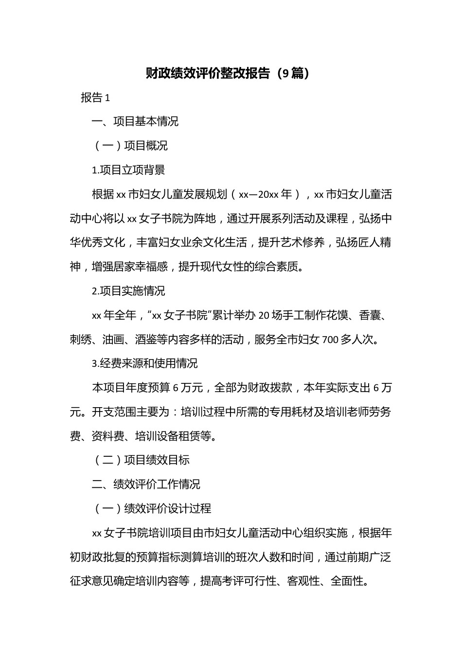 财政绩效评价整改报告(9篇)报告1一、项目基本情况(一)项目概况1.项目立项背景根据xx市妇女儿童发展规划(xx—20xx年),xx市妇女儿童活动中心将以xx女子书院为阵地,通过开展系列活动及课程,弘扬中华优秀文化,丰富妇女业余文化生活,提升艺术修养,弘扬匠人精神,增强居家幸福感,提升现代女性的综合素质。2.项目实施情况xx年全年,“xx女子书院”累计举办20场手工制作花馍、香囊、刺绣、油画、酒鉴等内容多样的活动,服务全市妇女700多人次。3.经费来源和使用情况本项目年度预算6万元,全部为财政拨款,本年实际支出6万元。开支范围主要为:培训过程中所需的专用耗材及培训老师劳务费、资料费、培训设备租赁等。(二)项目绩效目标二、绩效评价工作情况(一)绩效评价设计过程xx女子书院培训项目由市妇女儿童活动中心组织实施,根据年初财政批复的预算指标测算培训的班次人数和时间,通过前期广泛征求意见确定培训内容等,提高考评可行性、客观性、全面性。(二)绩效评价框架,包括绩效评价原则、评价指标体系、绩效标准和评价方法等根据财政部门有关文件要求,围绕主要指标进行绩效评价,设计关键指标。1.绩效评价原则绩效评价结合培训工作实际情况,按照设定的绩效目标,运用合理的评价方法、对照标准,进行客观、公正地评价。2.评价指标体系指标主要根据财政部门设置的指标、绩效评价管理制度及单位职能职责、发展规划、年度工作计划、年度绩效目标制定,选取科学、灵活,具有可操作性,贴近实际。其中:产出(一级指标)60分,分为4个分指标(二级指标)。效果(一级指标)20分,分为1个分指标(二级指标)。服务对象满意度指标20分,分为1个分指标(二级指标)3.绩效标准坚持客观、符合实际原则,根据项目设置分值,评价打分。4.评价方法采用最直接比对方法,对比绩效指标完成情况评分,在此基础上进行评价(三)证据收集方法1.着重资料的搜集,包括开展培训的.方案、培训材料,培训过程、成果展等照片;2.学员回访情况材料(四)绩效评价实施过程评价工作由活动宣传部、财务部负责。据项目绩效目标进行,一是前期了解基本情况、设计指标体系;二是收集信息资料,三是数据分析、评价,形成报告。三、绩效分析及评价结论(一)绩效分析1.投入项目资金共6万元,全部按时足额拨付到位,2.过程项目支出严格按相关规定处理,手续完备,及时收集有关资料并归档,确保项目实施规范化。3.产出xx年xx女子书院培训项目共开展了20场培训,受训妇女人数700名。参加培训的妇女掌握了所培训的技能,经费支出成本控制在6万元。4.效果xx年3月成立xx市“xx女子书院”,拓宽活动渠道,优化活动项目,积极打造的女性“美育”基地,通过开展系列活动及课程,弘扬中华优秀文化,提升现代女性综合素质,今年以来,中心积极总结经验,着力将中心目前的品牌活动打造成为可持续性、可订制性、可优化性的活动。一是“xx女子书院”不断丰富书院活动内容、创新书院活动形式,凸显书院的品牌效应,走入各中小院校、市直机关单位开展职工培训,面向社会提供订单式优质服务xx日报、xx晚报生活报等主流媒体以及今日头条刊登了活动相关的信息。5.绩效目标完成情况分析。(1)培训人数绩效目标为600人,实际培训700人。(2)培训学员技能掌握率绩效目标为100%,实际为100%。(3)培训时间绩效目标为年内完成,实际完成时间为年内完成。(4)经费控制目标为6万元,实际支出为6万元。(5)学员抽样满意度目标为90%,实际为90%(二)评价结论1.评分结果:100分2.主要结论该项目工作与经费管理规范,按计划完成,社会效益较好,项目可持续性强,服务对象总体较满意。四、主要经验及做法、存在的问题和建议(一)主要经验及做法xx市妇女儿童活动中心整合多方资源,xx女子书院还走出中心,将服务送到各行各业,满足妇女的精神文化需求。通过狠抓活动质量,突出活动特色,以“xx女子书院”为活动载体,积极打造家庭教育示范基地的亮丽名片。根据全市妇女儿童群众以及家庭需求,充分整合优势资源,丰富活动形式和内容,打造中心特色活动和课程,为建设美丽xx、提升xx女性“美”贡献力量。(二)存在的问题...