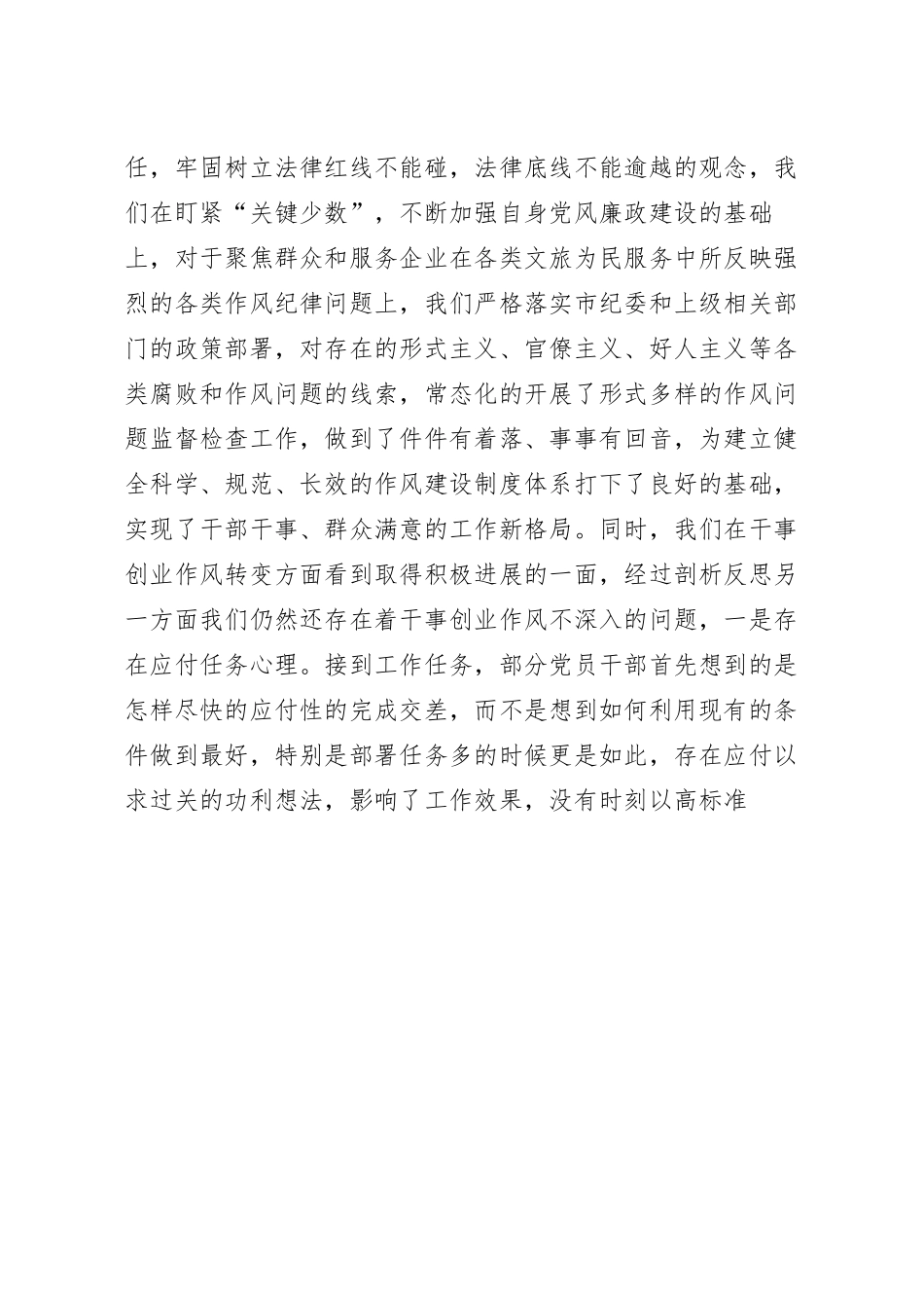 文化和旅游局领导班子党性问题剖析现将局领导班子党性问题剖析如下:一、存在的问题(一)政策理论修养方面。我们通过建立健全规范“三会一课”各类学习管理制度,并以习近平新时代中国特色社会主义思想和党的十九大会议精神为行动指南,抓好党委理论中心组学习和专题交流研讨,积极落实意识形态责任制,强化了主流意识形态思想引领,进一步提高了广大党员领导干部的政治理论水平,广大党员领导干部把方向、谋大局、定政策、促发展的能力得到了进一步加强,为文旅工作向前迈进提供了强大的精神动力和发展定力。在看到成绩的同时,部分党员领导干部在一定程度上还存在着政策理论修养不高的问题,一是主动学习自觉性不高。存在以干代学的现象,特别是当工作与学习发生矛盾时,往往认为学习不是硬任务,可以往后推一推,导致学习的主动性和积极性、系统性不强,学习效果不佳,有部分干部忙于工作应酬,出现了“重业务完成,轻理论学习”的不良思想倾向。二是学习制度坚持的不好。客观上强调工作忙、压力大和事务性工作较多,缺乏持之以恒自觉学习政治理论的主动精神。三是学用结合的关系没有处理好。在理论体系把握上和融汇贯通去指导实际工作上不适应,忽视了理论对业务工作的指导作用,导致理论学习与业务工作脱节,对待理论学习,就学习论学习,不能有效的与业务工作紧密结合起来。(二)干事创业作风方面。为了严格履行作风建设主体责任,牢固树立法律红线不能碰,法律底线不能逾越的观念,我们在盯紧“关键少数”,不断加强自身党风廉政建设的基础上,对于聚焦群众和服务企业在各类文旅为民服务中所反映强烈的各类作风纪律问题上,我们严格落实市纪委和上级相关部门的政策部署,对存在的形式主义、官僚主义、好人主义等各类腐败和作风问题的线索,常态化的开展了形式多样的作风问题监督检查工作,做到了件件有着落、事事有回音,为建立健全科学、规范、长效的作风建设制度体系打下了良好的基础,实现了干部干事、群众满意的工作新格局。同时,我们在干事创业作风转变方面看到取得积极进展的一面,经过剖析反思另一方面我们仍然还存在着干事创业作风不深入的问题,一是存在应付任务心理。接到工作任务,部分党员干部首先想到的是怎样尽快的应付性的完成交差,而不是想到如何利用现有的条件做到最好,特别是部署任务多的时候更是如此,存在应付以求过关的功利想法,影响了工作效果,没有时刻以高标准严格要求自己。二是工作创新意识不足。在部分工作中,由于存在一定的惰性思想,往往局限于被动的按照上级布置什么做什么,对于创新性的想法停留于心动而无行动的状态,没有充分发挥主观能动性。三是工作方法较简单。部分干部工作作风漂浮,在深入基层群众和服务企业调查研究上不够,再加上与同志间的思想交流不多,对全市文旅工作指导和督促不够深入,致使工作效果不够理想。(三)群众服务意识方面。我们以文旅为民群众满意为标杆,通过把干部生态治理、“四风”整治、构建“亲”“清”新型政商关系等系列活动贯穿于各项文旅业务的始终,通过扎实推进党员干部服务效能提升,大力推进清单管理制度建设,强化部门完善工作机制协调联动,建立健全权力运行约束机制,进一步提高了各科室、各部门的服务质量和工作效率,着力营造了风清气正的良好政治生态,有效压制了特权行为和特权现象抬头,大大提升了办事群众和服务企业对我局各项工作服务的满意度和获得感。在得到群众对我们工作肯定的同时,我们也应该看到部分党员领导干部在群众服务意识上仍然不是很高的问题存在,一是下基层调研主动性不强。在下基层工作中,有时往往只注重了解自己想要了解的问题,未能真正做到“从群众中来,到群众中去”,没有关心群众想什么、急什么、要什么,缺乏全心全意为人民服务的主动性。二是联系基层群众不广泛。在工作上对基层情况的了解有时候主要靠听汇报和抽查,对基层群众和服务企业了解的不全面不具体,帮助干部职工解决实际困难不多,群众服务意识不强。三是处理能力水平滞后。部分党员领导干部缺乏做群众工作的基本功,思想僵化,墨守成规,依法行政水平不高,开拓创新不够,处理棘手问题、驾...