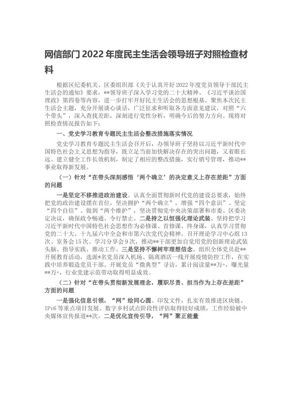 网信部门2022年度民主生活会领导班子对照检查材料根据区纪委机关、区委组织部《关于认真开好2022年度党员领导干部民主生活会的通知》要求,**领导班子深入学习党的二十大精神、《习近平谈治国理政》第四卷等内容,进一步打牢开好民主生活会的思想根基。聚焦本次民主生活会主题,充分开展谈心谈话,广泛征求和听取各方面意见建议,对照“六个带头”,深入查找差距,深刻进行党性分析,明确今后的努力方向。现将对照检查情况报告如下:一、党史学习教育专题民主生活会整改措施落实情况党史学习教育专题民主生活会召开后,办领导班子坚持以习近平新时代中国特色社会主义思想为指导,既立足当前加快解决存在的突出问题,又着眼长远、建立健全工作长效机制,制定了相应的整改措施,实行销号管理,推动**事业取得新发展。(一)针对“在带头深刻感悟‘两个确立’的决定意义上存在差距”方面的问题一是坚定不移推进政治建设。认真全面贯彻新时代党的建设总要求,始终把党的政治建设摆在首位,坚决拥护“两个确立”,增强“四个意识”、坚定“四个自信”、做到“两个维护”,坚决贯彻党中央决策部署和市委、区委决定决议,确保政令畅通、令行禁止。二是持之以恒强化理论武装。坚持把学习习近平新时代中国特色社会思想作为必修课、首修课、终身课,认真学习贯彻党的二十大、十九届六中全会和市第六次党代会精神。召开理论学习中心组13次、室务会15次、学习分享会9次,推动**干部更加自觉用党的创新理论武装头脑、指导实践、推动工作。三是坚持不懈树牢理想信念。组织全体党员赴**开展教育活动,选派*名党员深入机场、隔离酒店一线开展疫情防控工作,在实践中培养锻造党员干部。开展党员“微典型”寻访,累计阅读量**万+,曝光量**万+,行业党建示范带动取得明显成效。(二)针对“在带头贯彻新发展理念,履职尽责、担当作为上存在差距”方面的问题一是强化信息引领,“网”绘同心圆。印发文件,扎实有效推进区块链、IPv6等重点项目发展。数字乡村试点阶段性评估取得较好成绩,工作经验被中央媒体宣传报道**次。二是优化宣传引导,“网”聚正能量。开展自主宣传活动**个、制作新媒体作品**个,*项原创策划被纳入全市重点项目,策划开展上亿级流量主题宣传活动*个。建立全区**人的四级网评指挥响应体系,打造评论品牌,**篇网评文章被中央全网推送,实现全域精准圈群引导。三是强化监管导控,“网”筑新生态。上线互联网违法和不良信息举报平台,建立网络执法协调联动机制,累计排查检查网络平台**个,开展辟谣**次,处置有害信息**条、账号**个,移交线索**条,切实守牢网络意识形态主阵地。(三)针对“在带头践行以人民为中心的发展思想上存在差距”方面的问题一是“速”字为先,舆情导控系统化。建立“3+N+1”舆情导控机制,推行“五步工作法”,累计制定专项预案**个,报送《**舆情》**期,转办涉区舆情**条次、回复率达96%,妥善处置突发敏感网络舆情**件,全区舆情平稳可控。二是“实”字为要,行业管理规范化。在全市率先成立互联网协会,吸纳优秀互联网企业、网红大V等**个单位及个人为会员单位,承办“**”助力脱贫攻坚公益行动、资助贫困家庭学生**名,开展“**”行动、捐款捐物超**万。三是“效”字为重,网络普法常态化。利用“网、端、微、号”全平台宣发普法信息**余次、浏览量超**万人次,开展网络安全宣传周活动、发放宣传资料**万份,原创H5作品“**”阅读量超**万余次,持续营造良好普法氛围。(四)针对“在带头应对风险挑战、提高能力本领上存在差距”方面的问题一是在服务保障“二十大”上下功夫,做好“氛围”文章。围绕迎接服务保障和学习宣传贯彻党的二十大工作主线,累计指导整改问题**个、处置属地不规范表述**条,发布原创作品**余个,开展舆论引导覆盖530万人次,网上舆论氛围热烈有序。二是在导控处置“涉疫情”上花力气,做好“回应”文章。针对**疫情,通过“技术+人工”方式累计监测疫情相关信息**万条、全网阅读量**亿次,梳理网民建议**条,转办相关舆情**条,及时辟谣*次。三是在贯彻落实“保安全”上花力气,做好“防护”文章。出台文件,组建专家组和技...