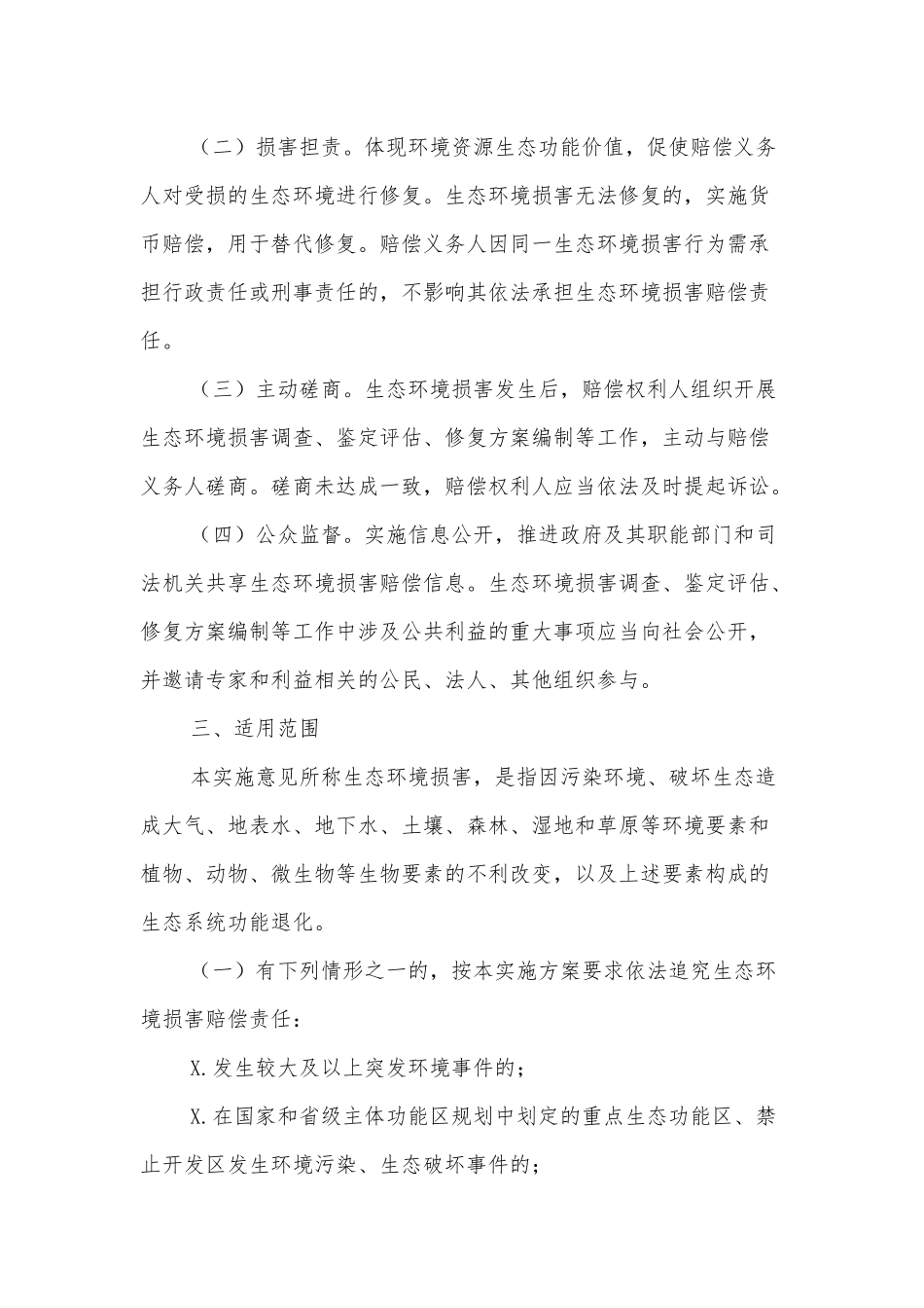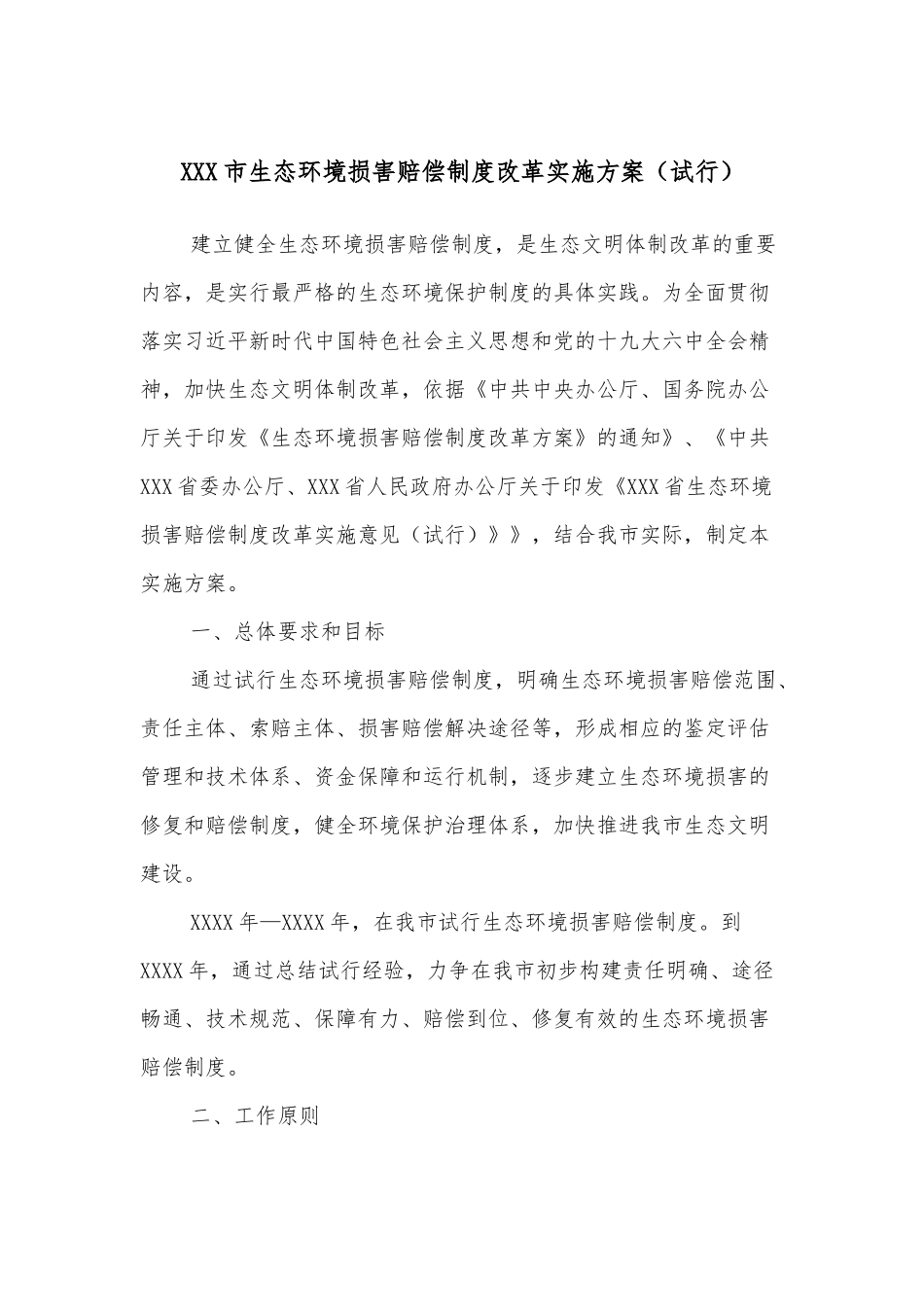 XXX市生态环境损害赔偿制度改革实施方案(试行)建立健全生态环境损害赔偿制度,是生态文明体制改革的重要内容,是实行最严格的生态环境保护制度的具体实践。为全面贯彻落实习近平新时代中国特色社会主义思想和党的十九大六中全会精神,加快生态文明体制改革,依据《中共中央办公厅、国务院办公厅关于印发《生态环境损害赔偿制度改革方案》的通知》、《中共XXX省委办公厅、XXX省人民政府办公厅关于印发《XXX省生态环境损害赔偿制度改革实施意见(试行)》》,结合我市实际,制定本实施方案。一、总体要求和目标通过试行生态环境损害赔偿制度,明确生态环境损害赔偿范围、责任主体、索赔主体、损害赔偿解决途径等,形成相应的鉴定评估管理和技术体系、资金保障和运行机制,逐步建立生态环境损害的修复和赔偿制度,健全环境保护治理体系,加快推进我市生态文明建设。XXXX年—XXXX年,在我市试行生态环境损害赔偿制度。到XXXX年,通过总结试行经验,力争在我市初步构建责任明确、途径畅通、技术规范、保障有力、赔偿到位、修复有效的生态环境损害赔偿制度。二、工作原则(一)依法推进。按照相关法律法规规定,结合我市实际,由易到难、稳妥有序开展生态环境损害赔偿制度改革工作。对法律法规未作规定的具体问题,根据需要提出政策和立法建议。(二)损害担责。体现环境资源生态功能价值,促使赔偿义务人对受损的生态环境进行修复。生态环境损害无法修复的,实施货币赔偿,用于替代修复。赔偿义务人因同一生态环境损害行为需承担行政责任或刑事责任的,不影响其依法承担生态环境损害赔偿责任。(三)主动磋商。生态环境损害发生后,赔偿权利人组织开展生态环境损害调查、鉴定评估、修复方案编制等工作,主动与赔偿义务人磋商。磋商未达成一致,赔偿权利人应当依法及时提起诉讼。(四)公众监督。实施信息公开,推进政府及其职能部门和司法机关共享生态环境损害赔偿信息。生态环境损害调查、鉴定评估、修复方案编制等工作中涉及公共利益的重大事项应当向社会公开,并邀请专家和利益相关的公民、法人、其他组织参与。三、适用范围本实施意见所称生态环境损害,是指因污染环境、破坏生态造成大气、地表水、地下水、土壤、森林、湿地和草原等环境要素和植物、动物、微生物等生物要素的不利改变,以及上述要素构成的生态系统功能退化。(一)有下列情形之一的,按本实施方案要求依法追究生态环境损害赔偿责任:X.发生较大及以上突发环境事件的;X.在国家和省级主体功能区规划中划定的重点生态功能区、禁止开发区发生环境污染、生态破坏事件的;X.在国家和省级主体功能区规划中划定的重点生态功能区、禁止开发区以外,发生造成生态功能显著下降或者丧失的环境污染、生态破坏事件的;X.发生其他影响较大、赔偿权利人认为有必要追偿的环境污染、生态破坏事件的。启动依法追究生态环境损害赔偿责任的具体标准见附件一;我市范围内国家和省级主体功能区规划中划定的重点生态功能区、禁止开发区名录见附件二。(二)以下情形不适用本实施方案:涉及人身伤害、个人和集体财产损失要求赔偿的,适用侵权责任法等法律规定。四、工作内容(一)明确赔偿范围。生态环境损害赔偿范围包括清除污染费用、生态环境修复费用、生态环境修复期间服务功能的损失、生态环境功能永久性损害造成的损失以及生态环境损害赔偿调查、鉴定评估等合理费用。(二)确定赔偿义务人。违反法律法规,造成生态环境损害的单位或者个人,应当承担生态环境损害赔偿责任,做到应赔尽赔。现行民事法律和资源环境保护法律有相关免除或减轻生态环境损害赔偿责任规定的,按相应规定执行。(三)明确赔偿权利人。市政府作为本行政区域内生态环境损害赔偿权利人。市政府指定市生态环境局(原环保局)、市自然资源和规划局(原国土局)、市农业农村局(原农委)、市水务局、市林业和草原局(原林业局、原畜牧兽医局)等部门负责其职责范围内的生态环境损害赔偿具体工作,案件所在地的区、县(市)政府应当予以配合。市政府及其指定的部门有权提起诉讼。跨市(地)或者影响较大的生态环境损害,按职责分工由负责生态环境损害赔偿具体案件的...