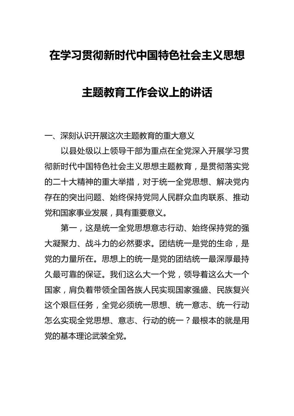 在学习贯彻新时代中国特色社会主义思想主题教育工作会议上的讲话一、深刻认识开展这次主题教育的重大意义以县处级以上领导干部为重点在全党深入开展学习贯彻新时代中国特色社会主义思想主题教育,是贯彻落实党的二十大精神的重大举措,对于统一全党思想、解决党内存在的突出问题、始终保持党同人民群众血肉联系、推动党和国家事业发展,具有重要意义。第一,这是统一全党思想意志行动、始终保持党的强大凝聚力、战斗力的必然要求。团结统一是党的生命,是党的力量所在。思想上的统一是党的团结统一最深厚最持久最可靠的保证。我们这么大一个党,领导着这么大一个国家,肩负着带领全国各族人民实现国家强盛、民族复兴这个艰巨任务,全党必须统一思想、统一意志、统一行动怎么实现全党思想、意志、行动的统一?最根本的就是用党的基本理论武装全党。我们党始终高度重视理论武装,每逢重大历史关头,都要用党的创新理论统一全党思想,每次党内集中教育也都坚持把理论学习作为首要任务并贯穿始终,为全党团结统一奠定坚实思想基础。今天,我们党带领全国各族人民迈上了全面建设社会主义现代化国家、全面推进中华民族伟大复兴的新征程,要更好肩负起新时代新征程党的使命任务,迫切需要用新时代中国特色社会主义思想武装头脑指导实践、推动工作。党的十八大以来,伴随着新时代中国特色社会主义思想在实践中形成发展的历程,我们持续推动用党的创新理论武装全党,取得了明显成效。但是,理论武装的任务仍然艰巨。一方面,在真学真信真用、学懂弄通做实方面,还存在一些需要引起重视的问题。有的党员、干部理论学习兴趣不浓,学不进去,学习走形式装样子;有的学习不系统不深入,一知半解、浅尝辄止,知其然不知其所以然有的学用脱节,学归学做归做,不善于把学习成果转化为干事创业的实际本领,等等。这些问题表明,党的理论武装工作不能搞形式,必须持续往深里走、往实里走。另一方面,党的创新理论在不断发展,党的二十大提出了一系列重大思想、重大观点,党的二十大以来在阐述党的二十大精神过程中又提出了一些新观点,特别是提出并系统阐述了中国式现代化这个重大理论和实践问题,进一步丰富了新时代中国特色社会主义思想。这方面的学习贯彻才刚刚开始。因此,在新征程开局起步之际,必须继续推动全党深入学习贯彻新时代中国特色社会主义思想。历史和现实表明,理论学习不深入不彻底,思想统一就没有基础,党的团结统一就会受到严重影响。这次主题教育,要在推动学习贯彻新时代中国特色社会主义思想走深走实上下功夫,教育引导党员、干部从思想上正本清源、固本培元,不断提高政治判断力、政治领悟力、政治执行力,增强“四个意识”、坚定“四个自信”、做到“两个维护”,始终在思想上政治上行动上同党中央保持高度一致,做到心往一处想、劲往一处使,共同把党锻造成一块攻无不克、战无不胜的坚硬钢铁。第二,这是推动全党积极担当作为、不断开创事业发展新局面的必然要求。全面建成社会主义现代化强国、实现第二个百年奋斗目标,以中国式现代化全面推进中华民族伟大复兴,是全党全国各族人民在新时代新征程的中心任务。这是前无古人的开创性事业,前进道路上,必然会遇到大量从未出现过的全新课题、遭遇各种艰难险阻、经受许多风高浪急甚至惊涛骇浪的重大考验。唯有始终保持锐意进取、敢为人先、迎难而上的奋斗姿态,积极担当作为、敢于善于斗争,才能胜利推进强国建设、民族复兴的历史伟业。我们党百年奋斗的伟大成就都是党团结带领全国各族人民拼出来、干出来的,要把党的二十大描绘的宏伟蓝图变成现实,仍然要靠拼、要靠干。总体来看,现在广大党员、干部的能力素质和精神状态是好的,但也要清醒看到干部队伍中不愿担当、不敢担当、不善担当的问题还比较突出。有的为了不出事宁愿不干事,得过且过;有的碰到矛盾和难题绕道走,把自身责任往外推,不敢动真碰硬;有的光说不练,表态快、调门高,行动慢、落实差;有的德不配位、能力平庸,挑不起重担,打不开工作局面;有的瞻前顾后、畏首畏尾,在重大风险挑战面前底气不足、惊慌失措,等等。这些问题尽管存在于少数党员、干部身上...