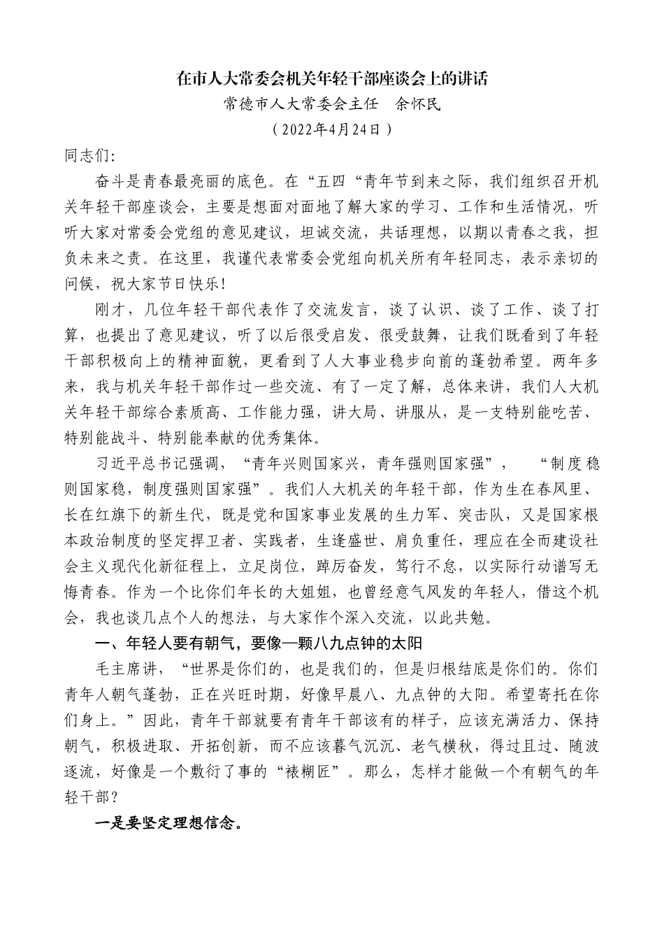 在市人大常委会机关年轻干部座谈会上的讲话常德市人大常委会主任余怀民(2022年4月24日)同志们:奋斗是青春最亮丽的底色。在“五四“青年节到来之际,我们组织召开机关年轻干部座谈会,主要是想面对面地了解大家的学习、工作和生活情况,听听大家对常委会党组的意见建议,坦诚交流,共话理想,以期以青春之我,担负未来之责。在这里,我谨代表常委会党组向机关所有年轻同志,表示亲切的问候,祝大家节日快乐!刚才,几位年轻干部代表作了交流发言,谈了认识、谈了工作、谈了打算,也提出了意见建议,听了以后很受启发、很受鼓舞,让我们既看到了年轻干部积极向上的精神面貌,更看到了人大事业稳步向前的蓬勃希望。两年多来,我与机关年轻干部作过一些交流、有了一定了解,总体来讲,我们人大机关年轻干部综合素质高、工作能力强,讲大局、讲服从,是一支特别能吃苦、特别能战斗、特别能奉献的优秀集体。习近平总书记强调,“青年兴则国家兴,青年强则国家强”,“制度稳则国家稳,制度强则国家强”。我们人大机关的年轻干部,作为生在春风里、长在红旗下的新生代,既是党和国家事业发展的生力军、突击队,又是国家根本政治制度的坚定捍卫者、实践者,生逢盛世、肩负重任,理应在全而建设社会主义现代化新征程上,立足岗位,踔厉奋发,笃行不怠,以实际行动谱写无悔青春。作为一个比你们年长的大姐姐,也曾经意气风发的年轻人,借这个机会,我也谈几点个人的想法,与大家作个深入交流,以此共勉。一、年轻人要有朝气,要像—颗八九点钟的太阳毛主席讲,“世界是你们的,也是我们的,但是归根结底是你们的。你们青年人朝气蓬勃,正在兴旺时期,好像早晨八、九点钟的大阳。希望寄托在你们身上。”因此,青年干部就要有青年干部该有的样子,应该充满活力、保持朝气,积极进取、开拓创新,而不应该暮气沉沉、老气横秋,得过且过、随波逐流,好像是一个敷衍了事的“裱糊匠”。那么,怎样才能做一个有朝气的年轻干部?一是要坚定理想信念。中国共产党成立一百年来,始终是有崇高理想和坚定信念的党。这个理想信念,就是马克思主义信仰、共产主义远大理想、中国特色社会主义共同理想,这也是我们党取得成功的关键密码。作为人大机关的年轻干部,干的是人大工作,践行是的全过程人民民主,一定要把理想信念深化为永恒的价值认同、稳定的情感归属,真正植入灵魂、融入血脉。这也是一个终身课题,需要常修常炼,要信一辈子、守一辈子,三心二意、半途而废甚至背叛初衷肯定会出大问题。二是要树立远大志向。老骥伏枥,志在千里。有志,就有了明确的奋斗目标,也就会产生不竭的前进动力。我这里的远大志向,不是要立志当大官,而是要立志做大事,是要树立一个好的世界观、人生观和价值观。这里的大志,是指事关国家富强、民族复兴、人民幸福的伟大事业,是为人民谋幸福、为社会谋发展。你只有树立了远大志向之后,你的精神就会不一样,境界不一样,视野不一样,气质也会不一样。当然,立志当大官也并是一件坏事,拿破仑说过“不想当将军的士兵不是好士兵”,只不过我们要有正确的初衷,并在正确的轨道上实现这个初衷。三是要保持积极心态。“人生所有的能力都必须排在态度之后。”这个态度就包括对学习的态度、对工作的态度、对生活的态度、对人生的态度,等等。干事创业犹如爬坡过坎,从来都不会一帆风顺。就我们年轻干部而言,在成长过程中要始终保持积极心态、向前姿态和奋斗状态,真正在大战大考中经风雨、见世面、壮筋骨,不能搞眼高手低、爱惜羽毛那一套,更不能搞坐而论道的“君子”作派、不贪也不干的“躺平”作派。相信大家也有所体会,我们做任何事情,如果没有一个好的态度,也必定不会取得一个好的结果。二、年轻人要讲正气,要像—条贯通天际的长虹一个民族如果没有正气,就如同一盘散沙,必然没有凝聚力;一个政党如果没有正气,必然要被人民唾弃,最终政息人亡;一个干部如果没有正气,就会寡廉鲜耻,贪得无厌,必然走向人民的反面。我们人大的干部,身处民主法治建设的第一线,依法履职、为民用权,一定要立正心、走正道,做光明磊落、坦荡无私、堂堂正正的人民公仆。一是要修...