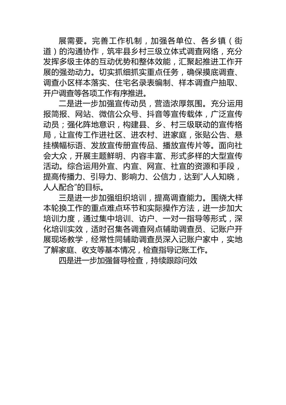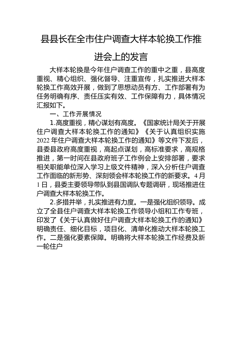 县县长在全市住户调查大样本轮换工作推进会上的发言大样本轮换是今年住户调查工作的重中之重,县高度重视、精心组织、强化督导、注重宣传,扎实推进大样本轮换工作高效开展,做到了思想动员有方、工作部署有为任务明确有序、责任压实有效、工作保障有力,具体情况汇报如下。一、工作开展情况1.高度重视,精心谋划有高度。《国家统计局关于开展住户调查大样本轮换工作的通知》《关于认真组织实施2022年住户调查大样本轮换工作的通知》等文件下发后,县委县政府高度重视,高起点谋划,高标准要求,高规格推进,第一时间在县政府班子工作例会上安排部署,要求相关职能单位深入学习上级文件精神,深入分析住户调查工作面临的新形势、深刻领会样本轮换工作的新要求。4月1日,县委主要领导带队到县国调队专题调研,现场推进住户调查大样本轮换工作。2.多措并举,扎实推进有力度。一是强化组织领导。成立了全县住户调查大样本轮换工作领导小组和工作专班,印发了《关于认真做好住户调查大样本轮换工作的通知》明确责任、细化目标,项目化、清单化推动大样本轮换工作。二是强化要素保障。明确将大样本轮换工作经费及新一轮住户调查工作经费列入年度财政预算,做到经费保障到位,同时,根据工作要求,重新调整住户调查专职人员,做到人员保障到位。三是强化学习提升。组织县国调队开展专题培训,对国家、省、市相关文件深入研究,通过学习座谈、实操培训等形式,让专业队员迅速掌握业务知识,了解操作规范,达到熟练掌握、融会贯通的效果,确保各个环节流程规范,各个阶段基础扎实,整体工作高质量推进。3.加强宣传,大众参与有热度。组织开展了一系列新媒体宣传活动,有效提升社会知晓度和公众配合度。一方面利用微信公众号等新媒体,发布大样本轮换宣传推文。在“X发布”头条推送了通知文章,以“@X人,注意!全省将开展新一轮住户调查大样本轮换工作”为标题,全文转发省政府办公厅通知。另一方面,印发住户调查大样本轮换宣传单,深入乡村、街道、社区一线走访调研、宣讲推广。通过“线上+线下”的宣传模式,进一步扩大了住户调查工作的影响力,为引导基层群众了解、认同、支持大样本轮换工作营造了良好的舆论氛围。二、下一步工作打算下一步,县将按照省市工作安排部署,制定全县大样本轮换工作时间表、路线图,细化任务、倒排工期,高质量推进住户调查大样本轮换工作。一是进一步加强保障措施,全力组织推进。围绕完成好国家调查任务,将人、财、物向大样本轮换工作倾斜,优化资源配置,进一步提高工作保障水平,最大限度满足业务开展需要。完善工作机制,加强各单位、各乡镇(街道)的沟通协作,筑牢县乡村三级立体式调查网络,充分发挥多级主体的互动优势和整体效能,汇聚起推进工作开展的强劲动力。切实抓细抓实重点任务,确保摸底调查、调查小区样本落实、住宅名录表编制、样本调查户抽取、开户调查等各项工作有序推进。二是进一步加强宣传动员,营造浓厚氛围。充分运用报简报、网站、微信公众号、抖音等宣传载体,广泛宣传动员;强化阵地意识,构建县、乡、村三级联动的宣传格局,让宣传工作进社区、进农村、进家庭,张贴公告、悬挂横幅标语、发放宣传册宣传品、播放宣传片等。面向社会大众,开展主题鲜明、内容丰富、形式多样的大型宣传活动。综合运用外宣、内宣、网宣、社宣的资源和手段,提高传播力、引导力、影响力、公信力,达到“人人知晓,人人配合”的目标。三是进一步加强组织培训,提高调查能力。围绕大样本轮换工作的重点难点环节和实际操作方法,进一步加大培训力度,通过集中培训、访户、一对一指导等形式,深化培训实效,适时召集各调查网点辅助调查员、记账户开展现场教学,经常性同辅助调查员深入记账户家中,实地了解家庭、收支等基本情况,检查指导记账工作。四是进一步加强督导检查,持续跟踪问效。建立督导督查机制,将大样本轮换工作开展情况纳入县委县政府督办事项。加强全过程质量控制,督促指导调查人员严格执行大样本轮换抽样方案、实施细则和相关制度规范,确保调查工作依法依规、科学规范、有力有序加大督导力度,坚持每月调度和通报工作进展情况,...
