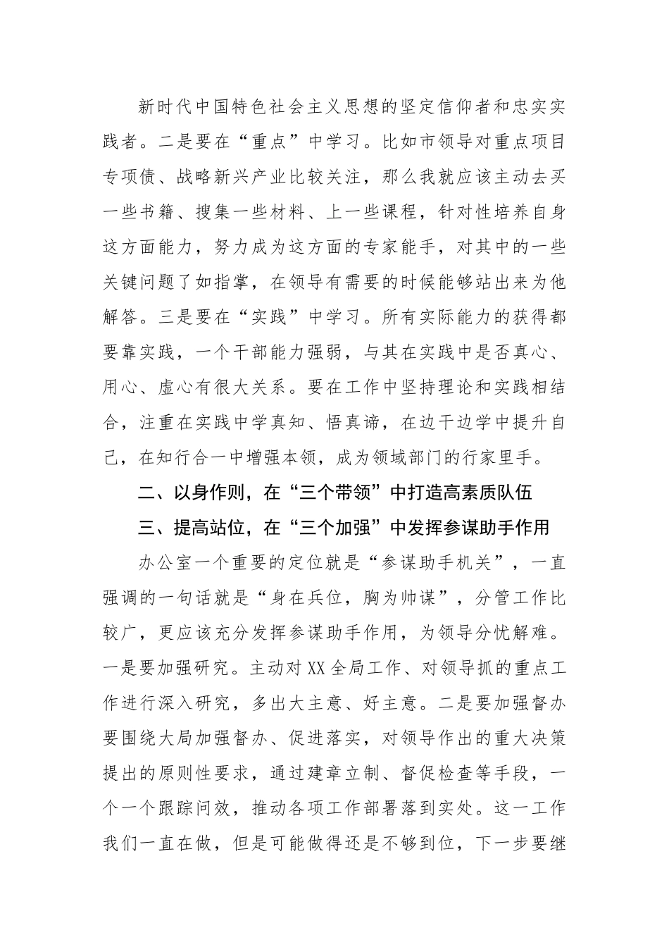 喜迎盛会座谈会的上发言材料:在“三个三”中,不断做好做优政府办工作参加办公室干部交流活动,能够提高素质锤炼能力,所以今天能有这个机会作交流发言,我非常感动,非常感谢办公室各位领导能够给我们这个机会。今天我从个人、科室、领导三个层面,交流一下“三个三”,谈一谈我对下一步工作的看法。综合科工作涉及面广、专业性强,需要投入很大的精力在上面。自当上综合科科长以来,我自知责任重大,工作中不敢懈怠,投入百般精力在工作中,确实也取得了一些成绩,但还是有很多方面距市领导的要求有差距。因此接下来我会以更加饱满的热情,投入更多的精力积极投身工作,努力把各项工作做好,做到让领导满意。一、提升素质,在“三个学习”中不断自身能力提升自身素质没有捷径,只有通过不断学习,在实践中不断磨练。一是在“理论”中学习。要夯实理论功底,自觉用习近平新时代中国特色社会主义思想武装头脑、指导实践、推动工作,掌握马克思主义立场、观点、方法这个看家本领,用好这个认识世界、改造世界的强大思想武器,自觉做习近平新时代中国特色社会主义思想的坚定信仰者和忠实实践者。二是要在“重点”中学习。比如市领导对重点项目专项债、战略新兴产业比较关注,那么我就应该主动去买一些书籍、搜集一些材料、上一些课程,针对性培养自身这方面能力,努力成为这方面的专家能手,对其中的一些关键问题了如指掌,在领导有需要的时候能够站出来为他解答。三是要在“实践”中学习。所有实际能力的获得都要靠实践,一个干部能力强弱,与其在实践中是否真心、用心、虚心有很大关系。要在工作中坚持理论和实践相结合,注重在实践中学真知、悟真谛,在边干边学中提升自己,在知行合一中增强本领,成为领域部门的行家里手。二、以身作则,在“三个带领”中打造高素质队伍三、提高站位,在“三个加强”中发挥参谋助手作用办公室一个重要的定位就是“参谋助手机关”,一直强调的一句话就是“身在兵位,胸为帅谋”,分管工作比较广,更应该充分发挥参谋助手作用,为领导分忧解难。一是要加强研究。主动对XX全局工作、对领导抓的重点工作进行深入研究,多出大主意、好主意。二是要加强督办要围绕大局加强督办、促进落实,对领导作出的重大决策提出的原则性要求,通过建章立制、督促检查等手段,一个一个跟踪问效,推动各项工作部署落到实处。这一工作我们一直在做,但是可能做得还是不够到位,下一步要继续加强。三是加强协调。要要围绕XX工作大局统筹协调、搞好保障,发挥政府办综合科中枢作用,照应各方关切、配置各方资源、调动各方力量,形成做好工作整体合力,为XX重点工作提供助力。