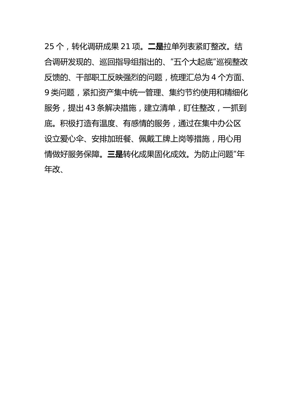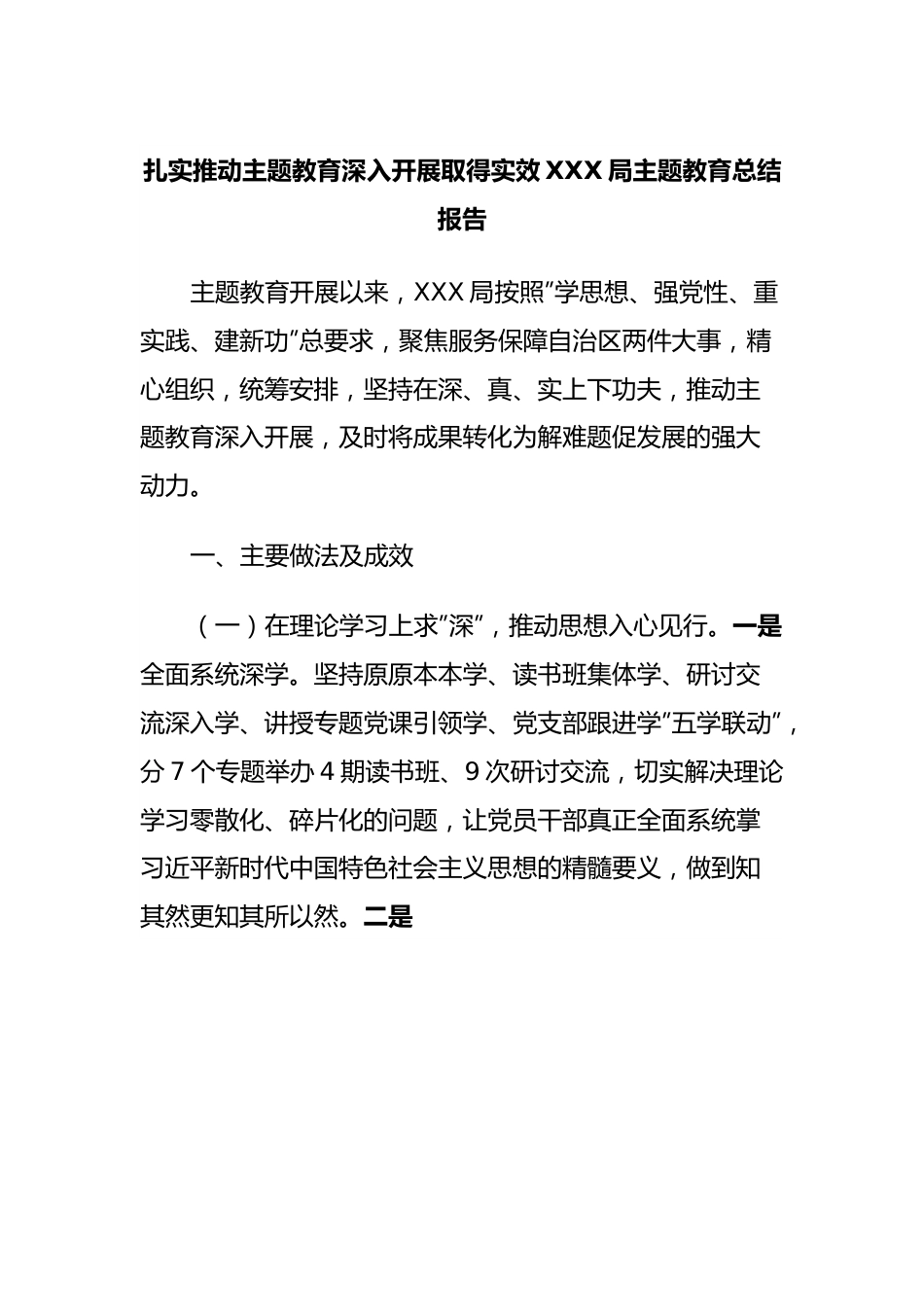 扎实推动主题教育深入开展取得实效XXX局主题教育总结报告主题教育开展以来,XXX局按照”学思想、强党性、重实践、建新功”总要求,聚焦服务保障自治区两件大事,精心组织,统筹安排,坚持在深、真、实上下功夫,推动主题教育深入开展,及时将成果转化为解难题促发展的强大动力。一、主要做法及成效(一)在理论学习上求”深”,推动思想入心见行。一是全面系统深学。坚持原原本本学、读书班集体学、研讨交流深入学、讲授专题党课引领学、党支部跟进学”五学联动”,分7个专题举办4期读书班、9次研讨交流,切实解决理论学习零散化、碎片化的问题,让党员干部真正全面系统掌习近平新时代中国特色社会主义思想的精髓要义,做到知其然更知其所以然。二是带着感情体悟。结合职能职责从政治上深学细悟,从习近平总书记考察内蒙古的重要讲话中用心感悟习近平总书记对民族地区的关心关爱和殷切期望,从习近平总书记关于机关事务工作的重要指示精神中找准新时代机关事务工作的战略定位,聚焦”两个重大”“一个作表率”“两个更好服务”的重要要求,引导全局党员干部牢记”国之大者”,把全部心思和精力都用在精细高效服务保障上,真正当好党政机关高效运转的”后勤部”“大管家”“服务员”。三是转变观念破题。坚持”七个摒弃”,紧紧围绕”闯新路、进中游”发展目标,开展”扬优势、找差距、促发展”专题学习研讨,梳理出9点优势和”四个差距、八个不足”以及13个问题表现,借鉴其他省市好经验好做法,提出了”六个突破、六个提升”的工作思路,运用新理念新方法推动办公用房、公务用车、餐饮服务等工作破题解题、提质提效。(二)在检视整改上求”真”,提升解决问题实效。一是深入调研找准”靶心”。从一开始就奔着领导机关的高效运转、服务对象的实际需求和职工群众的热切期盼去深入调研,精选公共机构节能社会化改革不深入、办公用房供需矛盾突出、服务保障不及时不到位等6个调研题目作为突破口,赴外省、走厅局、下基层,变”问题找上门”为”主动上门找问题”,开展实地调研50余次,找出问题51个,已解决25个,转化调研成果21项。二是拉单列表紧盯整改。结合调研发现的、巡回指导组指出的、”五个大起底”巡视整改反馈的、干部职工反映强烈的问题,梳理汇总为4个方面、9类问题,紧扣资产集中统一管理、集约节约使用和精细化服务,提出43条解决措施,建立清单,盯住整改,一抓到底。积极打造有温度、有感情的服务,通过在集中办公区设立爱心伞、安排加班餐、佩戴工牌上岗等措施,用心用情做好服务保障。三是转化成果固化成效。为防止问题”年年改、年年在”,主题教育开展以来共制定6项制度、9大类86项工作流程和2项地方标准,用制度标准固化整改成效。(三)在推动发展上求”实”,真抓实干攻坚克难。一是转作风提升工作效能。结合区直机关”提标、提速、提效”专项行动,在全局开展”作风建设年”活动,以”快、细、严、实、新”工作要求为牵引,推动干部职工养成说了就干、马上就办、办就办好的工作作风。对各厅局、部门办公用房、公务用车、大中修项目方面的事项文件,全部通过OA系统运转,压减环节流程,办理效率大幅提升。二是季度考核督导落实见行见效。针对”慢、粗、虚”问题,开展季度述职,变”年底算总账”为”平时常算账”,每季度述职晒成绩单,约谈排名靠后的处室、单位,倒逼干部转作风、提效能。三是聚焦职能职责解难题求突破。坚持分类施策,采取”六个一批”的方式盘活XXX,减少在外租用房产XXX,首次跨层级调剂XXX,推动了节约集约使用。公务用车聚焦解决保障的难题堵点,”区域一体化”集中统一管理试点工作,召开现场培训会全区推广公务出行保障经验做法,解决基层公务出行难问题;积极协助相关厅局部门解决事业单位改革后车辆账实不符遗留问题。公用机构节能始终坚持绿色低碳转型目标,推动8个盟市启动和实施XXX个合同能源管理项目,引入社会资金4.3亿元,已完成投资2.5亿元,实现了从”零”到”亿”的突破。二、经验启示(一)开展主题教育必须聚焦主线。习近平新时代中国特色社会主义思想是做好一切工作的根本遵循,要坚持从习近平总书记关于XXXX工作的重...