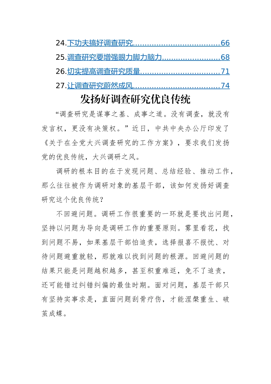 目录1.发扬好调查研究优良传统.....................................32.调查研究要走进群众.........................................33.调查研究是党的优良传统和制胜法宝...................64.调查研究是践行初心的路径要求..........................85.真正用好调查研究这个传家宝...........................136.调查研究要谨防几种现象.................................177.下足调查研究“真功夫”.................................198.调查研究要谨防几种现象.................................229.调查研究要注重用数据说话..............................2410.以调查研究推动主题教育走深走实...................2611.增强调查研究的问题意识...............................3112.调查研究要把握好三个要点............................3413.多些“既报喜又报忧”的调查研究...................3514.强化“四个导向”推动调查研究走向深入.........3715.练好新时代调查研究“基本功”......................4016.调查研究不能下“大包围”............................4417.调查研究要力戒增加基层负担.........................4518.以深入调查研究推动解决发展难题...................4719.调查研究重在求真务实..................................5320.调查研究绝不等于“做文章”.........................5721.做正确的调查研究........................................5922.大兴调查研究要把握好“四度”......................6023.让调查研究始终围绕问题转............................6324.下功夫搞好调查研究.....................................6625.调查研究要增强眼力脚力脑力.........................6826.切实提高调查研究质量..................................7127.让调查研究蔚然成风.....................................74发扬好调查研究优良传统“调查研究是谋事之基、成事之道。没有调查,就没有发言权,更没有决策权。”近日,中共中央办公厅印发了《关于在全党大兴调查研究的工作方案》,要求我们发扬党的优良传统,大兴调研之风。调研的根本目的在于发现问题、总结经验、推动工作,那么往往被作为调研对象的基层干部,该如何发扬好调查研究这个优良传统?不回避问题。调研工作很重要的一环就是要找出问题,坚持以问题为导向是调研工作的重要原则。雾里看花,找到问题不易,如果基层干部怕追责,选择报喜不报忧、对待问题避重就轻,那就难以找到问题的根源。回避问题的结果只能是问题越积越多,甚至积重难返,免不了追责,还可能错过纠错纠偏的最佳时期。面对问题,基层干部只有坚持实事求是,直面问题刮骨疗伤,才能涅槃重生、破茧成蝶。不夸大成绩。日常调研中,听取汇报是最为常见的工作方式之一,然而在形成工作汇报材料过程中,一些基层干部错误地把政绩作为衡量自己配合完成调研工作的“金标准”,导致拔高成绩、夸大成效等现象偶有发生。基层干部要坚持正确的政绩观,不好大喜功、不夸大成绩,那么面对调研工作,既能如实反映情况,又能轻松完成配合任务。践行“再调研”。调研活动对于基层工作确实是难得的交流和展示的平台,但是切忌当作“一阵风”。如果调研时轰轰烈烈,调研后销声匿迹,尤其是对发现的问题置之不理、淡化处理,那么问题就依旧是问题,下次调研时原来的新问题就变成老问题。基层不是终点站,基层干部应该践行“再调研”,也就是自我检视,大力践行“一线工作法”,到乡镇、村等基层一线再梳理、再查摆调研反映问题,深刻剖析原因、深入总结经验,真正做到彻查彻改、举一反三,使调研成为基层治理的“监测器”,推动落实的“晴雨表”。调查研究要走进群众近日,中共中央办公厅印发《关于在全党大兴调查研究的工作方案》,把全党大兴调查研究,作为在全党开展主题教育的重要内容,要求广大党员干部必须坚持党的群众路线,从群众中来、到群众中去,增进同人民群众的感情,真诚倾听群众呼声、真实反映群众愿望、真情关心群众疾苦。从群众中来、到群众中去,关键在于走进群众。走进群众,宝山捡宝;走不进群众,...