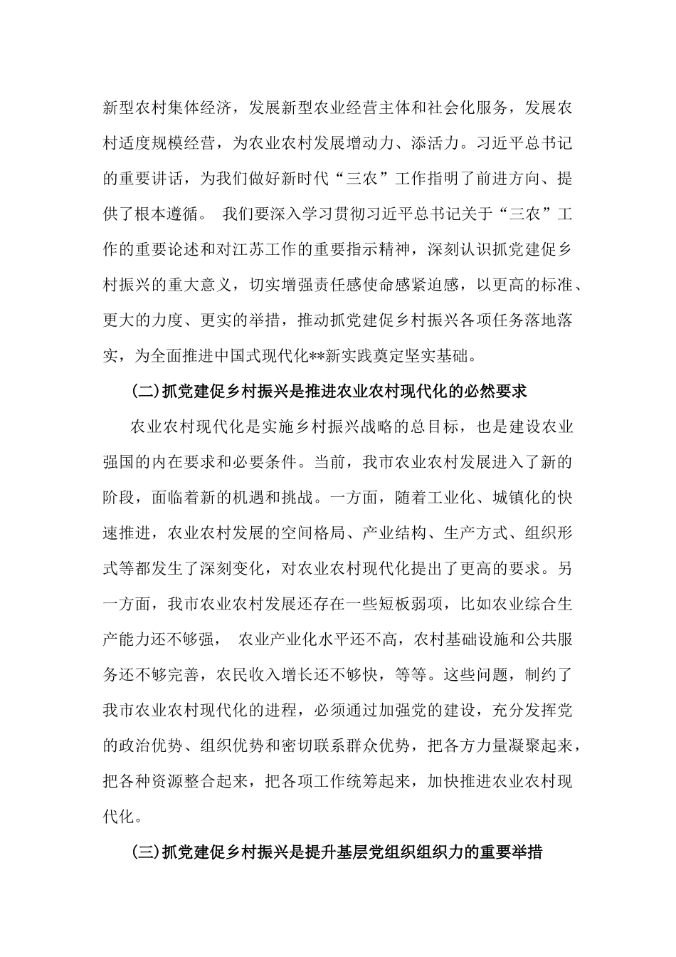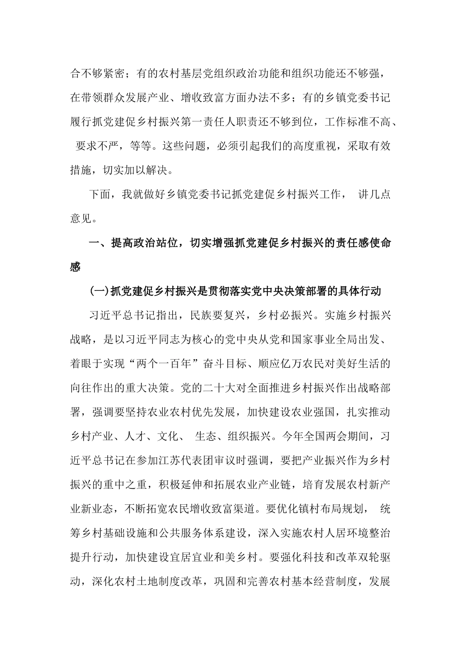 2024年(两篇文)全面抓党建促乡村振兴工作会上的讲话及发言材料【范文一】同志们:党的二十大报告提出,要全面推进乡村振兴,坚持农业农村优先发展,巩固拓展脱贫攻坚成果,加快建设农业强国,扎实推动乡村产业、人才、文化、生态、组织振兴,全方位夯实粮食安全根基,牢牢守住十八亿亩耕地红线,确保中国人的饭碗牢牢端在自己手中。习近平总书记强调,要加强基层党组织建设,选优配强乡镇领导班子、村“两委”成员特别是村党支部书记,落实村党组织5年任期规定,推动全面从严治党向基层延伸,完善基层民主协商制度,实现党的领导、政府治理和社会调节、居民自治良性互动,巩固和发扬“枫桥经验”,健全党组织领导的自治、法治、德治相结合的基层治理体系,努力把农民组织起来,让农村社会既充满活力又和谐有序。总书记的重要指示,为我们做好新时代抓党建促乡村振兴工作提供了根本遵循。近年来,全市各级党组织坚持以习近平新时代中国特色社会主义思想为指导,深入贯彻落实新时代党的建设总要求和新时代党的组织路线,围绕抓党建促乡村振兴做了大量工作,取得了明显成效。但我们也要清醒地看到,当前工作中还存在一些问题和不足,比如有的地方对党建引领乡村振兴认识还不够深刻,抓党建与促振兴融合不够紧密;有的农村基层党组织政治功能和组织功能还不够强,在带领群众发展产业、增收致富方面办法不多;有的乡镇党委书记履行抓党建促乡村振兴第一责任人职责还不够到位,工作标准不高、要求不严,等等。这些问题,必须引起我们的高度重视,采取有效措施,切实加以解决。下面,我就做好乡镇党委书记抓党建促乡村振兴工作,讲几点意见。一、提高政治站位,切实增强抓党建促乡村振兴的责任感使命感(一)抓党建促乡村振兴是贯彻落实党中央决策部署的具体行动习近平总书记指出,民族要复兴,乡村必振兴。实施乡村振兴战略,是以习近平同志为核心的党中央从党和国家事业全局出发、着眼于实现“两个一百年”奋斗目标、顺应亿万农民对美好生活的向往作出的重大决策。党的二十大对全面推进乡村振兴作出战略部署,强调要坚持农业农村优先发展,加快建设农业强国,扎实推动乡村产业、人才、文化、生态、组织振兴。今年全国两会期间,习近平总书记在参加江苏代表团审议时强调,要把产业振兴作为乡村振兴的重中之重,积极延伸和拓展农业产业链,培育发展农村新产业新业态,不断拓宽农民增收致富渠道。要优化镇村布局规划,统筹乡村基础设施和公共服务体系建设,深入实施农村人居环境整治提升行动,加快建设宜居宜业和美乡村。要强化科技和改革双轮驱动,深化农村土地制度改革,巩固和完善农村基本经营制度,发展新型农村集体经济,发展新型农业经营主体和社会化服务,发展农村适度规模经营,为农业农村发展增动力、添活力。习近平总书记的重要讲话,为我们做好新时代“三农”工作指明了前进方向、提供了根本遵循。我们要深入学习贯彻习近平总书记关于“三农”工作的重要论述和对江苏工作的重要指示精神,深刻认识抓党建促乡村振兴的重大意义,切实增强责任感使命感紧迫感,以更高的标准、更大的力度、更实的举措,推动抓党建促乡村振兴各项任务落地落实,为全面推进中国式现代化**新实践奠定坚实基础。(二)抓党建促乡村振兴是推进农业农村现代化的必然要求农业农村现代化是实施乡村振兴战略的总目标,也是建设农业强国的内在要求和必要条件。当前,我市农业农村发展进入了新的阶段,面临着新的机遇和挑战。一方面,随着工业化、城镇化的快速推进,农业农村发展的空间格局、产业结构、生产方式、组织形式等都发生了深刻变化,对农业农村现代化提出了更高的要求。另一方面,我市农业农村发展还存在一些短板弱项,比如农业综合生产能力还不够强,农业产业化水平还不高,农村基础设施和公共服务还不够完善,农民收入增长还不够快,等等。这些问题,制约了我市农业农村现代化的进程,必须通过加强党的建设,充分发挥党的政治优势、组织优势和密切联系群众优势,把各方力量凝聚起来,把各种资源整合起来,把各项工作统筹起来,加快推进农业农村现代化。(三)抓党建促乡村振兴是提升基层党组织组织力的重...