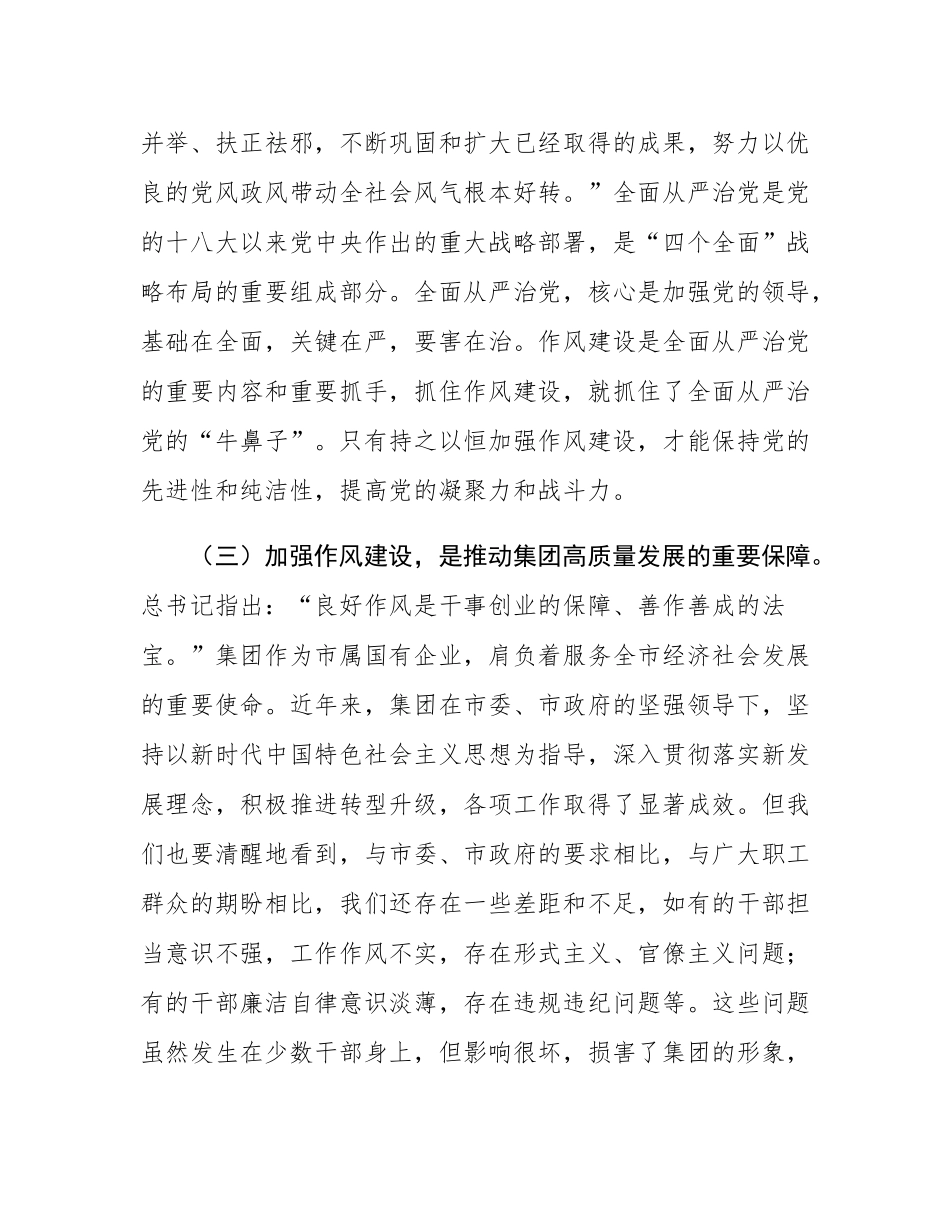在国有企业党委理论学习中心组作风建设学习教育读书班上的讲话同志们:为深入学习贯彻总书记关于加强党的作风建设的重要论述,全面落实党中央及市委有关部署要求,示范带动集团系统学习教育走深走实,为集团高质量发展提供坚强作风保障,集团党委决定举办此次读书班。刚才,我们集中学习了总书记关于加强党的作风建设的重要论述,以及中央八项规定及其实施细则精神等文件,*同志结合自身思想和工作实际作了交流发言,讲得都很好,大家要相互学习借鉴。下面,围绕深入贯彻中央八项规定精神学习教育,我再谈几点意见。一、深刻认识加强作风建设的重大意义,切实增强学习教育的责任感紧迫感党的作风就是党的形象,关系人心向背,关系党的生死存亡。总书记指出:“我们党作为马克思主义执政党,不但要有强大的真理力量,而且要有强大的人格力量;真理力量集中体现为我们党的正确理论,人格力量集中体现为我们党的优良作风。”党的十八大以来,以同志为核心的党中央从制定和落实中央八项规定开局破题,以钉钉子精神纠治“四风”,党风政风焕然一新,社风民风持续向好,八项规定成为长期有效的铁规矩硬杠杠、管党治党的“金色名片”。(一)加强作风建设,是巩固党的执政基础和执政地位的必然要求。总书记指出:“我们党来自人民、植根人民、服务人民,一旦脱离群众,就会失去生命力。”人民群众的拥护和支持是我们党的力量源泉和胜利之本。我们党xx多年的奋斗历程,就是一部党与人民群众同呼吸、共命运、心连心的历史。党的作风是党的形象,是观察党群干群关系、人心向背的晴雨表。党的作风正,人民的人心气顺,党和人民就能同甘共苦。一个政党、一个政权,其前途命运取决于人心向背。我们党作为长期执政的马克思主义政党,没有比巩固执政基础、实现执政使命更为重要的事,也没有比脱离群众、脱离实际更为危险的事。只有持之以恒加强作风建设,才能保持党同人民群众的血肉联系,巩固党的执政基础和执政地位。(二)加强作风建设,是全面从严治党的重要内容和重要抓手。总书记指出:“作风建设是永恒课题,要标本兼治,经常抓、见常态,深入抓、见实效,持久抓、见长效,通过立破并举、扶正祛邪,不断巩固和扩大已经取得的成果,努力以优良的党风政风带动全社会风气根本好转。”全面从严治党是党的十八大以来党中央作出的重大战略部署,是“四个全面”战略布局的重要组成部分。全面从严治党,核心是加强党的领导,基础在全面,关键在严,要害在治。作风建设是全面从严治党的重要内容和重要抓手,抓住作风建设,就抓住了全面从严治党的“牛鼻子”。只有持之以恒加强作风建设,才能保持党的先进性和纯洁性,提高党的凝聚力和战斗力。(三)加强作风建设,是推动集团高质量发展的重要保障。总书记指出:“良好作风是干事创业的保障、善作善成的法宝。”集团作为市属国有企业,肩负着服务全市经济社会发展的重要使命。近年来,集团在市委、市政府的坚强领导下,坚持以新时代中国特色社会主义思想为指导,深入贯彻落实新发展理念,积极推进转型升级,各项工作取得了显著成效。但我们也要清醒地看到,与市委、市政府的要求相比,与广大职工群众的期盼相比,我们还存在一些差距和不足,如有的干部担当意识不强,工作作风不实,存在形式主义、官僚主义问题;有的干部廉洁自律意识淡薄,存在违规违纪问题等。这些问题虽然发生在少数干部身上,但影响很坏,损害了集团的形象,阻碍了集团的发展。只有持之以恒加强作风建设,才能营造风清气正的发展环境,激发广大干部职工的积极性、主动性和创造性,为集团高质量发展提供坚强保障。二、深入学习总书记关于加强党的作风建设的重要论述,不断增强贯彻中央八项规定精神的政治自觉、思想自觉、行动自觉总书记围绕加强党的作风建设发表的一系列重要论述,立意高远,内涵丰富,思想深刻,对于持之以恒正风肃纪,锲而不舍落实中央八项规定精神,以钉钉子精神纠治“四风”,推进作风建设常态化长效化,具有十分重要的意义。我们要认真学习领会,深刻把握其精神实质和丰富内涵。(一)深刻领悟党的作风就是党的形象,关系人心向背,关系党的生死存亡。总书记...