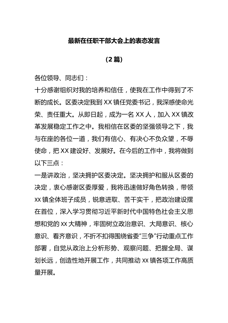 最新在任职干部大会上的表态发言(2篇)各位领导、同志们:十分感谢组织对我的培养和信任,使我在工作中得到了不断的成长。区委决定我到XX镇任党委书记,我深感使命光荣、责任重大。从即日起,成为一名XX人,加入XX镇改革发展稳定工作之中。我相信在区委的坚强领导之下,我与在座的各位一道,我们有信心、有决心不负众望,不辱使命,把XX建设好、发展好。在今后的工作中,我将做到以下三点:一是讲政治,坚决拥护区委决定。坚决拥护和服从区委的决定,衷心感谢区委厚爱,我将迅速做好角色转换,带领XX镇全体班子成员,锐意进取、苦干实干,把政治建设摆在首位,深入学习贯彻习近平新时代中国特色社会主义思想和党的XX大精神,牢固树立政治意识、大局意识、核心意识、看齐意识,不折不扣得围绕省委“三争”行动重点工作部署,自觉从政治上分析形势、观察问题、把握全局、谋划长远,创造性地开展工作,共同推动XX镇各项工作高质量开展。二是顾大局,自觉维护班子团结。团结是班子建设的首要问题,也是力量的源泉。领导班子成员间要在共识中求团结,在信任中求融洽。我将牢牢扛起党委书记主体责任,团结班子成员,带头讲政治、讲规矩、讲担当、讲奉献,自觉执行民主集中制,充分把握镇情民意,紧贴工作思路和工作措施,不急功近利,不好高骛远,重大决策集体研究,确保决策的科学性。带领班子成员做到相互尊重、相互谅解、及时补台,努力创造和谐共事环境,齐心协力把XX的工作一项项推进、一件件落实。三是重实干,推动XX快速发展。让我们在区委、区政府正确领导下,以脚踏实地、真抓实干的工作作风,发扬“钉钉子”精神,狠抓落实求实效。坚持党建引领,一任接着一任干,我将带头抓好落实,积极开拓进取、勇于创新,切切实实解决群众最关心的问题,扎扎实实落实好XX镇各项工作,一步一个脚印地推动我镇的长足发展,为奋力谱写生态XX新篇章而努力奋斗。同时,认真贯彻党风廉政建设责任制,时刻保持清醒的头脑,严于利己,清正廉明,自觉接受各方面监督。同志们,岗位就是责任!新的岗位、新的起点,使命光荣责任重大,我将牢记宗旨、尽心履职,在区委的坚强领导之下团结班子,与大家同心同德,同甘共苦,带领大家自强不息、艰苦奋斗,为实现绿色高质量发展超越做出不懈努力。在任职干部大会上的表态发言各位领导、同志们:两年多来,在xx书记的带领下,XX镇团结广大干部群众,认真贯彻落实习近平新时代中国特色社会主义思想,进一步统一思想,明确奋斗目标,立足区域定位特点不断创新围绕区委奋力打造都市圈门户城市的目标,团结一心共同推动各项工作落地见效。此次人事调整,充分体现了区委对XX镇领导班子建设的高度重视、对XX镇经济社会发展的殷切期望,我发自内心的欢迎XX同志到XX工作,本人坚决拥护区委决定,摆正自身位置,倡导形成团结拼搏、奋发进取的良好作风,认真把各项工作做好。具体来说,我将努力把握好以下三点:一是坚持正确政治方向。牢固树立“四个意识”,坚定“四个自信”,坚决做到“两个维护”,不断提高政治站位。特别是要坚决维护县委决定,自觉服从新书记的领导,坚决拥护区委决定,带头自觉服从以XX同志的领导,自觉维护良好政治生态,确保政令畅通。二是不断强化规矩意识。站好位置,树好形象,坚决做到到位不越位、用权不错位、履职不缺位,推动形成上下齐心、团结一致的干事氛围。三是奋力抓好当前各项工作。聚焦主责,明确主业,落实好区委、区政府定的各项发展目标和重大战略,以高度责任感和使命感,提振工作激情,主动担当作为,以扎扎实实的成绩为全方位建设XX作出贡献。相信在XX书记的带领下,XX镇全体干部职工将团结拼搏、勇担当、讲奉献,切实做好各项工作,XX镇必将取得进一步的发展和更加优异的成绩。谢谢大家!