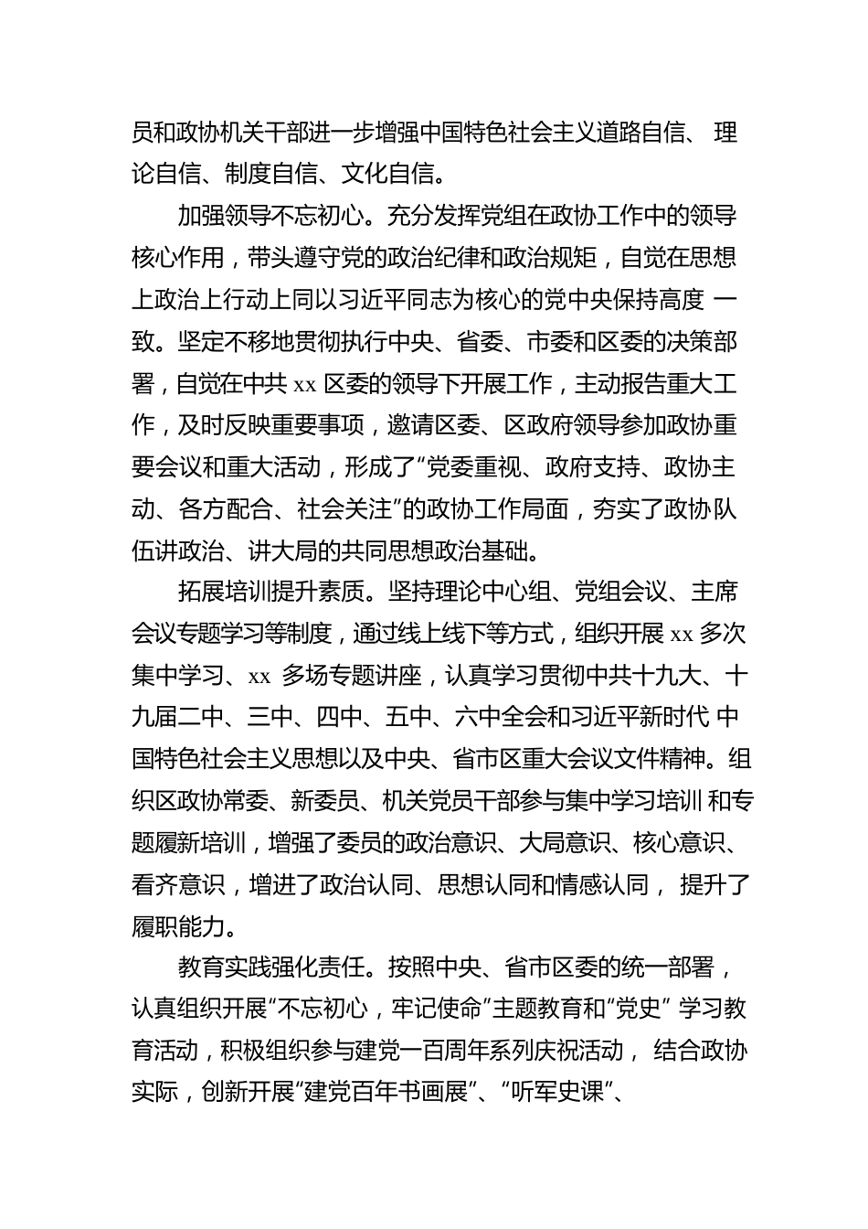 政协主席在政协xx区委员会第一次会议上工作报告各位委员,同志们:我代表政协xx市xx区第三届委员会常务委员会,向大会报告过去五年的工作,对四届区政协工作提出建议,请予审议,并请列席会议同志提出意见。一、过去五年工作的回顾三届区政协任期的五年,是我区人民政协事业深入发展的五年。五年来,我们在中共xx区委员会的正确领导和xx区人民政府以及社会各界的大力支持下,高举中国特色社会主义伟大旗帜,坚持团结和民主两大主题,全面贯彻中共十九大和十九届二中、三中、四中、五中、六中全会精神,深入学习贯彻习近平新时代中国特色社会主义思想,紧紧围绕区委、区政府中心工作,充分发挥人民政协独特优势和职能作用,为推动xx全面建成小康社会、以更好质量更高水平迈入建设社会主义现代化国家新征程作出了重要贡献,人民政协事业呈现出团结和谐、务实进取、蓬勃发展的良好局面。(一)五年来,我们始终坚持重学习、正方向,夯实了团结奋斗的共同思想政治基础常委会坚持把思想建设摆在人民政协各项建设的首要位置,不断丰富学习内容,积极创新活动形式,引导广大委员和政协机关干部进一步增强中国特色社会主义道路自信、理论自信、制度自信、文化自信。加强领导不忘初心。充分发挥党组在政协工作中的领导核心作用,带头遵守党的政治纪律和政治规矩,自觉在思想上政治上行动上同以习近平同志为核心的党中央保持高度一致。坚定不移地贯彻执行中央、省委、市委和区委的决策部署,自觉在中共xx区委的领导下开展工作,主动报告重大工作,及时反映重要事项,邀请区委、区政府领导参加政协重要会议和重大活动,形成了“党委重视、政府支持、政协主动、各方配合、社会关注”的政协工作局面,夯实了政协队伍讲政治、讲大局的共同思想政治基础。拓展培训提升素质。坚持理论中心组、党组会议、主席会议专题学习等制度,通过线上线下等方式,组织开展xx多次集中学习、xx多场专题讲座,认真学习贯彻中共十九大、十九届二中、三中、四中、五中、六中全会和习近平新时代中国特色社会主义思想以及中央、省市区重大会议文件精神。组织区政协常委、新委员、机关党员干部参与集中学习培训和专题履新培训,增强了委员的政治意识、大局意识、核心意识、看齐意识,增进了政治认同、思想认同和情感认同,提升了履职能力。教育实践强化责任。按照中央、省市区委的统一部署,认真组织开展“不忘初心,牢记使命”主题教育和“党史”学习教育活动,积极组织参与建党一百周年系列庆祝活动,结合政协实际,创新开展“建党百年书画展”、“听军史课”、“走抗联路”等主题教育活动,优化转变工作作风,强化委员和机关党员干部遵纪守法、履职为民的政治责任感和历史使命感。(二)五年来,我们始终坚持讲大局、献良策,助推了xx改革发展和全面振兴常委会始终坚持把服务发展作为履行职能的第一要务,紧紧围绕区委、区政府中心工作,组织召开xx次常委会议、xx次专题议政协商会议,开展xx次调研视察活动,撰写xx余份调研视察考察报告,形成一大批高质量意见建议,为推动我区改革发展和全面振兴献计出力。助力“抓经济、抓产业、抓招商”战略。五年来,组织委员围绕“抓经济、抓产业、抓招商”发展战略,运用常委会专题议政协商、“委员电视访谈”、专委会对口协商等方式,与区委、区政府主要领导及党政部门负责人面对面协商,积极建言献策,推动形成了全社会关注支持振兴发展的良好氛围。区政协发挥自身优势,积极开展招商引资,先后成功引进xx等五家企业落户xx工业♘区,现均已正式生产运营。xxxx年,《人民政协报》刊发了xx区政协紧扣区委发展战略开展协商议政、服务区域经济发展的文章并做了简要评述,扩大了xx的知名度和影响力。助力区委区政府中心工作落地生效。聚焦党政决策部署和中心工作开展协商议政,围绕“壮大xx旅游产业”、“保护xx绿水蓝天”、“全面建成小康社会”、“城市建设与管理”等重大课题开展常委会专题协商议政,提出xx余项合理化意见建议,多数意见建议得到了区委、区政府采纳,有些意见建议被纳入了全区“十四五”规划当中,助推了我区重要改革任务、重大民生项目的深化与落实。积极围绕...
