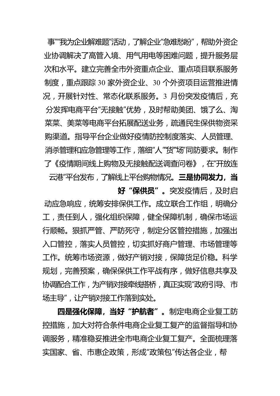 市商务局打造“暖企安商”红旗党支部交流材料市商务局机关第三党支部紧紧围绕新时代党建要求,按照“组织队伍强、制度建设强、学用结合强、服务效能强”的四强标准,坚持党建与业务工作深度融合、同频共振,聚合支部内各处室专业优势,打造“暖企安商”红旗党支部。3月份突发疫情以来,支部充分发挥党员先锋模范作用,支部党员下沉一线、保供稳价、服务企业,让党旗在战“疫”一线高高飘扬。一、具体做法一是聚力招商,当好“店小二”。主动适应疫情形势下招商引资形势,充实投资连云港网站、开放连云港微信招商内容,加大主流媒体招商宣传力度,编制市级招商地图,扩大受众覆盖面和关注度。引导各县区(板块)立足自身发展现状、要素禀赋,通过“屏对屏”洽谈实现“面对面”招商,在“云端”与客商保持沟通联系,广泛开展“不见面”招商推介,实现差异化高质量外资招引。加强与客商互动,做到客商早对接、政策早宣传、后勤早跟上,既当好“招商员”,也当好“服务员”。二是用心助企,当好“贴心人”。开展“我为基层办实事”“我为企业解难题”活动,了解企业“急难愁盼”,帮助外资企业协调解决了高管入境、用气用电等困难问题,提升服务层次和水平。建立完善全市外资重点企业、重点项目联系服务制度,重点跟踪30家外资企业、30个外资项目运营推进情况,开展针对性、常态化联系服务。3月份突发疫情后,充分发挥电商平台“无接触”优势,及时帮助美团、饿了么、淘菜菜、美菜等电商平台拓展配送业务,疏通民生保供物资采购渠道。指导平台企业做好疫情防控制度落实、人员管理、消杀管理和应急管理等工作,落细“人”“货”“场”同防要求。制作了《疫情期间线上购物及无接触配送调查问卷》,在“开放连云港”平台发布,了解线上平台购物情况。三是协同发力,当好“保供员”。突发疫情后,及时启动应急响应,统筹安排保供工作。成立联合工作组,明确分工,责任到人,强化组织保障,健全保障机制,确保市场运行顺畅。狠抓严管、严防死守,制定分区管控措施,加强出入口管控,落实人员管控,切实抓好商户管理、市场管理等工作。统筹市场资源,做好产销对接,保障货足价稳。科学规划,完善预案,确保保供工作平战有序,做好信息共享及协调配合工作,为产销对接牵线搭桥,真正实现“政府引导、市场主导”,让产销对接工作落到实处。四是强化保障,当好“护航者”。制定电商企业复工防控措施,加大对符合条件电商企业复工复产的监督指导和协调服务,精准稳妥推进全市电商企业复工复产。全面梳理落实国家、省、市惠企政策,形成“政策包”传达各企业,帮助企业用足用好减税降费、信贷支持、物流保障等优惠政策。及时宣传外资企业战疫情、捐善款、抓生产事迹,传递抗疫正能量。密切关注疫情对外资企业生产经营的影响,积极帮助企业解决因疫情影响存在的困难问题,为企业复工复产保驾护航。二、主要成效一是招商引资展活力。坚持“工业立市、产业强市”核心战略,突出主导产业,扎实开展招商活动。2021年相继组织上海经贸合作恳谈会、丝路物博会、电商大会、医药大会、农洽会等大型经贸活动,先后拜访日本贸易振兴机构、大韩贸易投资振兴公社等机构,邀请韩国、俄罗斯、哈萨克斯坦等国家驻沪总领馆以及日中经济贸易中心、韩国贸易协会、香港贸发局等经贸机构参加我市经贸活动。2021年全市重点在谈、签约招商引资在库外资项目23个,总投资141亿元。全市新设外商投资项目108个,同比增长35%,其中新设及增资3000万美元以上项目54个,同比增长200%。二是抗疫保供显担当。疫情期间加大货源组织力度,疏通备货关键环节,全市各类电商平台累计配送300多万单,配送金额过亿元,高峰期单日订单约为疫情前日常的3倍以上。发出保供倡议,制作的《疫情期间线上购物及无接触配送调查问卷》共2500多人参与,征求意见和建议263条。结合问卷调查,形成了《关于疫情期间线上购物及无接触配送调查问卷的分析报告》,对电商平台改善线上保供提出具体意见和建议。政企商多方联动,确保市场正常运营,根据批发市场运力情况,发放通行证1130张,协调开放连云港高速西出口,作为批发市场应急保供专用通道,保障运输...