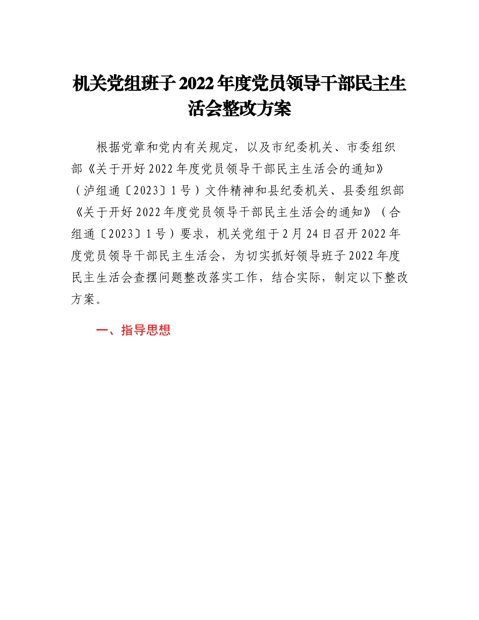机关党组班子2022年度党员领导干部民主生活会整改方案根据党章和党内有关规定,以及市纪委机关、市委组织部《关于开好2022年度党员领导干部民主生活会的通知》(泸组通〔2023〕1号)文件精神和县纪委机关、县委组织部《关于开好2022年度党员领导干部民主生活会的通知》(合组通〔2023〕1号)要求,机关党组于2月24日召开2022年度党员领导干部民主生活会,为切实抓好领导班子2022年度民主生活会查摆问题整改落实工作,结合实际,制定以下整改方案。一、指导思想全面准确学习领会党的XX大精神,原原本本、逐字逐句学习党的XX大报告和党章,学习习近平总书记在党的二十届一中全会上的重要讲话精神,把着力点聚焦到习近平总书记是党中央的核心、全党的核心,习近平新时代中国特色社会主义思想是党必须长期坚持的指导思想上;聚焦到党的十九大以来的重大成就和新时代10年的伟大变革上;聚焦到把握好马克思主义中国化时代化最新成果的世界观和方法论,坚持好、运用好贯穿其中的立场观点方法上;聚焦到中国式现代化在理论和实践的创新突破上;聚焦到贯彻落实党的XX大作出的重大决策部署上;聚焦到以习近平同志为核心的新一届中央领导集体是深受全党全国各族人民拥护和信赖的领导集体上;聚焦到习近平总书记是全党拥护、人民爱戴、当之无愧的党的领袖上。二、整改目标通过整改落实民主生活会查摆剖析回题在加强机关党组班子自身建设、推进全面从严管党建设、贯彻落实上级重大决策部署等方面存在的突出问题,进一步认清形势、找准差距、查缺补漏,带领队伍彻底开展“政治体检”持续整肃风气,,着力解决影响制约中心工作发展的突出问题和不足,为工作高质量发展提供坚强的政治、思想、组织和作风保证。三、整改主要内容、责任分工与时限要求经梳理问题清单,重点抓好七个方面整改任务。(一)带头深刻感悟“两个确立”的决定性意义,增强“四个意识”、坚定“四个自信”、做到“两个维护”方面。整改内容:一是理论贯彻不够深入;二是政治敏锐性不高。整改措施:深入学习理论知识。坚持把理论学习作为政治建设的重要抓手,完善以党组理论学习中心组学习为引领的学习制度体系,推进理论学习常态化制度化。坚持把学习贯彻习近平新时代中国特色社会主义思想和党的XX大精神结合起来,持续抓好理论学习,开展好“三会一课”“主题党日”“固定党日”等活动;拓宽思维视野提高政治站位。坚定维护党中央的权威、宣传党的政策主张,全面提高机关干部的思想政治素质和业务水平,以实际行动坚定践行“两个维护”,不断提高领导干部政治敏锐性和政治鉴别力。责任领导:机关党组成员牵头单位:办公室配合单位:各委(室)完成时限:长期贯彻落实(二)带头用习近平新时代中国特色社会主义思想凝心铸魂方面。整改内容:一是理论学习自觉性还不够;二是学用结合还不够紧密。整改措施:坚持集中学习与自学相结合,做到原原本本学、系统深入学、结合实际学,把学习贯彻习近平新时代中国特色社会主义思想和党的XX大精神结合起来,持续抓好理论学习认真组织开展主题读书活动,班子成员带头荐书,多读书、善读书、读好书,带头交流学习心得。切实用习近平新时代中国特色社会主义思想和党的XX大精神武装头脑、指导实践、推动工作,最终把学习教育成果体现在推动工作上来。责任领导:机关党组成员牵头单位:办公室配合单位:各委(室)完成时限:长期贯彻落实(三)在带头坚持和加强党的全面领导方面。整改内容:一是党组织战斗堡垒作用发挥不充分;二是抓党建工作创新力度不够。整改措施:强化党组织建设,实施“机关干部队伍党建素质能力提升”项目,充分发挥党组织的战斗堡垒作用和党员的先锋模范作用,不断提升党组织战斗力。积极适应新时代生态环境保护工作的新形势新任务新要求,创新党建工作,开展好“三会一课”“主题党日”“固定党日”等活动,打造具有政协特色的党建品牌。责任领导:机关党组成员牵头单位:办公室配合单位:各委(室)完成时限:长期贯彻落实(四)在带头坚持以人民为中心的发展思想,推动改革发展稳定方面。整改内容:一是联系基层不够紧密;二是服务群众能力有差距。整改措施:主动...