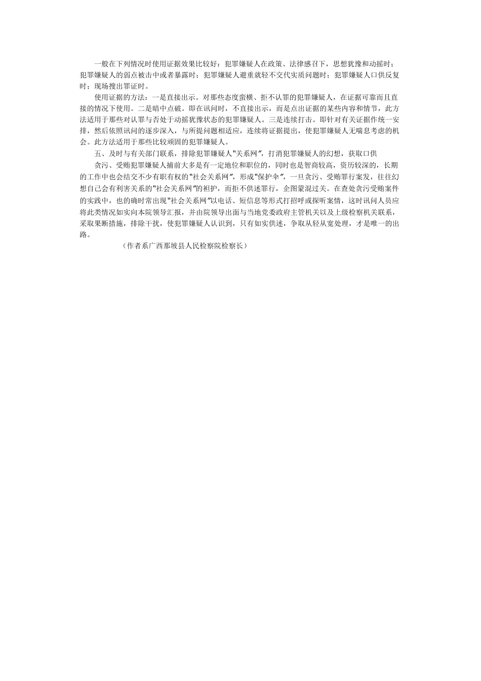 审讯犯罪嫌疑人应注意方法策略在检察工作实践中,某些案件办理周期长,久侦不破不结的一个重要原因就是没有掌握案件的主要证据,而是寄希望于犯罪嫌疑人开口,一旦犯罪嫌疑人不交代,或者交代后又翻供,案件就定不了。不仅如此,在没有掌握主要证据的情况下就传讯犯罪嫌疑人,其同伙和有牵连的人(包括配偶)就会转移、隐藏或者销毁证据。由此,形成讯问犯罪嫌疑人没有结果,再收集证据更难的局面。因此,审讯犯罪嫌疑人应重视方法和策略。笔者从检察工作实践中,认为侦查环节对犯罪嫌疑人的审讯应注意以下几点:一、认真细致做好首次讯问犯罪嫌疑人工作贪污贿赂犯罪嫌疑人开始接受传讯时,常有两种心理表现:一种是恐惧、戒备的心理,不知道检察机关已掌握他哪些证据;另一种是侥幸、对立的心理,自以为作案手段隐蔽、不易显露。此时,如能认真细致做好第一次讯问突破工作,不仅能取得重大收获,还能为往后的审讯打下扎实的基础。第一,选择适当的讯问地点。第一次传讯的地点要有所选择,如对于受贿犯罪嫌疑人而言,如在其单位或候谈室里讯问,犯罪嫌疑人的侥幸心理往往大于恐惧心理,常软磨硬顶、拖延时间,以便转移赃物或销毁罪证。所以,应将受贿案件的犯罪嫌疑人传到检察机关的讯问室进行讯问。由于客观环境的改变,罪恶感的压力,就会使其意识到罪行已败露从而惊恐不安,这时再有针对性地向其宣传有关法律和政策,多数犯罪嫌疑人会交代自己的罪行。第二,要掌握犯罪嫌疑人的心理变化,熟悉案情,选准突破口,采取适当的讯问方式。犯罪嫌疑人在初次被讯问中,一般表现为“摸底-动摇-交代或抗拒”三个阶段。开始多数犯罪嫌疑人东拉西扯、标榜过去,显示“清白”,借以判断检察人员掌握他哪些问题。在动摇阶段,往往采取沉默不语,“想不起来,时间久了”,或交代一些鸡毛蒜皮的小事进行搪塞,此时,通过检察人员的讯问和教育,一些犯罪嫌疑人能够权衡利弊,经过反复的思想斗争之后,无计可施,低头认罪,交代问题。所以,检察人员在讯问时要注意观察和分析犯罪嫌疑人的心理状态及其变化,选择较为明显和易于暴露的事实情节,或者犯罪嫌疑人防守薄弱的环节作为突破口。二、制定严谨的审讯方案侦查人员要对如何进行审讯进行全面的统筹安排,进行有目的、有重点、有步骤的谋划运筹。第一,在方案的制定上要有针对性。1.对被审讯人的针对性。针对不同的审讯对象,采取不同的审讯方法。2.对犯罪事实的针对性。对待检举所涉及的情节、事实,不要捕风捉影,主观臆断,先入为主,而是应以事实为依据,以法律为准绳,以真实性、客观性为基础制作方案。第二,审讯方案的制定要有谋略性。这是战胜对手的客观需要。审讯活动虽属语言的交流,但实质上是面对面的交锋较量,是斗智斗勇的过程,要达到惩罚罪犯的目的,必须技高一筹。第三,在制定计划时要有周密性。一环紧扣一环,不要留“死角”、“盲区”,主要问题谋划好,细节问题不能疏漏。在很多的时候问题出在细节上,对每个细节都要周密筹划,让犯罪嫌疑人无空可钻,无路可退。三、注意给嫌疑人“下台阶”人都是有自尊心的,因此给嫌疑人下台阶是审讯策略中的重要手段。有时候,下台阶还可以起到以退为进的作用,在双方僵持到了顶点的时候,审讯人员稍退一步为嫌疑人找台阶,维护对方的自尊心,对方就会按照审讯人员的意图作出行动,从而达到以退为进的目的。如审讯人员问:“你的供述前后矛盾,本身就说明了问题。”答:“我没有问题。”双方僵持起来,这时审讯人员如果给其“下台阶”,“我想你是讲情面的人,可能当时碍于面子,不收又怕别人面子下不来,所以你左右为难”。对方得到这样的“台阶”,很可能会默认表示赞同,承认受贿事实。四、选准使用证据的时机,灵活掌握使用证据的方法一般在下列情况时使用证据效果比较好:犯罪嫌疑人在政策、法律感召下,思想犹豫和动摇时;犯罪嫌疑人的弱点被击中或者暴露时;犯罪嫌疑人避重就轻不交代实质问题时;犯罪嫌疑人口供反复时;现场搜出罪证时。使用证据的方法:一是直接出示。对那些态度蛮横、拒不认罪的犯罪嫌疑人,在证据可靠而且直接的情况下使用。二是暗中点破。即在讯问时...