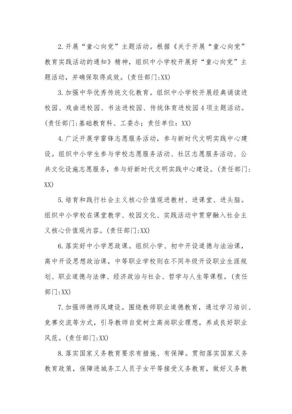 XX市教育系统创建文明城市工作方案根据市委、市政府关于在全市开展文明城市创建活动的工作要求,为切实做好全市教育系统XX年创建文明城市工作,特制订本方案。一、指导思想坚持以习近平新时代中国特色社会主义思想为指导,深入学习贯彻党的二十大和十九届历次会议精神,以立德树人为根本任务,以培育和践行社会主义核心价值观为主线,以创建文明校园、争做文明师生为抓手,按照市委、市政府的统一部署,全面提高思想认识,加强组织领导,明确创建目标,落实具体责任,全力提升教育系统广大干部师生的文明素质,深入强化未成年人思想道德建设工作,积极争创文明城市。二、领导机构为加强领导,确保创建活动扎实有效顺利进行,特组建创建文明城市工作领导小组,组成人员如下:三、工作目标任务(一)常规工作任务。1.开展“扣好人生第一粒扣子”主题活动。根据《关于开展“扣好人生第一粒扣子”主题教育实践活动方案》部署,组织中小学校开展好“传承红色基因”系列教育、中华优秀传统文化传承、学雷锋志愿服务、“劳动美”社会实践、“阳光成长”心理健康教育等“扣好人生第一粒扣子”主题活动,并确保取得成效,将未成年人思想道德建设工作引向深入。(责任部门:XX)2.开展“童心向党”主题活动。根据《关于开展“童心向党”教育实践活动的通知》精神,组织中小学校开展好“童心向党”主题活动,并确保取得成效。(责任部门:XX)3.加强中华优秀传统文化教育。组织中小学校开展经典诵读进校园、戏曲进校园、书法进校园、传统体育进校园4项主题活动。(责任部门:基础教育科、工委办;责任单位:XX)4.广泛开展学雷锋志愿服务活动,参与新时代文明实践中心建设。组织中小学生参与学校志愿服务活动、社区志愿服务活动、公共文化设施志愿服务,参与好新时代文明实践中心建设。(责任部门:XX)5.培育和践行社会主义核心价值观进教材、进课堂、进头脑。组织中小学校在课堂教学、校园文化、实践活动中贯穿融入社会主义核心价值观内容。(责任部门:XX)6.落实好中小学思政课。组织小学、初中开设道德与法治课,高中开设思想政治课,中等职业学校则在不同年级开设职业生涯规划、职业道德与法律、经济政治与社会、哲学与人生等课程。(责任部门:XX)7.加强师德师风建设。围绕教师职业道德教育,通过学习培训、竞赛交流等方式,引导教师自觉树立高尚职业理想,养成良好职业风范。(责任部门:XX)8.落实国家义务教育要求有措施、有保障。贯彻落实国家义务教育政策,保障进城务工人员子女平等接受义务教育,做好义务教育控辍保学工作。(责任部门:XX)9.实施《国家学生体质健康标准》,落实体育课程和课时安排要求。统计并计算本地实施《国家学生体质健康标准》测试并将数据上报国家数据库的学校比例;统计并计算本地参加《国家学生体质健康标准》测试以及测试合格的学生比例。(责任部门:基础教育科;责任单位XX)10.中小学校开齐开足美育课程。实施《中小学生艺术素质测评办法》,统计本地参与测评的学生比例及合格学生比例;实施《中小学校艺术教育工作自评办法》,统计本地按要求完成自评工作的学校比例。落实开齐开足美育课程要求,统计本地开齐开足美育课程的中小学校比例。实施《中小学校艺术教育发展年度报告办法》,提供本地中小学校艺术教育发展年度报告。(责任部门:教科所,基础教育科;XX)11.开展好中小学校开展劳动教育。(责任部门:XX12.做好预防中小学生沉迷网络教育引导工作,引导学生绿色上网、文明上网。(13.广泛开展文明校园创建活动,措施扎实,氛围浓厚,成效明显。14.中小学校、幼儿园加强校园安全管理有具体方案,有实际效果。出台加强校园安全管理的规范文件,落实上级有关校园安全的文件精神,就加强组织领导、开展安全教育、抓好安保工作、落实责任追究等方面提出具体措施,指导各个学校开展工作。15.开展爱国卫生运动。组织开展爱国卫生运动,加强健康教育和生命教育,引导未成年人增强讲文明、讲卫生、防疾病的意识,养成文明行为习惯和生活方式。16.规范中小学校家长委员会管理工作。加强家校联系,组织中小学校建立家长委员,开展家庭教育培训和指导服务。17.加强校外培训机构及活动管理。18....