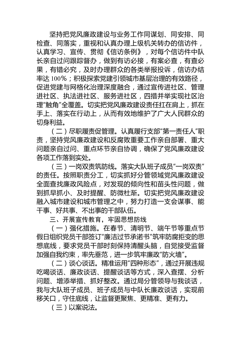 2023年上半年城市管理执法大队党风廉政建设工作情况报告上半年以来,执法大队党支部党风廉政建设工作以习近平新时代中国特色社会主义思想为指导,深入学习贯彻党的二十大精神,深刻把握坚定不移全面从严治党的战略部署要求,切实增强基层党员干部廉洁自律意识,提高拒腐防变能力,通过专题学习、参观红色教育基地、加强反腐倡廉教育、开展廉政风险点排查及防控等多种举措,扎实推进党风廉政建设。现将支部上半年工作汇报如下:一、强化政治建设,增强党员干部的政治自觉(一)加强理论学习。按照“每周一学”学习计划、党员学习教育计划,持续深化理论学习专题研讨学、党支部按期统筹学的理论学习长效机制。通过深入学习贯彻习近平新时代中国特色社会主义思想、党的二十大报告以及深入开展学习贯彻新时代中国特色社会主义思想主题教育,引导党员干部从思想上正本清源、固本培元,不断提高政治判断力、政治领悟力、政治执行力,增强“四个意识”、坚定“四个自信”、做到“两个维护”,在思想上政治上行动上同党中央保持高度一致。上半年,自制定“每周一学”学习计划以来,共组织党员、中队长集中研讨学习6次,二十大知识专题学习15次。(二)严肃政治生活。认真贯彻落实《新形势下党内政治生活若干准则》及《中国共产党党内监督条例》,坚持民主集中制,认真执行请示报告和党支部“三会一课”制度。年初我支部高质量召开了组织生活会,对照反馈意见,深入查摆问题,深刻剖析根源,认真开展批评和自我批评,形成了思想上的共识和工作的合力。(三)强化政治监督。积极支持派驻纪检组和机关纪委相关工作,主动接受监督,增强抵腐定力,涵养清风正气。树立自觉接受监督的意识,让接受监督成为政治、思想、行动自觉,善于把自律与他律结合起来,学会在“探照灯”下成长成才、干净干事,锤炼更强的党性、更实的作风,做到慎始敬终、行稳致远。(四)聚焦民生热点。通过坐席融媒体政风行风热线节目,努力构架起与广大群众交流的桥梁和纽带,现场接听群众热线电话,受理群众投诉,解决解答群众关心的城市管理领域热点问题并与听众进行互动交流,回应社会关切,做到事事有回应、件件有回音,切实转变工作作风。二、强化责任担当,落实全面从严治党主体责任(一)业务廉政两手抓。坚持把党风廉政建设与业务工作同谋划、同安排、同检查、同落实,重视和认真办理上级机关转办的信访件,认真学习、宣传、贯彻《信访条例》,对每个信访件中队长亲自过问跟踪督办,做到有访必接,有案必查,有查必果,有错必究,及时办理群众的各类举报投诉,信访办结率达100%;积极探索党建引领城市基层治理的有效路径,促进党建与网格化治理深度融合,通过宣传进社区、管理进社区、执法进社区、服务进社区,四措并举实现社区治理“触角”全覆盖。切实把党风廉政建设责任扛在肩上,抓在手上、落实在行动上,从而有效地维护了广大人民群众的切身利益。(二)尽职履责促管理。认真履行支部“第一责任人”职责,坚持党风廉政建设和反腐败重要工作亲自部署、重大问题亲自过问、重点环节亲自协调,确保了党风廉政建设各项工作落到实处。(三)一岗双责筑防线。落实大队班子成员“一岗双责”的责任。按照职责分工,切实抓好分管领域党风廉政建设全面查找廉政风险点,对发现的倾向性和苗头性问题,做到抓早抓小、及时提醒、防微杜渐。切实把党风廉政建设融入城市建设和城市管理之中,努力打造一支会谋事、能干事、好共事、不出事的干部队伍。三、开展宣传教育,牢固思想防线(一)强化措施。在春节、清明节、端午节等重点节假日组织党员干部签订“廉洁过节承诺书”筑牢防腐拒变的思想底线,要求党员干部时刻保持清醒头脑,自觉接受监督加强自我约束,率先垂范,进一步筑牢廉政“防火墙”。(二)谈心谈话。精准运用“四种形态”,通过开展违规吃喝谈话、廉政谈话、提醒谈话等方式,深入查摆、分析问题、增添举措、抓好整改。通过局分管领导与我谈话,我与大队班子成员、班子成员与中队长廉政谈话,实现前移关口,守住底线,让监督更聚焦、更精准、更有力。(三)以案说法。及时组织党员干部学习“阜阳市少数党员领导干...