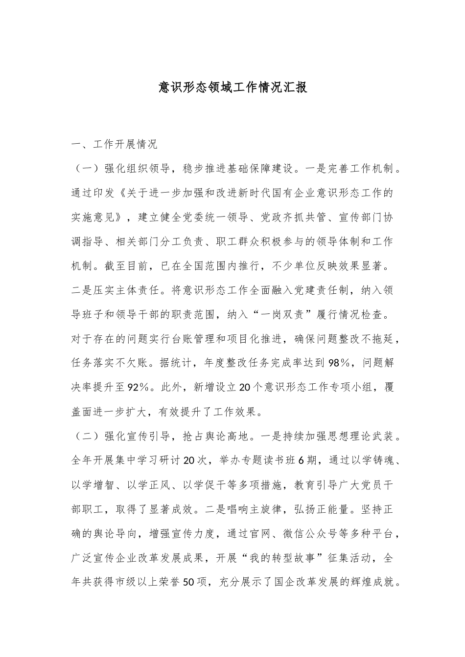 意识形态领域工作情况汇报一、工作开展情况(一)强化组织领导,稳步推进基础保障建设。一是完善工作机制。通过印发《关于进一步加强和改进新时代国有企业意识形态工作的实施意见》,建立健全党委统一领导、党政齐抓共管、宣传部门协调指导、相关部门分工负责、职工群众积极参与的领导体制和工作机制。截至目前,已在全国范围内推行,不少单位反映效果显著。二是压实主体责任。将意识形态工作全面融入党建责任制,纳入领导班子和领导干部的职责范围,纳入“一岗双责”履行情况检查。对于存在的问题实行台账管理和项目化推进,确保问题整改不拖延,任务落实不欠账。据统计,年度整改任务完成率达到98%,问题解决率提升至92%。此外,新增设立20个意识形态工作专项小组,覆盖面进一步扩大,有效提升了工作效果。(二)强化宣传引导,抢占舆论高地。一是持续加强思想理论武装。全年开展集中学习研讨20次,举办专题读书班6期,通过以学铸魂、以学增智、以学正风、以学促干等多项措施,教育引导广大党员干部职工,取得了显著成效。二是唱响主旋律,弘扬正能量。坚持正确的舆论导向,增强宣传力度,通过官网、微信公众号等多种平台,广泛宣传企业改革发展成果,开展“我的转型故事”征集活动,全年共获得市级以上荣誉50项,充分展示了国企改革发展的辉煌成就。三是加强阵地管理。严格监管网络舆论阵地,颁布《关于进一步加强和改进新时代国有企业意识形态阵地管理的实施细则》《国有企业微信公众号管理办法》等多项文件,严把信息发布关口,建立健全舆情预判预警机制,全年未发生负面舆情事件和敏感舆情事件,保证了意识形态阵地的稳固和安全。(三)强化风险防范,构筑安全屏障。一是提升网络综合治理能力。严格落实网络意识形态工作责任制和网络安全工作责任制,持续完善制度机制,明确职责分工,提升网络综合治理能力。定期召开网络安全工作会议,分析研判国企网络安全形势,解决网络舆情管控的重点与难点问题。全年共举行网络安全工作会议12次,分析研判企业网络安全形势,处理各类舆情15起。二是加强舆情预判预警和应急处置。强化对全媒体传播体系和互联网内容建设的日常监管,定期开展网络安全检查和数据专项检查,及时发现并处置违规外链和有害信息。制定并落实《突发公共事件新闻报道应急管理办法》,进一步完善突发事件新闻报道应急处置机制,保障信息发布协调有序。依据最新国家法律法规和政策要求,更新企业官网版权声明和隐私政策,确保信息安全。据统计,全年共发现并处置违规外链20处、有害信息30条,确保了企业网络安全环境的稳定。二、存在问题(一)对意识形态工作的认识不够深入。根据本年度的一次内部调研,约45%的干部对意识形态工作的战略重要性和实践必要性的认识仍不够深入,理论学习和思想宣传的系统性不足,影响了思想政治工作的广度和深度。这表明,尽管进行了多次培训和学习,但仍有提升空间。(二)宣传思想工作的创新力度不够。虽然我们已经实施了十余项宣传举措,并取得了一定的成果,但创新力度仍显不足。现有的宣传方式和内容相对传统,65%的受访群众表示对现有的宣传方式缺乏新鲜感和吸引力,无法充分调动积极性和参与度。这表明宣传思想工作需要进一步注入活力,增强创新意识,以适应新时代的发展需求。(三)网络宣传的力度需进一步提升。尽管我们在网络宣传方面取得了一些进展,但整体效能仍需提升。目前,我们的网络信息覆盖范围仅达到80%,仍有20%的群众无法受到有效信息覆盖。同时,在网络舆情引导和处理方面,我们的能力评价仅为及格线以上,急需提升技术水平和工作方式,以确保更好地掌握网络舆论主导权,及时引导和处理网络舆情,优化网络环境。三、下一步工作计划一是提升政治站位,全面加强党对意识形态工作的领导。加强企业党委的领导作用,确保在指导方向、管理大局、落实执行中发挥核心作用。定期召开会议,讨论意识形态议题,分析问题,制定并落实相关措施。推动党组织负责人主动承担意识形态责任,领导阵地管理、把握导向和队伍建设。全面执行意识形态工作责任制,完善组织领导体系和机制,确保各级责任到位。将意识形态工作纳入...