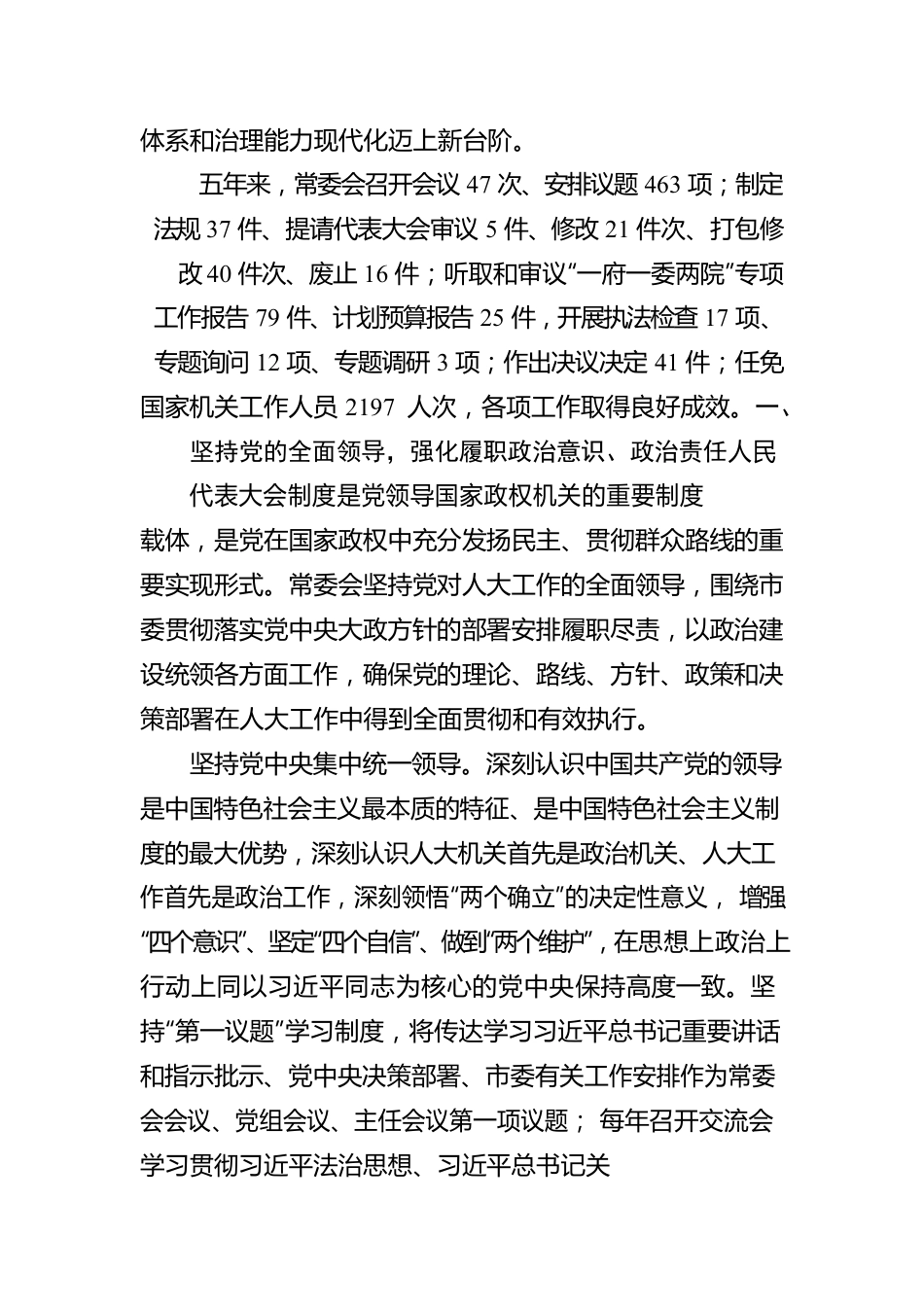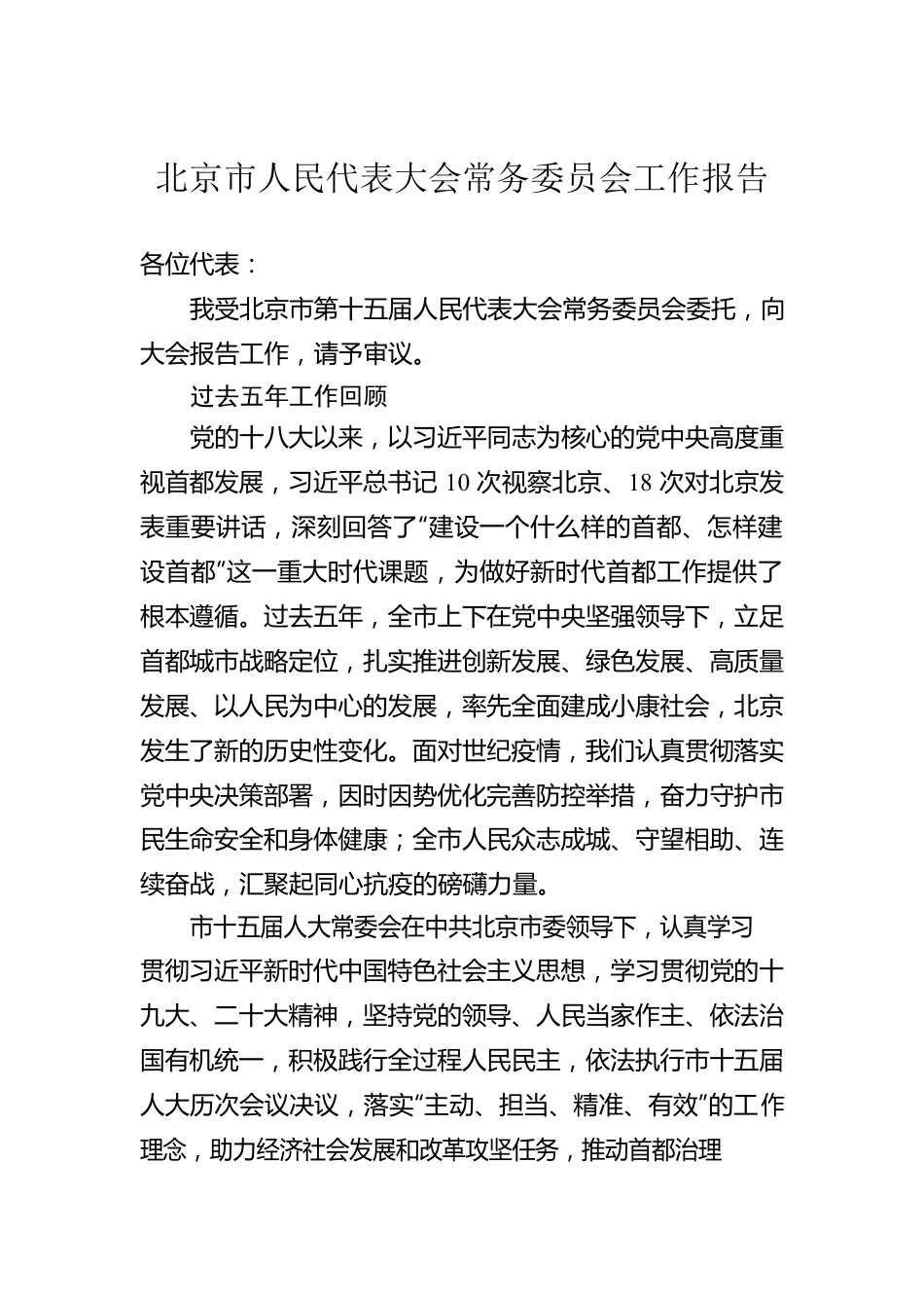 北京市人民代表大会常务委员会工作报告各位代表:我受北京市第十五届人民代表大会常务委员会委托,向大会报告工作,请予审议。过去五年工作回顾党的十八大以来,以习近平同志为核心的党中央高度重视首都发展,习近平总书记10次视察北京、18次对北京发表重要讲话,深刻回答了“建设一个什么样的首都、怎样建设首都”这一重大时代课题,为做好新时代首都工作提供了根本遵循。过去五年,全市上下在党中央坚强领导下,立足首都城市战略定位,扎实推进创新发展、绿色发展、高质量发展、以人民为中心的发展,率先全面建成小康社会,北京发生了新的历史性变化。面对世纪疫情,我们认真贯彻落实党中央决策部署,因时因势优化完善防控举措,奋力守护市民生命安全和身体健康;全市人民众志成城、守望相助、连续奋战,汇聚起同心抗疫的磅礴力量。市十五届人大常委会在中共北京市委领导下,认真学习贯彻习近平新时代中国特色社会主义思想,学习贯彻党的十九大、二十大精神,坚持党的领导、人民当家作主、依法治国有机统一,积极践行全过程人民民主,依法执行市十五届人大历次会议决议,落实“主动、担当、精准、有效”的工作理念,助力经济社会发展和改革攻坚任务,推动首都治理体系和治理能力现代化迈上新台阶。五年来,常委会召开会议47次、安排议题463项;制定法规37件、提请代表大会审议5件、修改21件次、打包修改40件次、废止16件;听取和审议“一府一委两院”专项工作报告79件、计划预算报告25件,开展执法检查17项、专题询问12项、专题调研3项;作出决议决定41件;任免国家机关工作人员2197人次,各项工作取得良好成效。一、坚持党的全面领导,强化履职政治意识、政治责任人民代表大会制度是党领导国家政权机关的重要制度载体,是党在国家政权中充分发扬民主、贯彻群众路线的重要实现形式。常委会坚持党对人大工作的全面领导,围绕市委贯彻落实党中央大政方针的部署安排履职尽责,以政治建设统领各方面工作,确保党的理论、路线、方针、政策和决策部署在人大工作中得到全面贯彻和有效执行。坚持党中央集中统一领导。深刻认识中国共产党的领导是中国特色社会主义最本质的特征、是中国特色社会主义制度的最大优势,深刻认识人大机关首先是政治机关、人大工作首先是政治工作,深刻领悟“两个确立”的决定性意义,增强“四个意识”、坚定“四个自信”、做到“两个维护”,在思想上政治上行动上同以习近平同志为核心的党中央保持高度一致。坚持“第一议题”学习制度,将传达学习习近平总书记重要讲话和指示批示、党中央决策部署、市委有关工作安排作为常委会会议、党组会议、主任会议第一项议题;每年召开交流会学习贯彻习近平法治思想、习近平总书记关于坚持和完善人民代表大会制度的重要思想、习近平总书记对北京一系列重要讲话精神;把学习党的创新理论贯穿常委会履职和机关工作始终,吃透党中央意图,以习近平新时代中国特色社会主义思想统揽和指导人大工作。全面贯彻中央人大工作会议精神,落实市委人大工作会议要求,细化分解落实任务,把党对人大工作的要求体现到履职各方面。自觉围绕中心、服务大局。围绕加强“四个中心”功能建设、提高“四个服务”水平,完善新版北京城市总规贯彻实施所需的法规、跟踪监督“一张蓝图干到底”,加快惠民、环保、弘德等方面立法,推动民生领域工作更好适应群众需求。做好新中国成立70周年、中国共产党成立100周年等重大活动服务保障工作。围绕首都改革发展,立法保障“两区”建设、基层治理等重大改革顺利推进,作出决定保障人大和政府机构改革,保障北京互联网法院和北京金融法院组建。围绕新冠病毒疫情防控,及时作出依法防控的决定,汇总公布涉疫法律法规规定,实施强化公共卫生法治保障专项立法修法计划并对有关法规开展执法检查,听取和审议疫情防控工作报告,号召人大代表、组织机关干部带头参加抗疫斗争。围绕北京冬奥会冬残奥会筹办举办,作出决定授权政府规定临时性措施,完善志愿服务、无障碍环境建设等法规,专题询问全民健身工作,为成功举办作出积极贡献。落实党的领导制度和要求。常委会党组认真履行把方向、管大局、保落实的领导职责...