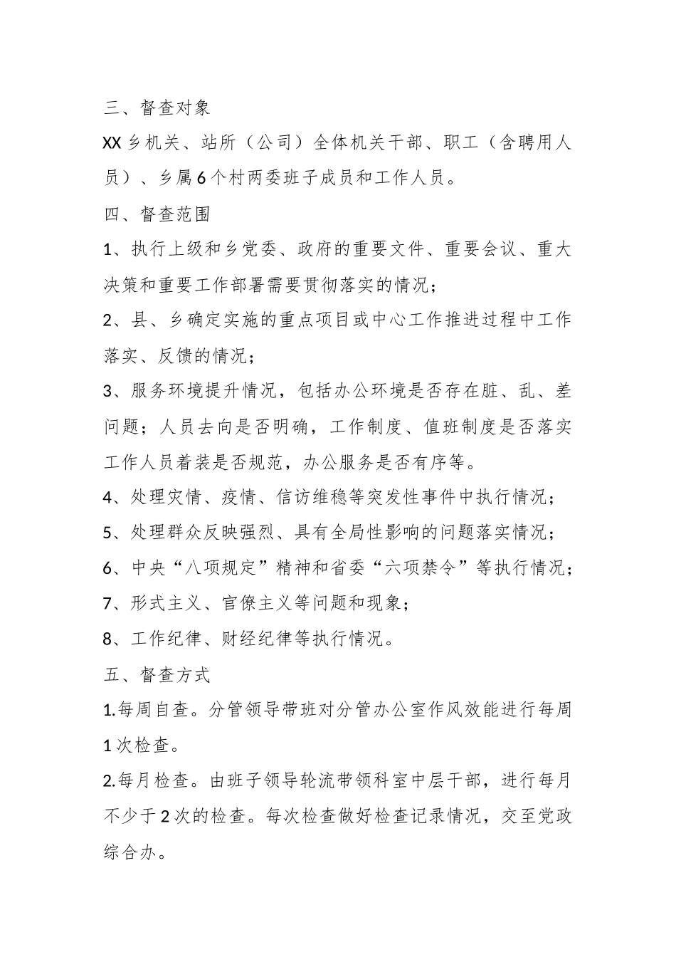 2023年关于XX乡正风肃纪检查方案为进一步加强作风效能建设,激励全乡干部进一步发扬“晒黑自己,点亮XX”的精神,加快XX乡2023年工作目标全面推进,经研究,特制定本方案。一、指导思想坚持以习近平新时代中国特色社会主义思想为指导,全面贯彻落实党的XX大精神,深入践行“两山”重要思想,严格落实中央和省市县委、纪委决策部署,持之以恒落实中央八项规定,驰而不息纠正“四风”,按照全面从严治党“主体责任”考核办法,建立效能督查常态化机制,形成正风肃纪的高压态势和效能建设齐抓共管的新局面,持续推动党员干部工作作风转变,为奋力建设现代化全域美丽新XX提供坚强保障。二、组织机构为全面、统一、高效提升全乡正风肃纪和督查工作,特成立XX乡正风肃纪工作即督查工作领导小组,成员如下:组长:副组长:成员:下设督查办公室:主任由XX担任,副主任由XXX担任,成员由XX、XXX、XXX、XXX、XXX、XXX、XXX、XXX组成。三、督查对象XX乡机关、站所(公司)全体机关干部、职工(含聘用人员)、乡属6个村两委班子成员和工作人员。四、督查范围1、执行上级和乡党委、政府的重要文件、重要会议、重大决策和重要工作部署需要贯彻落实的情况;2、县、乡确定实施的重点项目或中心工作推进过程中工作落实、反馈的情况;3、服务环境提升情况,包括办公环境是否存在脏、乱、差问题;人员去向是否明确,工作制度、值班制度是否落实工作人员着装是否规范,办公服务是否有序等。4、处理灾情、疫情、信访维稳等突发性事件中执行情况;5、处理群众反映强烈、具有全局性影响的问题落实情况;6、中央“八项规定”精神和省委“六项禁令”等执行情况;7、形式主义、官僚主义等问题和现象;8、工作纪律、财经纪律等执行情况。五、督查方式1.每周自查。分管领导带班对分管办公室作风效能进行每周1次检查。2.每月检查。由班子领导轮流带领科室中层干部,进行每月不少于2次的检查。每次检查做好检查记录情况,交至党政综合办。3.督查办督查。督查办定期和不定期对乡党委、政府年度重点工作、中心工作、上级政策要求落实情况开展专项督查。4.督查汇报。当月带班督查领导将本月督查结果及相关情况在次月的班子会议上进行简要口头或者书面说明。六、结果应用1、公务员、事业人员违反上述规定被查实的,年度考核每次扣2分,并通报批评,扣除当月基础考核奖。1年内被2次通报批评者,年度考核定为不称职(不合格),扣除部分实绩考核(具体标准另定),是中层干部的作降职处理对于情节特别严重、造成恶劣影响的查实1次可加重处罚。2、聘用人员违反上述规定的被查实的,通报批评,年度考核每次扣2分。1年内被通报批评2次者或被上级(县及以上)效能办发现查实扣除年度考核奖(上级另有新规定的按规定执行)。对于违反工作纪律情节特别严重、造成恶劣影响者,查实1次可加重处罚,直至解聘。3、村两委班子成员(含聘用干部、后备干部、强村公司工作人员)违反纪律被查实的(多人因同一事件被查实的算1次),年终班子考核每次扣总分1分,当事人通报批评;被县效能办查实1次,年终班子考核扣总分2分,当事人通报批评。1年内2次被通报者,按违反竞选承诺处理,责令辞职。对于情节严重、性质恶劣的查实1次可加重处罚,直至解职。七、本方案自发文之日起执行。