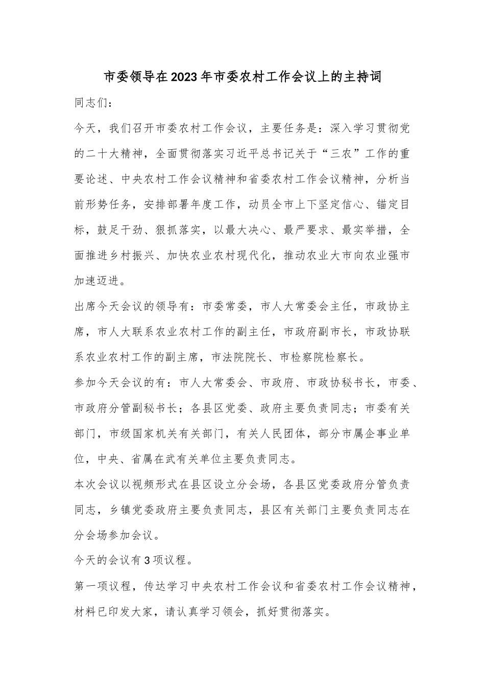 市委领导在2023年市委农村工作会议上的主持词同志们:今天,我们召开市委农村工作会议,主要任务是:深入学习贯彻党的二十大精神,全面贯彻落实习近平总书记关于“三农”工作的重要论述、中央农村工作会议精神和省委农村工作会议精神,分析当前形势任务,安排部署年度工作,动员全市上下坚定信心、锚定目标,鼓足干劲、狠抓落实,以最大决心、最严要求、最实举措,全面推进乡村振兴、加快农业农村现代化,推动农业大市向农业强市加速迈进。出席今天会议的领导有:市委常委,市人大常委会主任,市政协主席,市人大联系农业农村工作的副主任,市政府副市长,市政协联系农业农村工作的副主席,市法院院长、市检察院检察长。参加今天会议的有:市人大常委会、市政府、市政协秘书长,市委、市政府分管副秘书长;各县区党委、政府主要负责同志;市委有关部门,市级国家机关有关部门,有关人民团体,部分市属企事业单位,中央、省属在武有关单位主要负责同志。本次会议以视频形式在县区设立分会场,各县区党委政府分管负责同志,乡镇党委政府主要负责同志,县区有关部门主要负责同志在分会场参加会议。今天的会议有3项议程。第一项议程,传达学习中央农村工作会议和省委农村工作会议精神,材料已印发大家,请认真学习领会,抓好贯彻落实。第二项议程,大会交流发言。请市委常委、**区委书记**同志发言;******请**县委书记**同志发言;******请**县委书记**同志发言;******请**县委书记**同志发言;******现在,请市委书记**同志讲话,大家欢迎!******同志们,刚才传达学习了中央、省委农村工作会议精神,听取了各县区“三农”工作谋划情况汇报。*书记的讲话,全面贯彻中央和省委农村工作会议精神,站位全局、着眼长远,深刻分析了建设农业强市、加快推进农业农村现代化、全面推进乡村振兴的形势和优势,全面部署了今年和今后一段时期“三农”工作的主攻方向和发力重点,为我们抓好农业农村工作厘清了思路、谋定了方向、明确了任务,具有很强的指导性和操作性,大家一定要深入学习领会,认真抓好贯彻落实。下面,我就贯彻落实好这次会议精神特别是**书记讲话精神,提三点要求。一要提高政治站位抓落实。“三农”工作是习近平总书记念兹在兹、反复强调的国之大者,各级各部门要站在增强“四个意识”、坚定“四个自信”、做到“两个维护”的高度,深刻认识抓好新时代“三农”工作的重大意义,切实把思想和行动统一到习近平总书记重要指示批示精神和党中央决策部署上来,毫不动摇、坚定不移、持之以恒加强对“三农”工作的全面领导,努力形成“党委领导、政府负责、部门齐抓共管、全社会积极参与”的良好局面,认真抓好以乡村振兴为重心的“三农”各项工作,加快解决农业农村发展最迫切、农民群众反映最强烈的实际问题,持续保持“三农”工作良好发展态势。二要聚焦重点任务抓落实。要紧盯防止规模性返贫和保障粮食安全两大底线性任务,切实巩固拓展好脱贫攻坚成果,抓紧抓好粮食和重要农产品生产。要聚焦奶业、蔬菜、肉类、中药材等产业链,立体多面招商引资,做强做大“8+N”优势主导产业,做精质量农业,做优品牌农业,着力把**“土特产”打造成全省乃至全国的知名品牌,不断提高农业整体竞争力,加快建设农业强市。要一体推进农业现代化和农村现代化,统筹推进五大振兴,认真做好乡村发展、乡村建设、乡村治理“三篇文章”,进一步提高乡村基础设施完备度、公共服务便利度、人居环境舒适度,努力建设宜居宜业和美乡村。三要强化督促督导抓落实。农业农村、乡村振兴部门要切实履行好牵头抓总、统筹协调、督促指导的职能作用,各有关部门单位要密切配合、通力协作,确保工作落到实处。各县区要聚焦目标任务,把粮播面积、高标准农田建设、产业布局、乡村建设等重点任务,一项一项细化分解,尽快落实到乡镇、村组、地块。当前,要重点抓好春耕备耕工作,做好种子、化肥、农膜等农资供应和农业科技服务,有序推进农业生产。市委办、市政府办和农业农村部门要紧盯时间节点加大督查力度,确保底线任务“不容有失”、重点工作“见行见效”,努力推动乡村振兴取得新进展、农业农村现代化迈出新...