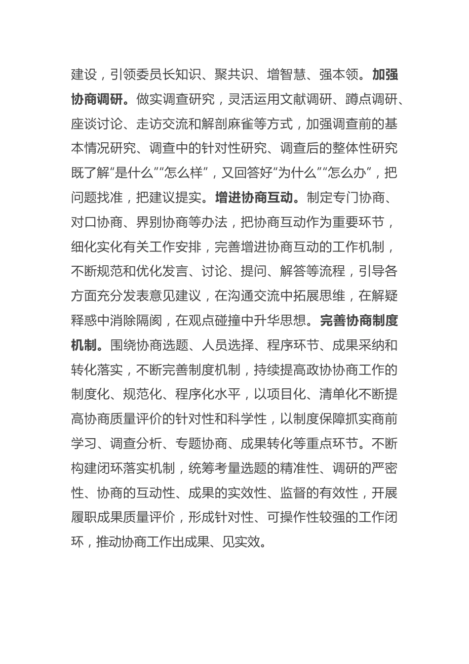在2024年全省政协系统履职尽责专题推进会上的汇报发言尊敬的各位领导,同志们:人民政协是中国人民爱国统一战线的组织,是中国共产党领导的多党合作和政治协商的重要机构,是我国政治生活中发扬社会主义民主、实践全过程人民民主的重要形式是社会主义协商民主的重要渠道和专门协商机构,是国家治理体系的重要组成部分,是具有中国特色的制度安排。为更好担负起新时代人民政协的使命任务,**市政协着力写好“专门”“专注”“专业”三篇文章,对进一步激发专门协商机构潜能和效能作了有益探索和重要尝试。写好“专门”文章,进一步搭好政协协商平台。市县政协主要工作是协商,主要工作方式是搭台。**市政协着力强化思想政治引领,加强协商调研、增进协商互动、完善协商机制,不断提升政协协商平台的质量和效能。持续强化思想政治引领。把准政治方向,坚持在党委领导下充分发挥好政协党组在政协工作中把方向、管大局、保落实的领导作用,不断增强市县政协党组织政治功能和组织功能发挥好“三个重要”作用,不断巩固团结奋斗的共同思想政治基础。开展委员读书活动,创设“委员讲堂”,推进书香政协建设,引领委员长知识、聚共识、增智慧、强本领。加强协商调研。做实调查研究,灵活运用文献调研、蹲点调研、座谈讨论、走访交流和解剖麻雀等方式,加强调查前的基本情况研究、调查中的针对性研究、调查后的整体性研究既了解“是什么”“怎么样”,又回答好“为什么”“怎么办”,把问题找准,把建议提实。增进协商互动。制定专门协商、对口协商、界别协商等办法,把协商互动作为重要环节,细化实化有关工作安排,完善增进协商互动的工作机制,不断规范和优化发言、讨论、提问、解答等流程,引导各方面充分发表意见建议,在沟通交流中拓展思维,在解疑释惑中消除隔阂,在观点碰撞中升华思想。完善协商制度机制。围绕协商选题、人员选择、程序环节、成果采纳和转化落实,不断完善制度机制,持续提高政协协商工作的制度化、规范化、程序化水平,以项目化、清单化不断提高协商质量评价的针对性和科学性,以制度保障抓实商前学习、调查分析、专题协商、成果转化等重点环节。不断构建闭环落实机制,统筹考量选题的精准性、调研的严密性、协商的互动性、成果的实效性、监督的有效性,开展履职成果质量评价,形成针对性、可操作性较强的工作闭环,推动协商工作出成果、见实效。写好“专注”文章,进一步增强协商议政实效。**市政协主动关注经济社会发展中的重要问题,准确聚焦“党政所需、群众所盼、政协所能”的工作,认真履职,久久为功,更好服务中心大局,推动履职成效从“做了什么”“做了多少”向“做出什么效果”转变。增强建言资政的实效。坚持和落实好“主席会议+专委会+界别+委员”的工作链,引导委员主动开展调研,选好题目和切入点,不断提高协商建言的前瞻性、针对性和可操作性。紧扣党委政府中心工作,自觉在全市工作大局中谋划和推进政协工作,主动关注和善于抓住全市高质量发展中的重点问题、党政决策部署落实过程中的难点问题、人民群众密切关注的堵点问题、社会各界对某项工作存有的疑点问题、党政部门暂时没有顾及的冷点问题,不断提高建言资政实效,助推党委政府的工作要求落地见效。增强凝聚共识的实效。巩固好团结协作的平台阵地,建立区域、界别、个人委员工作室,聚焦为党争取人心、汇聚力量的重要政治任务,主动密切与各族各界人士的联系交流,持续引导各族各界人士紧密地团结在党的周围。不断提高“双向发力”的工作质效,把凝聚共识贯穿各项履职工作中,以广泛共识更好促进意见建议转化,助推工作落实。增强联系服务群众的实效。发挥好市县政协组织开门是群众、出门是基层的优势,协助党委政府做好群众工作,积极服务民生事业发展。紧扣群众最关心、最直接、最现实的利益问题主动谋划履职选题,抓住增强人民获得感、幸福感、安全感的共性热点问题开展省市县三级政协联动调研协商,多建惠民之言、多献利民之策。引导委员做好联系界别群众工作,坚持和完善服务群众、反映民意、回应关切的工作闭环,**市政协制定了《关于进一步健全工作体系做好群众工作的实施意见》《...