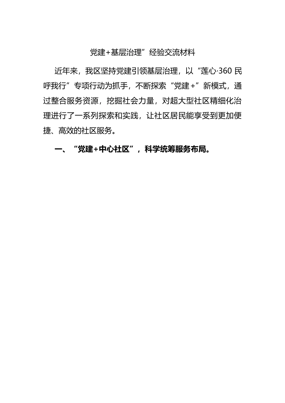 党建+基层治理”经验交流材料近年来,我区坚持党建引领基层治理,以“莲心·360民呼我行”专项行动为抓手,不断探索“党建+”新模式,通过整合服务资源,挖掘社会力量,对超大型社区精细化治理进行了一系列探索和实践,让社区居民能享受到更加便捷、高效的社区服务。一、“党建+中心社区”,科学统筹服务布局。立足实际、问需于民,积极推进“党建+中心社区”建设,辐射带动周边社区实现“活动共办、阵地共建、资源共享”。切实把“党建+中心社区”建成党建引领基层社会治理创新的“桥头堡”,近距离联系服务凝聚党员群众的主载体,不断提升群众的获得感、幸福感和满意度。坚持“区域统筹、整合资源、优势互补、共建共享”原则,建设中心社区,统筹辖区内的在职党员、物业、家委会、志愿者等多方资源实现联动。坚持“管理联席,组织共融;人员联动,责任共担;阵地联建,资源共享;实事联做,难题共解”的运行机制,做到以点带面撬动整个社区资源同时,选派优秀社区党组织书记负责中心社区日常管理、活动组织、课程安排等,为居民提供内容丰富、形式多样的服务,提升群众的满意度和幸福感,让社区更有温度。目前,全区共建成中心社区9个,今年还将再建5个。在此基础上,将中心社区建设与超大型社区拆分相结合,有效化解资源不充分、人员不足等短板。辖区红庙坡街道在原白家口社区成立白家口中心社区,将原社区拆分成两个居民社区,各下设1至2个社区工作站,在不过多增加社区层级、办公用房和人员的基础上,以中心社区统领社区工作站,带动各小区党群服务站,三个层级做到任务同部署、活动同安排、项目同落实、督导同检查,实现资源利用的最大化、群众服务的最细化、基层问题的最优解。三、“党建+红色物业”,创新优化服务模式。物业服务水平直接关系到居民生活幸福指数,**区是典型的老城区,街道下辖131个社区,老旧小区数量多,管理难度大,**区通过党建引领、物业联管、社企联动、问题联治,打造出具有**特色的“一核三联”红色物业建设新模式,提升民生福祉。在物业联管方面,**区在北院门、红庙坡、桃园路等5个街道建立“红色物业”党建联盟,将社区党组织、物业服务企业党组织、业主委员会(物业管理委员会)等纳入联盟成员,引导物业服务企业积极参与基层治理,共同做好辖区内物业服务工作。在社企联动方面制定印发《**区深化社区网格化管理的指导意见(试行)》,结合党建“邻里格”,不断夯实社区党组织基层治理核心地位,通过将物业服务企业全面纳入党建网格,吸纳物业企业相关工作人员担任网格员,探索实施社区“两委”和物业企业管理人员交叉任职等,切实强化沟通配合、增强共治合力、提升服务效能。在问题联治方面,通过物业服务联管联动,**区探索出街道社区党组织和物业服务企业良性互动机制,联合处置居民群众问题诉求。红庙坡创新推行“共享物业”模式,建成“红色物业服务中心”面积1200㎡,创立“360物业服务超市”,把物业管理服务作为商品,构建了“群众点单、超市下单、街社接单”的物业工作新模式,已累计解决物业相关的矛盾和投诉144件。下一步,我区将进一步全面加强党的建设,动员全社会力量参与基层治理,加强中心社区、智慧社区建设,统筹利用物业行业、社会组织与新兴行业加强沟通联系,构建人人有责、人人尽责、人人享有的基层治理共同体,实现共建共治共享。