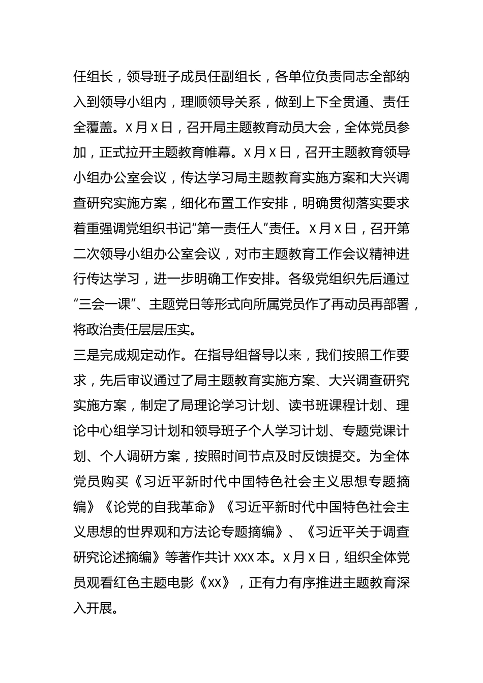 市局2023年主题教育开展情况汇报现将XXX局开展学习贯彻习近平新时代中国特色社会主义思想主题教育有关情况作一简要汇报:一、前期推进情况主题教育开展以来,局领导班子高度重视、精心谋划、大力推动,把主题教育作为贯彻落实党的二十大精神的重要抓手和今年的首要政治任务,与“四史”教育、党史学习教育常态化长效化机制贯通起来,与贯彻落实中央、市委指示要求结合起来,与高质量推进年度各项工作结合起来,与党员干部队伍建设结合起来,做到两手抓、两促进。一是凝聚思想共识。在中央和市委两级召开主题教育工作会议后,局领导班子第一时间组织中心组理论学习,传达学习习近平总书记重要讲话精神和中央、市委工作部署,明确上级要求,谋划本级方案,进一步统一了领导班子的思想认识,为开展主题教育打下良好基础。通过微信公众号,及时向全市XXX和XXX宣传主题教育相关时政和新闻;制作一期主题教育专题展板,以图文并茂的形式详细讲解主题教育的重大意义、总要求、目标任务和工作安排,营造开展主题教育的良好氛围。二是压实政治责任。成立局主题教育领导小组,由主要领导任组长,领导班子成员任副组长,各单位负责同志全部纳入到领导小组内,理顺领导关系,做到上下全贯通、责任全覆盖。X月X日,召开局主题教育动员大会,全体党员参加,正式拉开主题教育帷幕。X月X日,召开主题教育领导小组办公室会议,传达学习局主题教育实施方案和大兴调查研究实施方案,细化布置工作安排,明确贯彻落实要求着重强调党组织书记“第一责任人”责任。X月X日,召开第二次领导小组办公室会议,对市主题教育工作会议精神进行传达学习,进一步明确工作安排。各级党组织先后通过“三会一课”、主题党日等形式向所属党员作了再动员再部署,将政治责任层层压实。三是完成规定动作。在指导组督导以来,我们按照工作要求,先后审议通过了局主题教育实施方案、大兴调查研究实施方案,制定了局理论学习计划、读书班课程计划、理论中心组学习计划和领导班子个人学习计划、专题党课计划、个人调研方案,按照时间节点及时反馈提交。为全体党员购买《习近平新时代中国特色社会主义思想专题摘编》《论党的自我革命》《习近平新时代中国特色社会主义思想的世界观和方法论专题摘编》、《习近平关于调查研究论述摘编》等著作共计XXX本。X月X日,组织全体党员观看红色主题电影《XX》,正有力有序推进主题教育深入开展。二、下一步推进计划下一步,我们将按照主题教育实施方案,践行“实”的要求和“严”的标准,一体推进“学”“思”“悟”“研”“改”,以主题教育的学习成果推进XXX工作高质量发展。一是在“学”上下功夫,锻造良好学风,做到真学真懂。把读原著学原文悟原理作为主题教育的出发点和基本点,把握好、坚持好和运用好蕴含于习近平新时代中国特色社会主义思想的立场观点方法。坚持做到领导班子“领学”与领导干部“组学”相结合,处以上领导干部是此次主题教育的重点对象,我们将领导班子理论学习与处以上领导干部学习有机融合起来。采取集中授课、个人自学、交流研讨和参观考察等方式,组织一期不少于X天的处以上领导干部读书班,领导班子成员主动以上率下,大力弘扬马克思主义学风,以良好学风带动学习党的创新理论蔚然成风。坚持做到个人“自学”与集体“统学”相结合,区分职级、有侧重点地分别列出读书清单,按照“日读一文、月览一书”的形式督促党员干部加强个人自学,让学习成为一种习惯、一种自觉。运用学习强国APP、X二十大报告会、“党员驿站”等线上和线下资源,以支部为单位统一组织党员收听收看名师授课、形势报告会、红色电影等,统分结合,相得益彰。二是在“思”上下功夫,理论观照现实,做到真信真用。用好理论中心组学习扩大会,围绕“XXXX、XXXX、XXXX、XXXX”四方面专题召开理论中心组学习扩大会,每一专题由领导班子成员和各单位负责同志代表开展研讨,将学习的成果转化为思辨的成效,形成指导工作、破解难题、促进发展的理论基础和行动动力。用好青年党员学习制度,主题教育期间,将组织青年党员开展2次读书分享会,在思想交流中引导青年党员更加深刻理解把握党的百年光辉历...