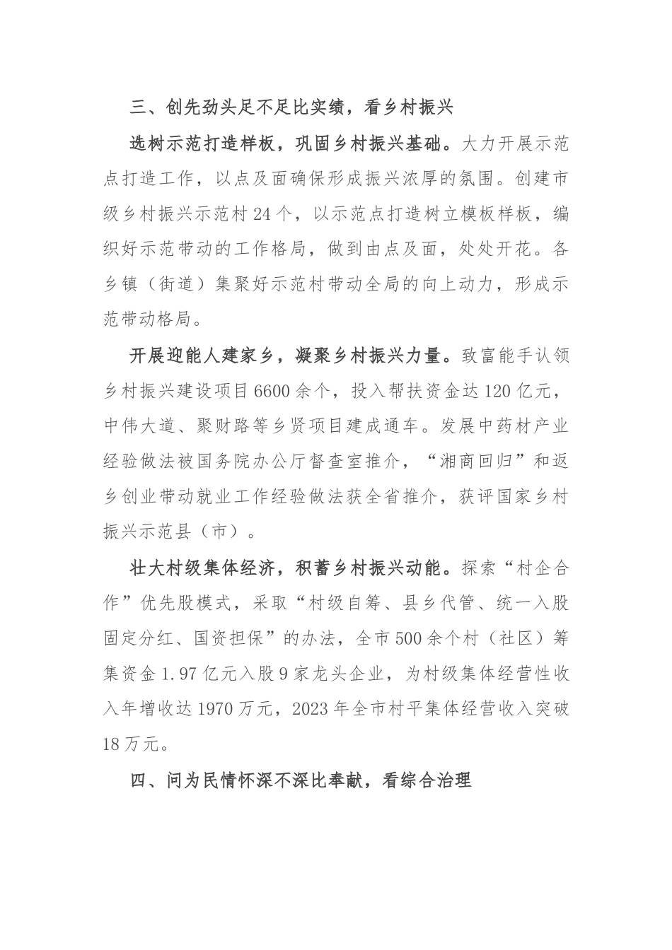 市委组织部部长在基层党建基础推进会上的交流发言近年来,我市以“五问五比五看”为抓手,多措并举大力提升党组织政治功能和组织功能,党建工作基础得到夯实,敢于斗争精神得到弘扬,为民服务情怀得到巩固,乡村振兴实绩得到体现,清廉建设效果得到凸显。一、问政治“三力”强不强比学习,看基层党建在“书香味”中修炼政治判断力。全面建好政治铸魂、赋能公开、专业实训、履职基础“四堂课”,深化拓展“小班化、拉练式”培训,精心推出“弘扬绿汀精神,根植人民情怀”等5条“一月一课一片一实践”主题党日线路,用好市乡两级党校,形成学有平台、学有所用、用而促学的良好循环。在“泥土味”中锤炼政治领悟力。坚持常态化开展党建调研,每月组织专门力量“四不两直”走乡入村,发现问题当场反馈督促整改。建立问题、整改、责任“三个清单”,做到“横向到边、纵向到底”,确保问题及时掌握办法及时研究,问题及时解决。在“实干味”中淬炼政治执行力。每季度组织开展抓党建促乡村振兴“赛马争先”示范村擂台赛,通过“晒一晒”“比一比”“评一评”,进而寻找差距、学习经验、提振信心。定期召开党建交流分析会,推进党建重点任务与党员干部担当作为“双向发力”,打造党的建设与基层治理有机融合“精品套餐”,实现政治执行力突破“1+1>2”。二、问斗争精神够不够比担当,看班子建设延伸政治考察,筑牢基层堡垒。建立软弱涣散村(社区)“常态排查+集中排查”双排查机制,常态抓好软弱涣散党组织排查整顿。实行苗头问题即时预警提示,将早研判早预警、小整改小提升作为精准治理精细管理的重要措施,把问题解决在萌芽状态和初始阶段。选优配强班子,扎牢服务底板。出台《对村(社区)“两委”干部调整实行市级备案管理办法》,实行村干部“出缺必报、凡缺必补、凡补必审、补后必备”四必制度从严把好村(社区)干部“进出关”。优先保障村级运转经费,探索建立村干部按月绩效考核、按月打卡发放新模式,全年发放考核奖励奖金400万元。培养后备力量,巩固接续力量。公开招聘社区专职后备力量40名,推动实现每万城镇常住人口拥有社区工作者18人的目标。完善村级后备力量考核机制,动态储备村级后备力量1500余人,确保关键时候“备而能用,用而必备”。为44个力量薄弱村(社区)统一配备63名专职后备力量,与村干部“同管理、同考核、同任期、同经济待遇”。三、创先劲头足不足比实绩,看乡村振兴选树示范打造样板,巩固乡村振兴基础。大力开展示范点打造工作,以点及面确保形成振兴浓厚的氛围。创建市级乡村振兴示范村24个,以示范点打造树立模板样板,编织好示范带动的工作格局,做到由点及面,处处开花。各乡镇(街道)集聚好示范村带动全局的向上动力,形成示范带动格局。开展迎能人建家乡,凝聚乡村振兴力量。致富能手认领乡村振兴建设项目6600余个,投入帮扶资金达120亿元,中伟大道、聚财路等乡贤项目建成通车。发展中药材产业经验做法被国务院办公厅督查室推介,“湘商回归”和返乡创业带动就业工作经验做法获全省推介,获评国家乡村振兴示范县(市)。壮大村级集体经济,积蓄乡村振兴动能。探索“村企合作”优先股模式,采取“村级自筹、县乡代管、统一入股固定分红、国资担保”的办法,全市500余个村(社区)筹集资金1.97亿元入股9家龙头企业,为村级集体经营性收入年增收达1970万元,2023年全市村平集体经营收入突破18万元。四、问为民情怀深不深比奉献,看综合治理以“双约双评”机制为激励,激发为民服务主动意识。在各村(社区)全面铺开“双约双评”。充分发挥“村规民约”“家庭文明公约”作为提升基层治理水平的重要抓手的作用,激活每个村(社区)、每个家庭、每个群众的活力。市财政每年统筹涉农项目资金2600余万元对“双约双评”示范村、进步村兑现奖励。以片组邻“三长制”为抓手,畅通为民服务工作方式。突出“两个优先”,动态调整邻长3006人。发放“三长制”便民服务卡30余万张,通过“发现、反映、解决、反馈、评价”问题的闭环管理,实现村民点单、代表呼应,问题解决,解决群众关心事3万余件,服务群众60余万人次。以“志愿服务活动”为媒介,厚植为民服...