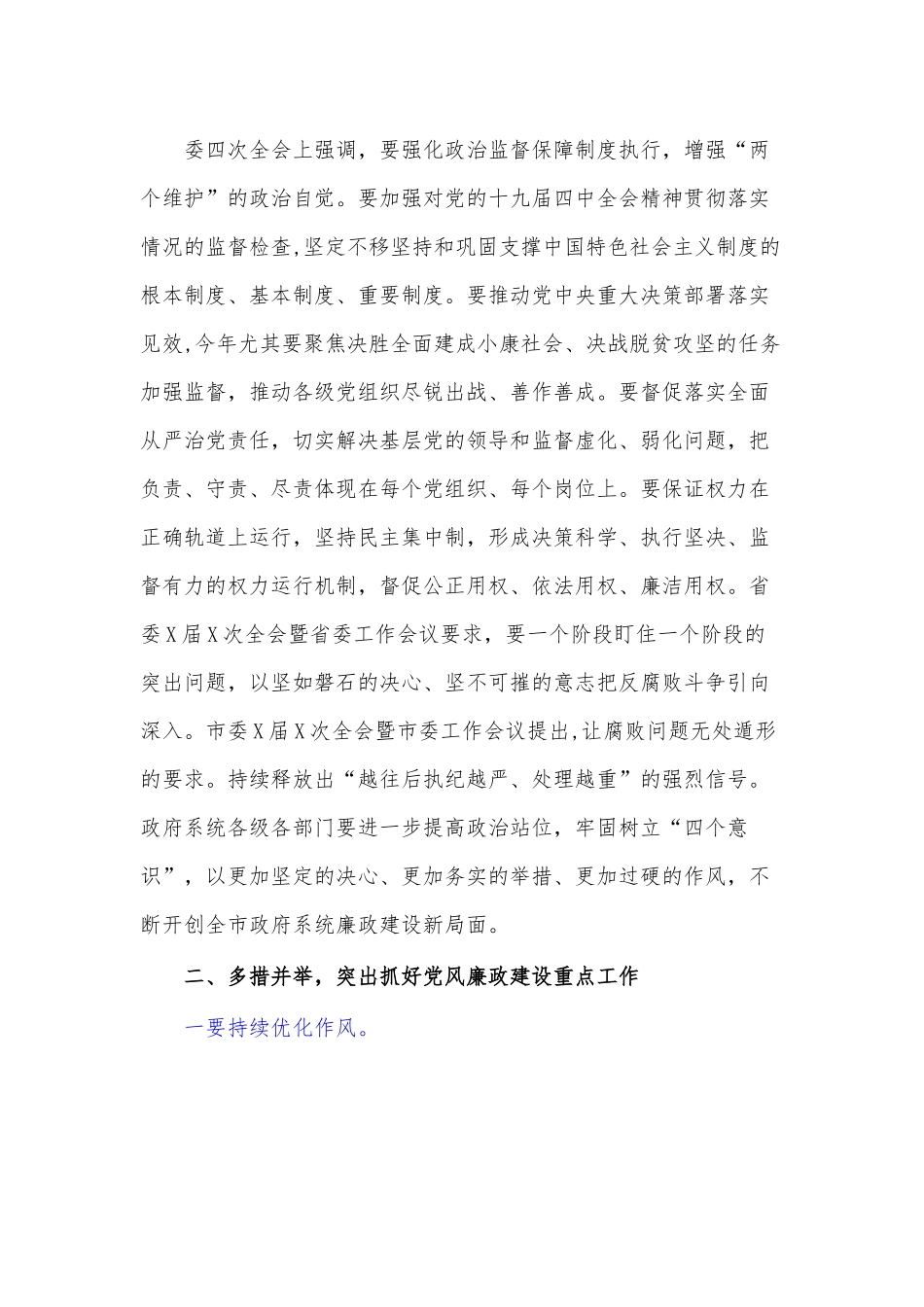 党风廉政建设工作汇报暨廉政恳谈会上的讲话同志们:按照市委要求,在这年中上下衔接之际,我们召开一次集体廉政工作会议。这个时期,既是总结上半年工作,部署下半年任务的关键时期,也是腐败问题易发、多发的特殊时期,更是检查领导干部政治素质、廉洁意识的重要关口。今天,我们召开廉政恳谈会,通过汇报交流,总结工作、查找问题,严明纪律,切实做好下半年党风廉政建设工作,推动政府系统党风廉政建设向纵深发展。下面,我谈几点意见,与大家交流共勉。一、警钟长鸣,切实增强做好政府系统党风廉政建设的责任感深入推进政府系统党风廉政建设和反腐败斗争,是新时代全面从严治党的必然要求,是推进政府治理体系和治理能力现代化的关键之举,是推动经济高质量发展的重要保障,从大家刚才汇报的情况来看,各县区政府、管委会全面落实政府系统党风廉政建设主体责任,在抓行政纪律、工作作风、简政放权、源头防腐、勤政廉政等方面,采取了有力措施,风清气正、干事创业的良好政治生态得到进一步巩固。各县区长、管委会主任切实履行了第一责任人职责,对廉政重点工作做到了亲自部署、亲自过问、亲自协调、亲自督办,对自身都能够严格要求、率先垂范,起到了组织者、践行者、引领者的作用。但要清醒认识到,党风廉政建设工作只有起点,没有终点。党的十九大报告指出,当前,反腐败斗争形势依然严峻复杂,巩固压倒性态势、夺取压倒性胜利的决心必须坚如磐石。”xxx在十九届中央纪委四次全会上强调,要强化政治监督保障制度执行,增强“两个维护”的政治自觉。要加强对党的十九届四中全会精神贯彻落实情况的监督检查,坚定不移坚持和巩固支撑中国特色社会主义制度的根本制度、基本制度、重要制度。要推动党中央重大决策部署落实见效,今年尤其要聚焦决胜全面建成小康社会、决战脱贫攻坚的任务加强监督,推动各级党组织尽锐出战、善作善成。要督促落实全面从严治党责任,切实解决基层党的领导和监督虚化、弱化问题,把负责、守责、尽责体现在每个党组织、每个岗位上。要保证权力在正确轨道上运行,坚持民主集中制,形成决策科学、执行坚决、监督有力的权力运行机制,督促公正用权、依法用权、廉洁用权。省委X届X次全会暨省委工作会议要求,要一个阶段盯住一个阶段的突出问题,以坚如磐石的决心、坚不可摧的意志把反腐败斗争引向深入。市委X届X次全会暨市委工作会议提出,让腐败问题无处遁形的要求。持续释放出“越往后执纪越严、处理越重”的强烈信号。政府系统各级各部门要进一步提高政治站位,牢固树立“四个意识”,以更加坚定的决心、更加务实的举措、更加过硬的作风,不断开创全市政府系统廉政建设新局面。二、多措并举,突出抓好党风廉政建设重点工作一要持续优化作风。严格贯彻中央八项规定及实施细则精神,全面落实省、市有关意见,驰而不息整治“四风”。要重点解决以文件落实文件、以会议落实会议、以讲话落实讲话等形式主义、官僚主义的突出问题,把主要精力用在深入调查研究、及时发现解决矛盾和问题上,用在把工作抓实抓细上,不断开拓工作新局面。要学习弘扬焦裕禄同志的“三股劲”,大力弘扬XXX精神、XXX精神、“XXX”精神,教育引导政府系统广大干部以舍我其谁的使命担当,以永不懈怠的精神状态,以埋头苦干的务实作风,努力创造新的工作业绩。要完善激励机制和容错纠错机制,为担当者担当,为实干者鼓劲,营造干事创业、竞相发展的良好氛围。二要注重源头防腐。深化“放管服”改革,加快推进“一网通办”前提下“最多跑一次”,持续放权减权、制权限权、晒权督权,切实斩断利益输送链条,构建“亲”“清”政商关系,打造一流营商环境.全面推行财政资金绩效评价制度实行财政专项资金清单管理,单独核算,专款专用,花钱必问效、无效必问责,坚决杜绝腐败行为发生。推进公共资源配置市场化改革,完善提升公共资源交易平台,规范国有资产评估、产权交易等流程,堵塞管理漏洞。健全科学民主决策制度,规范决策程序,努力提高决策科学化水平,防止滥用权力滋生腐败问题。三要强化执纪问责。突出惩治重点,加强风险防控,围绕项目建设、脱贫攻坚等重点领域,紧盯重要岗位和关键环节,开展...
