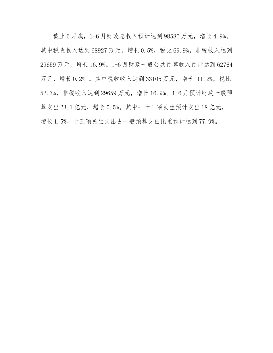 XX县财政局2022年上半年工作总结和下半年工作安排2022年上半年,县财政局深入贯彻落实习近平新时代中国特色社会主义思想和党的十九届历次全会精神,切实提高政治站位,坚决按照省、市、县“强攻二季度、确保双过半”决策部署,聚焦“强势开新局,奋勇争进位,喜迎二十大”的工作主线,围绕“奋进三项重点,促进三大提升,全力打造三区一地”的目标,坚持稳字当头、稳中求进,全面贯彻新发展理念,在抓改革、促发展、广开源、保重点等领域早部署、早落实、早发力,全力以赴推动财政工作强劲开局,确保我县财政工作勇争先,创一流。一、工作情况1.确保完成过半任务。截止5月底,全县财政总收入完成70036万元。其中:税收收入完成43927万元,税收收入占财政总收入比重62.7%;非税收入完成26109万元,增长18.0%。全县一般公共预算收入完成46282万元。其中:税收收入完成20173万元,税收收入占一般公共预算收入比重43.6%;非税收入完成26109万元(,增长18.0%。财政一般预算支出完成16.39亿元,增长1.6%。其中:十三项民生支出12.65亿元,增长4.5%,十三项民生支出占一般预算支出比重达到77.2%。截止6月底,1-6月财政总收入预计达到98586万元,增长4.9%。其中税收收入达到68927万元,增长0.5%,税比69.9%,非税收入达到29659万元,增长16.9%。1-6月财政一般公共预算收入预计达到62764万元,增长0.2%。其中税收收入达到33105万元,增长-11.2%,税比52.7%,非税收入达到29659万元,增长16.9%。1-6月预计财政一般预算支出23.1亿元,增长0.5%。其中:十三项民生预计支出18亿元,增长1.5%,十三项民生支出占一般预算支出比重预计达到77.9%。2.强势促进经济发展。一是继续落实减税降费政策,扶持实体经济发展,落实输变电产业和数字新经济的扶持政策,增强市场主体的活力和发展后劲;二是调优完善财税扶持政策,清理规范现行税费优惠政策,秉承“项目为王”的理念,完善招商合同目标与财税扶持政策激励兑现办法,快速实现“招商项目”向“财政收入”的转化;三是加速培育新兴财源,以数字经济为导向,加大产业项目升级改造财税扶持力度;四是大力推动工业三年倍增行动,增强工业扶持力度,提升财税专班服务质量,继续优化网上“一窗式”通办服务流程,大力营造良好的营商环境;五是深入推进国资国企“三年”改革行动,开展资产资源清查,盘活现有资产资源,推行国企薪酬制度和激励机制改革,提升国企资质和国有资产市场化运营水平,确保国有资产资源保值增值。3.全力做大财政“蛋糕”。一是加大财政统筹力度,聚焦财税目标,强化财税调度,盘活土地资源,加大土地出让金清收力度,盘活存量资金,对单位公用经费、项目结余和一年以上的项目结转资金,除已启动的项目外,一律收回政府统筹安排使用,同时加大非税收入统筹力度,实行非税收支彻底脱钩,除非税成本性支出外,全部纳入政府可安排预算的资金来源,由政府统筹安排使用;二是争取项目上级扶持,紧跟国家省市政策导向,围绕“两新一重”,补短板强弱项安排储备项目,紧盯事关乡村振兴、生态环保、特色产业、民生改善、疫情防控等重点项目,紧密跟踪、研判、抢抓国家省市政策机遇,完善跑项争资激励机制,加大向上争资扶持力度;三是争取专项债券资金,按照“资金跟着项目走”原则,优化项目选择,完善项目储备,做好项目申报对接,同时加快项目实施,确保债券项目“争得到、用得好”。4.坚决兜牢“三保”底线。一是突出保障重点支出,优先足额安排“三保”和偿还债务等急需、刚性支出,今年新增普调工资、绩效奖金和基本民生等资金足额安排预算,不留缺口;二是坚持党政机关过紧日子要求,从严控制一般性支出,不得擅自扩大支出范围、提高开支标准,今年我县人均定额公用经费在上年基础上节减0.2万元,“三公”经费继续只减不增,项目经费减压10%以上;三是硬化预算约束,实行项目预算分资金来源管理,坚持先有预算后有支出,从严从紧控制预算追加,严禁超预算、无预算安排支出。5.持续深化财政改革。一是全面实行零基预算改革,今年起我县扩大到全县所有预算单位,同时将教育医疗收费纳入财政专户管理,树立“先谋事后排钱”的项目预算...