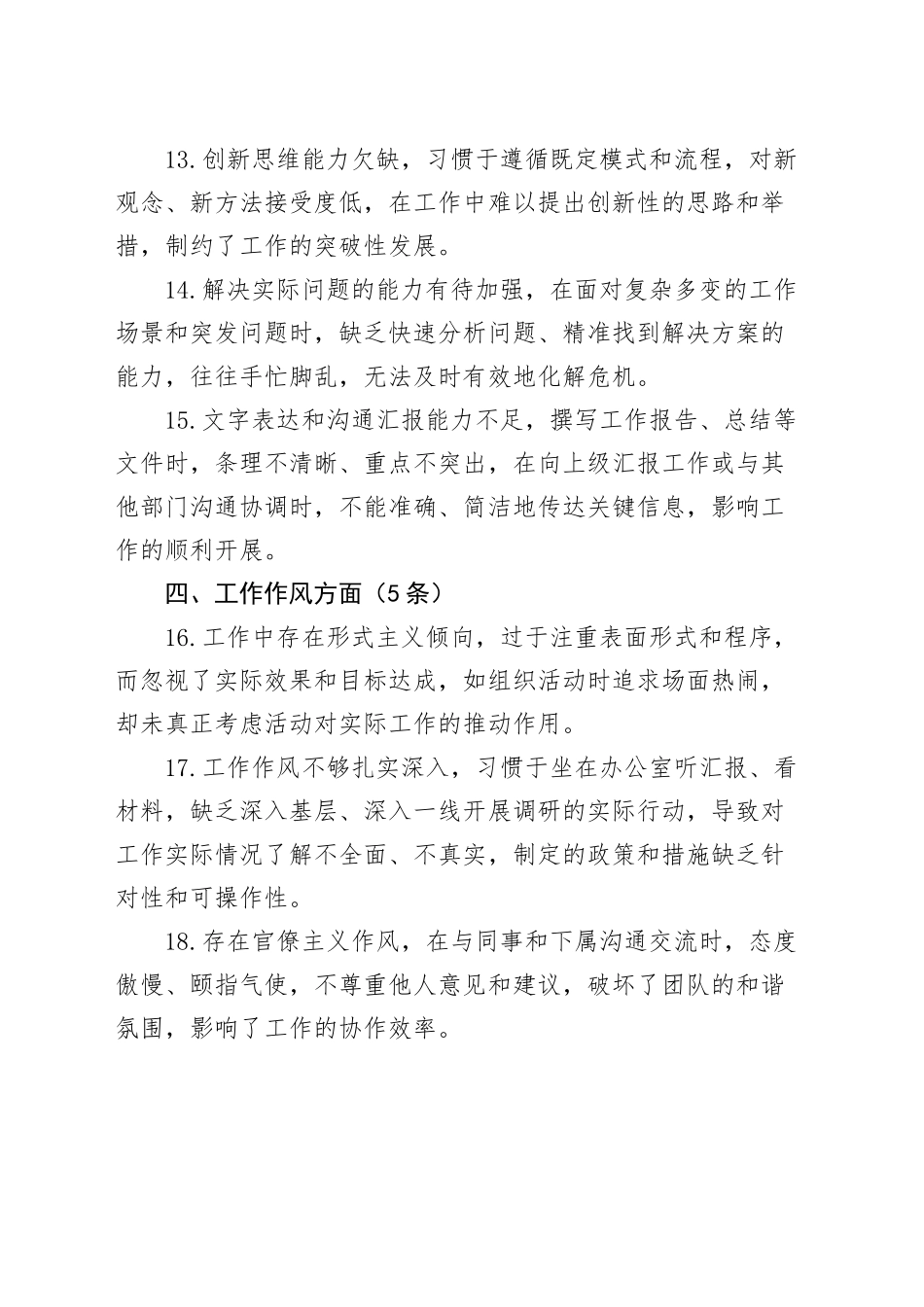 组织生活会、民主生活会自我批评和相互批评意见建议(50条,个人问题清单)一、政治思想方面(5条)1.政治理论学习深度不够,对习近平新时代中国特色社会主义思想的理解停留在文字表面,缺乏系统性深入钻研,未能充分结合实际工作思考运用,在贯彻落实党的方针政策时存在一定的滞后性。2.政治敏锐性有待提高,对一些潜在的政治风险和意识形态问题洞察力不足,在面对复杂多变的社会舆论环境时,缺乏主动引导和正面回应的意识与能力。3.对党中央决策部署的执行存在打折扣现象,有时会因地方实际情况或个人主观判断,选择性执行部分内容,而未从全局高度完整、准确地落实各项任务要求。4.在党内政治生活中,批评与自我批评不够深刻,存在避重就轻、走过场的情况,对自身和他人的政治思想问题未能深挖根源,红脸出汗效果不明显,不利于党内政治生态的净化。5.政治站位不够高,在谋划工作和处理问题时,更多从本部门、本地区利益出发,缺乏从党和国家事业发展全局统筹考虑的宏观视野,大局意识有待增强。二、工作态度方面(5条)6.工作积极性和主动性欠缺,习惯于等待上级指示和安排,缺乏主动发现问题、解决问题的担当精神,对工作中的新情况、新挑战反应迟缓,常常错失先机。7.对待工作存在敷衍了事的态度,在完成一些常规任务时,不注重细节和质量,只求过得去,不求过得硬,导致工作成果粗糙,难以经受检验。8.工作中存在拖延现象,对于一些重要但不紧急的任务,缺乏合理规划和时间管理,总是临近截止日期才匆忙着手,影响工作效率和质量,也增加了出错的风险。9.对工作的责任心不强,在负责项目或任务时,未能全过程跟踪把控,出现问题后不能及时有效地采取补救措施,而是推诿责任,导致问题得不到及时解决,影响整体工作进展。10.面对工作中的困难和压力,容易产生消极情绪,缺乏攻坚克难的勇气和毅力,不是积极寻找解决办法,而是抱怨外部条件,降低了团队的工作士气。三、工作能力方面(5条)11.业务能力提升缓慢,对新知识、新技能的学习积极性不高,在行业快速发展、技术不断更新的背景下,仍依赖传统方法和经验开展工作,难以适应新的工作要求和挑战。12.工作统筹协调能力不足,在涉及多部门、多环节的复杂工作中,不能有效整合资源、合理分配任务,导致工作进度不一、协同性差,整体效率低下。13.创新思维能力欠缺,习惯于遵循既定模式和流程,对新观念、新方法接受度低,在工作中难以提出创新性的思路和举措,制约了工作的突破性发展。14.解决实际问题的能力有待加强,在面对复杂多变的工作场景和突发问题时,缺乏快速分析问题、精准找到解决方案的能力,往往手忙脚乱,无法及时有效地化解危机。15.文字表达和沟通汇报能力不足,撰写工作报告、总结等文件时,条理不清晰、重点不突出,在向上级汇报工作或与其他部门沟通协调时,不能准确、简洁地传达关键信息,影响工作的顺利开展。四、工作作风方面(5条)16.工作中存在形式主义倾向,过于注重表面形式和程序,而忽视了实际效果和目标达成,如组织活动时追求场面热闹,却未真正考虑活动对实际工作的推动作用。17.工作作风不够扎实深入,习惯于坐在办公室听汇报、看材料,缺乏深入基层、深入一线开展调研的实际行动,导致对工作实际情况了解不全面、不真实,制定的政策和措施缺乏针对性和可操作性。18.存在官僚主义作风,在与同事和下属沟通交流时,态度傲慢、颐指气使,不尊重他人意见和建议,破坏了团队的和谐氛围,影响了工作的协作效率。19.工作中急功近利,为了追求短期政绩,采取一些不切实际的做法,忽视了工作的长远发展和可持续性,对组织的长期稳定发展造成潜在风险。20.对工作纪律执行不够严格,存在迟到早退、违反会议纪律等现象,自身未能以身作则,也未对身边人员进行有效监督和管理,损害了组织的纪律性和严肃性。五、担当作为方面(5条)21.担当精神不足,在面对艰巨任务和复杂问题时,存在畏难情绪,不敢主动请缨、迎难而上,而是退缩回避,将问题上交或等待他人解决,错失解决问题的最佳时机。22.在工作中怕得罪人,对于一些违规违纪行为和不良现象,不敢坚决予以制止和纠正,存在“老好人”思想,导致制...