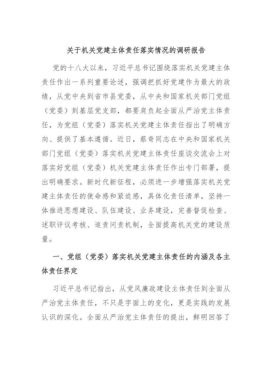 关于机关党建主体责任落实情况的调研报告党的十八大以来,习近平总书记围绕落实机关党建主体责任作出一系列重要论述,强调把抓好党建作为最大的政绩,从党中央到省市县党委,从中央和国家机关部门党组(党委)到基层党支部,都要肩负起全面从严治党主体责任,为党组(党委)落实机关党建主体责任指出了明确方向、提供了基本遵循。近日,蔡奇同志在中央和国家机关部门党组(党委)落实机关党建主体责任座谈交流会上对落实好党组(党委)机关党建主体责任作出专门部署,提出明确要求。新时代新征程,必须进一步增强落实机关党建主体责任的使命感和紧迫感,具体化责任清单,坚持一体推进思想建设、队伍建设、业务建设,完善督促检查、述职评议考核、追责问责机制,全面提高机关党的建设质量。一、党组(党委)落实机关党建主体责任的内涵及各主体责任界定习近平总书记指出,从党风廉政建设主体责任到全面从严治党主体责任,不只是字面上的变化,更是实践的发展认识的深化。全面从严治党主体责任的提出,鲜明回答了全面从严治党谁来抓、谁来负责、谁是第一责任人的重大问题,对于与时俱进加强党的建设具有重大意义。(一)党组(党委)落实机关党建主体责任的内涵。党的十八大以来,随着机关党建领域一系列党内法规和规范性文件接连出台,党组(党委)落实全面从严治党主体责任的内涵得以逐步明确。2015年,中共中央印发《中国共产党党组工作条例(试行)》,提出党组应当认真履行党要管党、从严治党责任,加强对本单位党的建设的领导,落实党建工作责任制。党的十九大党章首次明确党组“领导机关和直属单位党组织的工作”。2019年,中共中央印发《关于加强和改进中央和国家机关党的建设的意见》,提出“部门党组(党委)要认真履行全面从严治党主体责任”。同年召开党的历史上首次中央和国家机关党的建设工作会议,修订党组工作条例和机关基层组织工作条例,进一步细化党组(党委)承担的机关党建责任。2020年,中央办公厅印发《党委(党组)落实全面从严治党主体责任规定》,明确党委(党组)加强对本单位(本系统)全面从严治党各项工作领导11个方面的责任内容。课题组认为,落实机关党建主体责任是全面从严治党对部门党组(党委)提出的职责要求,具有鲜明的政治性、时代性和原则性,其中的“主体”指部门党组(党委)和全体成员“责任”指党组(党委)责任、党组(党委)书记第一责任、领导班子其他成员职责范围内领导责任等。(二)新时代机关党建各主体及责任界定。随着新时代机关党建领导体制不断完善,党的建设工作领导小组、党组(党委)、机关工委、机关党委、机关纪委等机关党建主体的职责定位与相互关系更加明确,形成了各司其职、相互衔接的工作格局。1.党的建设工作领导小组。党的建设工作领导小组是党委抓全面从严治党的议事协调机构。就机关党建主体责任而言,党的建设工作领导小组负责指导和协调其他机构配合党组(党委)落实机关党建主体责任,定期听取有关工作汇报,及时研究解决重大问题。2.部门党组(党委)及成员。党组(党委)是党对非党组织实施领导的重要组织形式,履行全面从严治党责任。党组(党委)应结合实际制定责任清单,具体明确党组(党委)及其书记和其他成员承担的全面从严治党责任。党组(党委)书记应当履行机关党建第一责任人职责。党组(党委)其他成员按照“一岗双责”要求抓好职责范围内机关党建工作。3.机关工委。机关工委作为党委派出机构,统一领导所属机关党的工作,指导督促各部门党组(党委)落实机关党建主体责任。机关工委与党组(党委)之间,既是“统一领导”和“具体领导”的关系,又是“指导督促”和“支持配合”的关系。对机关工委来说,统一领导,是指针对机关党建的总体情况,制定统一标准,提出统一要求从宏观和整体角度指导党建工作;指导督促,主要体现为落实机关党建主体责任,既可以是日常性的指导督促,也可以是专项指导督促。对党组(党委)来说,具体领导,是指针对某个机关党建的个体状况,结合实际落实统一要求;支持配合,是指配合机关工委对本单位党的工作的统一领导。4.机关党委。机关党委是部门机关党建工作的...