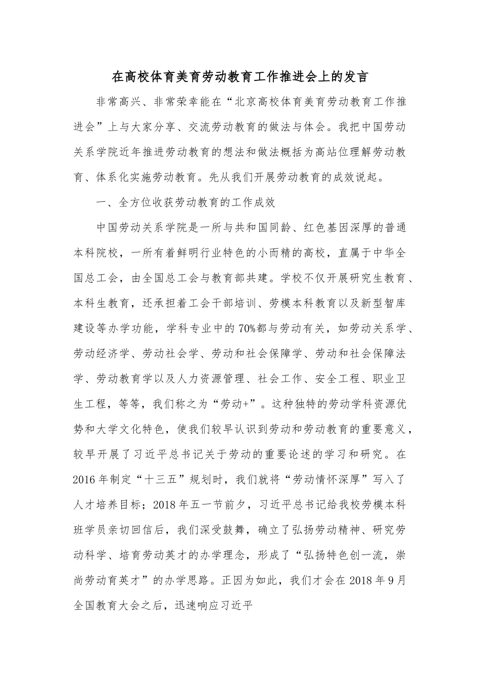 在高校体育美育劳动教育工作推进会上的发言非常高兴、非常荣幸能在“北京高校体育美育劳动教育工作推进会”上与大家分享、交流劳动教育的做法与体会。我把中国劳动关系学院近年推进劳动教育的想法和做法概括为高站位理解劳动教育、体系化实施劳动教育。先从我们开展劳动教育的成效说起。一、全方位收获劳动教育的工作成效中国劳动关系学院是一所与共和国同龄、红色基因深厚的普通本科院校,一所有着鲜明行业特色的小而精的高校,直属于中华全国总工会,由全国总工会与教育部共建。学校不仅开展研究生教育、本科生教育,还承担着工会干部培训、劳模本科教育以及新型智库建设等办学功能,学科专业中的70%都与劳动有关,如劳动关系学、劳动经济学、劳动社会学、劳动和社会保障学、劳动和社会保障法学、劳动教育学以及人力资源管理、社会工作、安全工程、职业卫生工程,等等,我们称之为“劳动+”。这种独特的劳动学科资源优势和大学文化特色,使我们较早认识到劳动和劳动教育的重要意义,较早开展了习近平总书记关于劳动的重要论述的学习和研究。在2016年制定“十三五”规划时,我们就将“劳动情怀深厚”写入了人才培养目标;2018年五一节前夕,习近平总书记给我校劳模本科班学员亲切回信后,我们深受鼓舞,确立了弘扬劳动精神、研究劳动科学、培育劳动英才的办学理念,形成了“弘扬特色创一流,崇尚劳动育英才”的办学思路。正因为如此,我们才会在2018年9月全国教育大会之后,迅速响应习近平总书记关于加强大中小学劳动教育的号召,迅速参与到中央和教育部劳动教育的重要文件的起草当中,迅速推出一批大中小学劳动教育的学术研究和智库成果,迅速探索和部署本校的劳动教育实施。学校这几年深入推进劳动教育,带来了诸多可喜的收获,也推动学校的特色强校战略进入一个新的阶段。一是劳动教育育人效果突出。***年初,一项关于全国大学生劳动素养的调查特邀我校参加,调查显示,我校大四学生在劳动认知、情感、意志、行为等各方面的表现明显高于北京地区其他高校,而且大学四年的发展曲线整体是呈上升趋势的,没有出现高校容易出现的“大三”低谷期现象。用人单位总体认为,我校毕业生普遍态度认真、做事扎实、吃苦耐劳,很多毕业生到基层能下得去、用得上、留得住,成长为骨干人才。学校曾获得北京高校毕业生就业工作先进单位、大学生志愿服务西部计划考核优秀高校,连续五年被评为北京市征兵工作先进单位;培养出青海省脱贫攻坚工作“先进个人”赵军章、“中央企业抗击新冠肺炎疫情先进个人”蒋敏等一大批就业模范。二是教学科研成果产出丰硕。近5年我校教师团队发表劳动教育领域论文百余篇,其中在《教育研究》《中国高教研究》等核心期刊发文50余篇。中国知网最新统计,从全国教育大会到今年10月,我校教师的劳动教育发文总量与西南大学并列第一,是前10名的高校中唯一一个非师范类院校;在被引率最高的10篇论文中,我校教师占了3篇。同时,我校教师向全总、教育部等提交的多篇智库报告,得到了领导批示或被采纳。三是学科专业建设取得明显进展。20**年,我们在我校公共管理专业学位硕士点开办了全国首个劳动教育管理研究生项目;2021年,我们又成功申办了全国首批劳动教育本科专业,今年9月,首届35名劳动教育本科生全部报到入学。学校教师立项的国家级和省部级劳动教育课题、组织编写的劳动教育教材也较为丰富;我们还牵头发起成立了中国高等教育学会劳动教育专业委员会、教育部“劳动教育与劳动实践课程”虚拟教研室,创办国内首家劳动教育专门刊物《劳动教育评论》,发起主办全国大中小学劳动教育峰会,打造了多个引领新时代劳动教育的全国性学术平台。四是社会影响力得到显著提升。我校作为高校组组长单位深度参与中央《意见》和教育部《指导纲要》的研制,多位专家被选聘为教育部新一轮教育教学审核评估中的劳动教育评估专家。中央广播电视总台、中国教育电视台、《人民日报》、《光明日报》、《中国教育报》等重要媒体、报刊均报道过我校劳动教育的观点和经验。近年来,学校本科专业在各地超重点线录取率连年提升,也从侧面反映出我校社会影响力的显著提升。二、高站位理解劳...