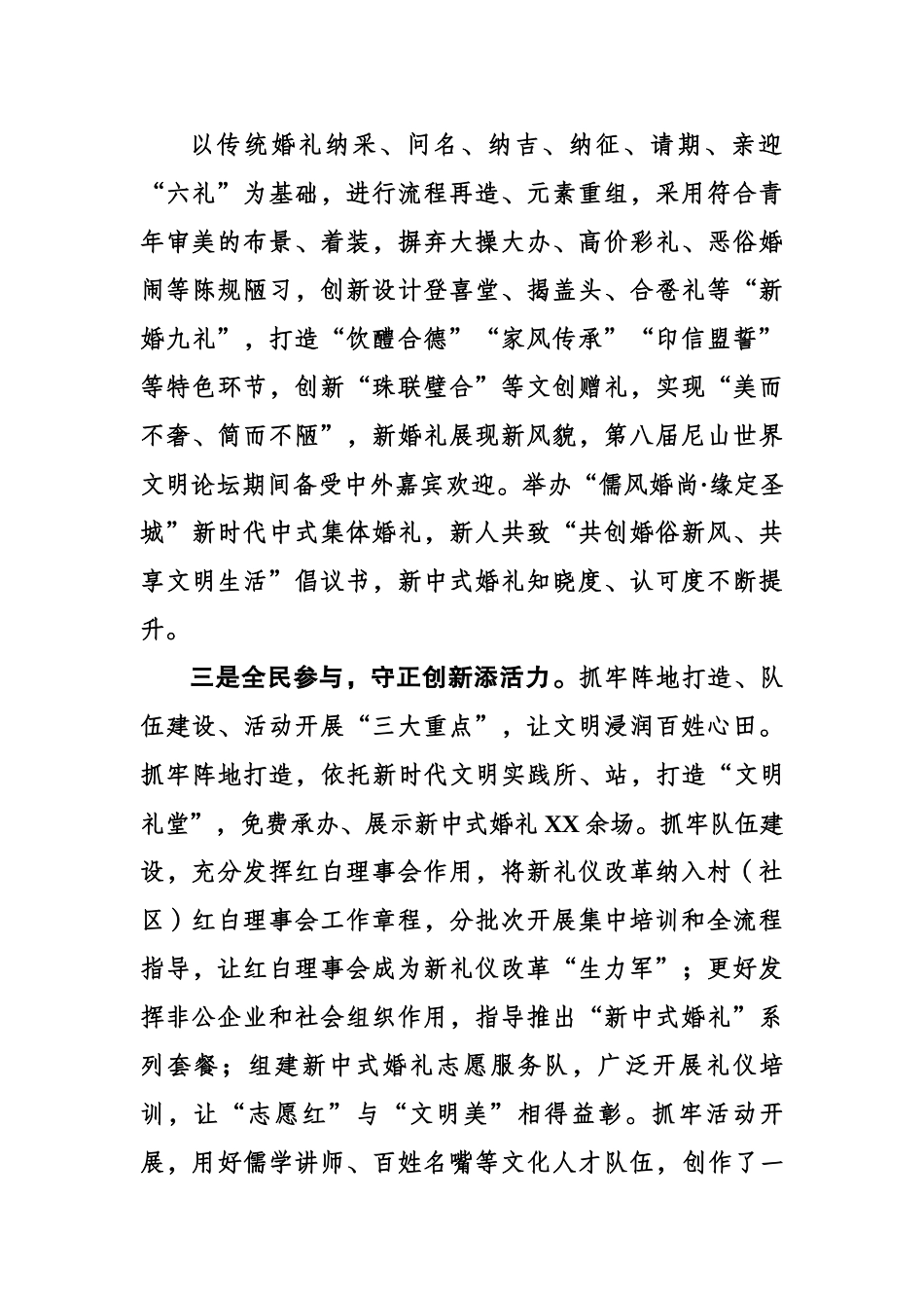 新中式婚礼弘扬文明新风尚婚礼是中华优秀传统文化的重要组成部分,传承弘扬传统婚俗文化,是深化文化“两创”的重要抓手,也是推动移风易俗的具体实践。XX县以周制、汉制古典婚礼为基础,围绕“喜庆祥和、节俭绿色、教化育人、弘扬新风”理念,设计推广新中式婚礼,用新婚礼弘扬新风尚。一是高点定位,齐抓共管聚合力。紧紧围绕践行社会主义核心价值观、弘扬中华优秀传统文化、倡树美德健康新生活目标定位,统筹推进“婚学节寿丧”新礼仪改革。成立县委书记任组长的新礼仪改革工作专班,与新时代文明实践、文化“两创”一体推进,建立了县委宣传部、县文明办、县民政局等部门单位共同参与的联席制度,形成了“党委政府领导、部门分工负责,上下联动、齐抓共管”的工作格局。多次邀请中国人民大学、山东大学、XX师范大学、孔子研究院等高校和研究机构的专家学者开展调研论证,召开工作座谈会XX次。首批选取鲁XX村、武X村等文化“两创”示范点开展新中式婚礼试点,不断完善设计方案,以点带面,持续推动婚礼改革落地落实。二是文化浸润,成风化俗增效力。深入挖掘传统婚礼蕴含的亲慈子孝、夫妻恩爱、敦亲睦邻等文化内涵,突出简约、适度、理性原则,让传统美德得到充分彰显。以传统婚礼纳采、问名、纳吉、纳征、请期、亲迎“六礼”为基础,进行流程再造、元素重组,采用符合青年审美的布景、着装,摒弃大操大办、高价彩礼、恶俗婚闹等陈规陋习,创新设计登喜堂、揭盖头、合卺礼等“新婚九礼”,打造“饮醴合德”“家风传承”“印信盟誓”等特色环节,创新“珠联璧合”等文创赠礼,实现“美而不奢、简而不陋”,新婚礼展现新风貌,第八届尼山世界文明论坛期间备受中外嘉宾欢迎。举办“儒风婚尚·缘定圣城”新时代中式集体婚礼,新人共致“共创婚俗新风、共享文明生活”倡议书,新中式婚礼知晓度、认可度不断提升。三是全民参与,守正创新添活力。抓牢阵地打造、队伍建设、活动开展“三大重点”,让文明浸润百姓心田。抓牢阵地打造,依托新时代文明实践所、站,打造“文明礼堂”,免费承办、展示新中式婚礼XX余场。抓牢队伍建设,充分发挥红白理事会作用,将新礼仪改革纳入村(社区)红白理事会工作章程,分批次开展集中培训和全流程指导,让红白理事会成为新礼仪改革“生力军”;更好发挥非公企业和社会组织作用,指导推出“新中式婚礼”系列套餐;组建新中式婚礼志愿服务队,广泛开展礼仪培训,让“志愿红”与“文明美”相得益彰。抓牢活动开展,用好儒学讲师、百姓名嘴等文化人才队伍,创作了一批快板、三句半等文艺作品,引导群众“知礼懂礼”;常态化开展“好媳妇”“好婆婆”“好岳母”等评选,鼓励群众“习礼明礼”;推广“山盟海誓·礼约圣城”集体颁证仪式,创新“支部书记致贺词”等措施,签订《婚事新办倡议书》,推动群众“达礼用礼”。
